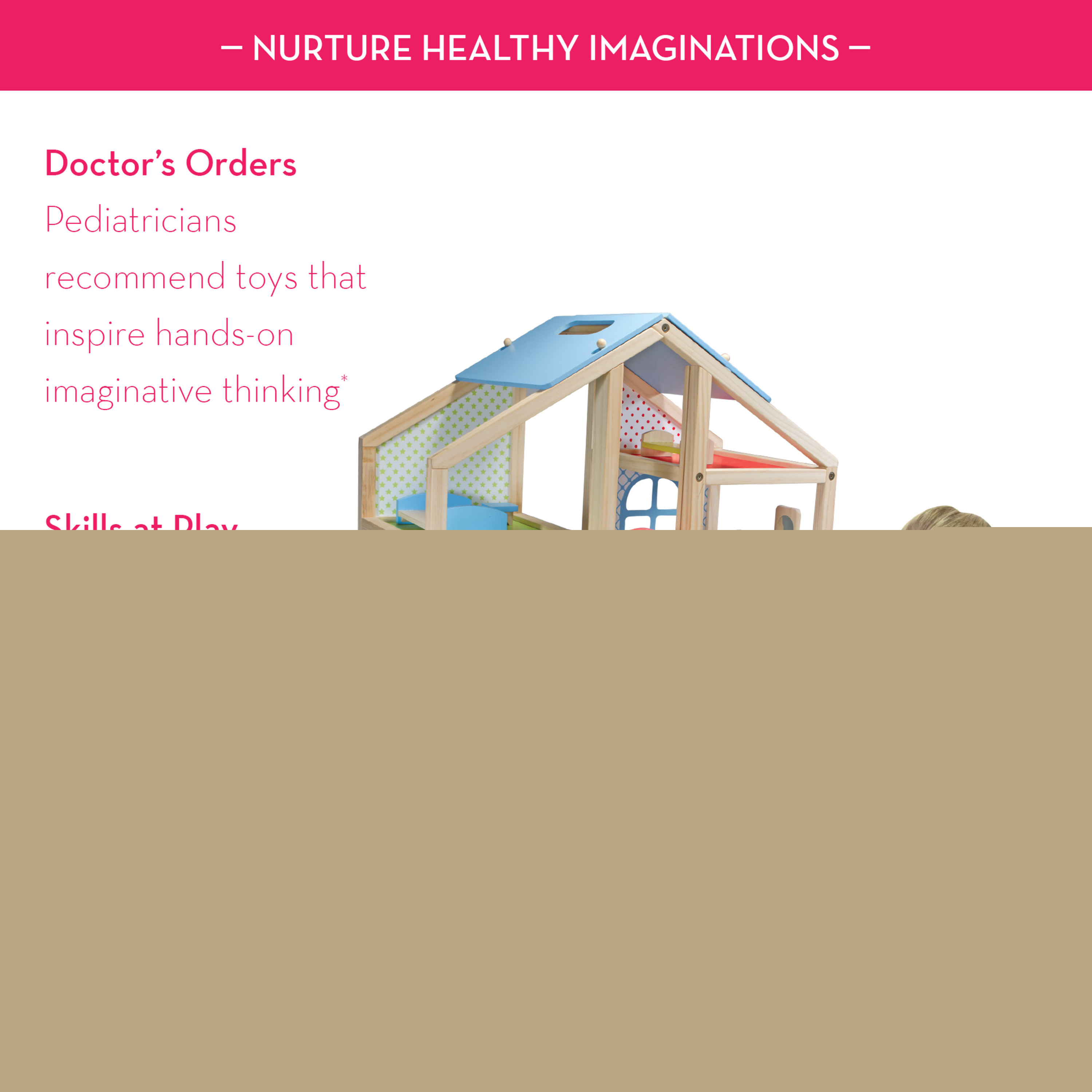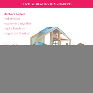 Going up Suitable for all 1:12-scale dolls, our newest play house invites pretend-play families to pull into the garage, ride in the elevator, and feel right at home in this modern home. Fresh, gender-neutral colors and patterns add a lively edge to the natural-wood frame, and open sides make it easy to access every room with ease–so it’s easy to share the fun with brothers, sisters, and friends! Comes with three play people and 15 pieces of furniture. Also available: Road Trip! Car & Pose-able Passengers Set, custom made to fit the ground-floor garage perfectly.