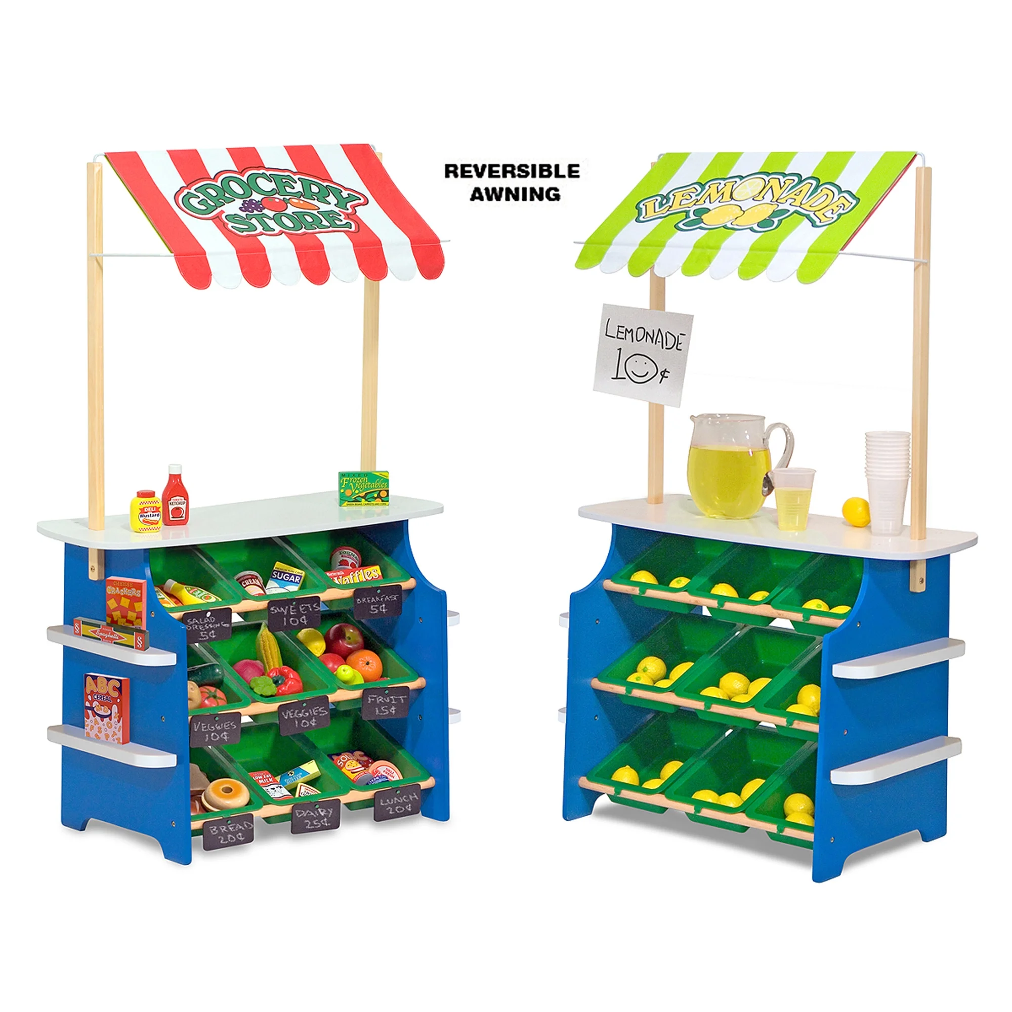 Wooden play center performs double duty as both a grocery store and lemonade stand Flip the awning to let customers know what you’re selling today Portable plastic bins for pretend shopping or storage Sturdy wood construction and easy assembly Makes a great gift for girls and boys, ages 3 to 6, for hands-on, screen-free play