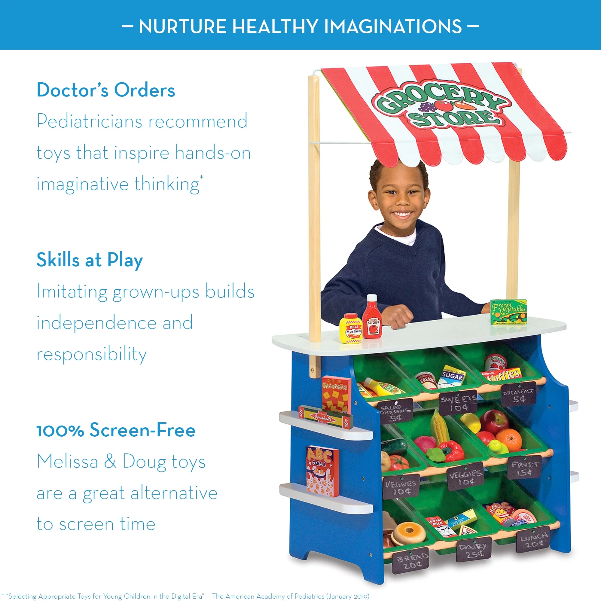 Whatever the season or weather, this wooden play center has the shop for you! The Melissa & Doug Grocery Store/Lemonade Stand is a double-duty wooden playset for kids. It serves as a grocery store or a lemonade stand with a simple flip of the awning. The playset includes nine portable plastic bins for pretend shopping or for storing pretend groceries, nine removable chalkboard signs, a spacious countertop, and a reversible fabric awning. Kids can let customers know they’re open for business as a Grocery Store or as a Lemonade Stand, depending on which side of the awning they choose. The stand features side shelves to display items for sale or daily specials. Designed for easy assembly and made from durable, high-quality wood, the playstand is an exceptional value. It makes a great gift for kids ages three and older for hands-on, screen-free play. We make well-crafted toys that are developed with care to be passed down from generation to generation or shared family to family. When kids pretend with Melissa & Doug, anything is possible!