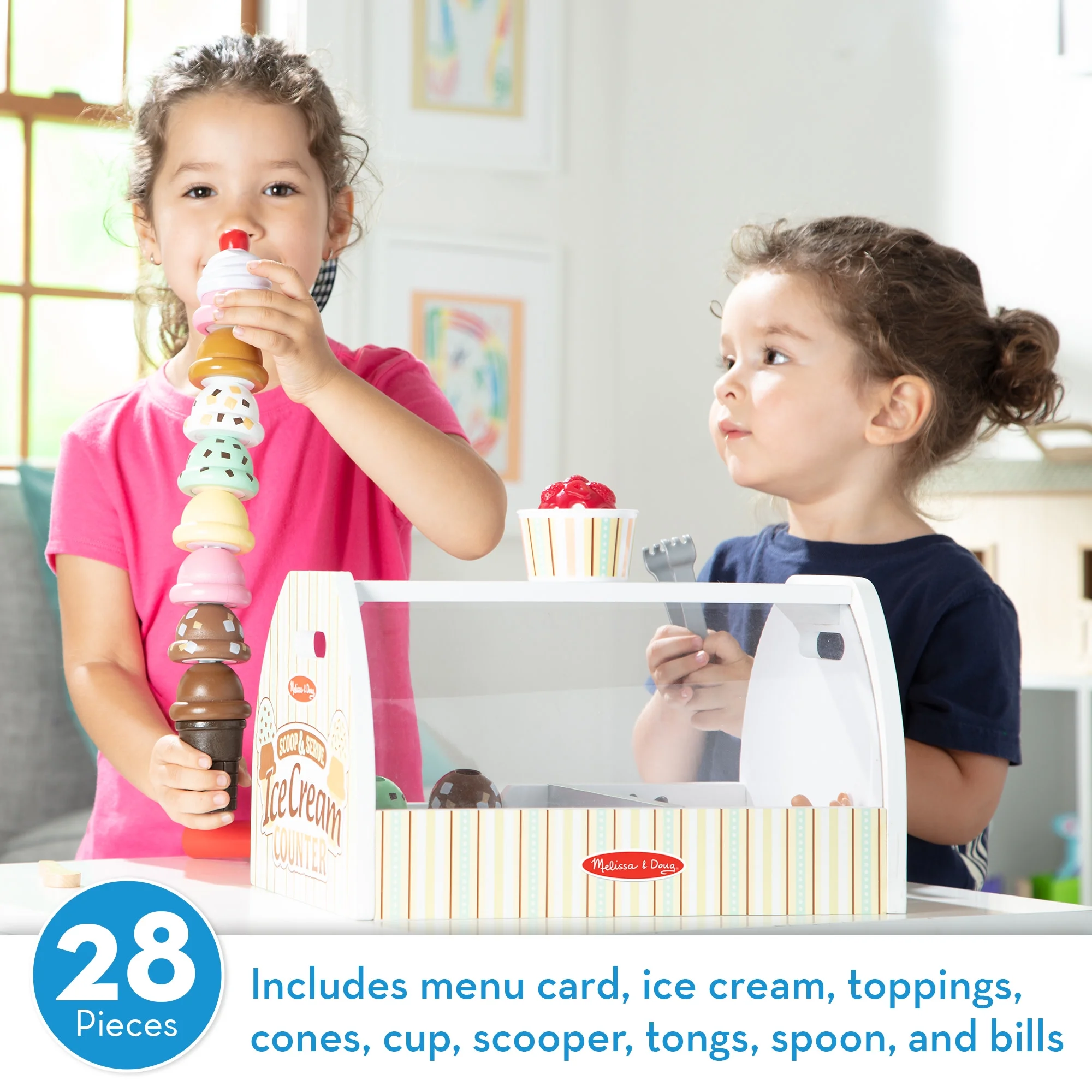 28-piece wooden ice cream play set Includes wooden ice cream counter, eight ice cream scoops, six toppings, two cones, cup, scooper, tongs, wooden spoon, and six $1 bills Scoops stack on cone or in cup and toppings fit snuggly over scoop Lift and release scoops with realistic scooper 3+ years