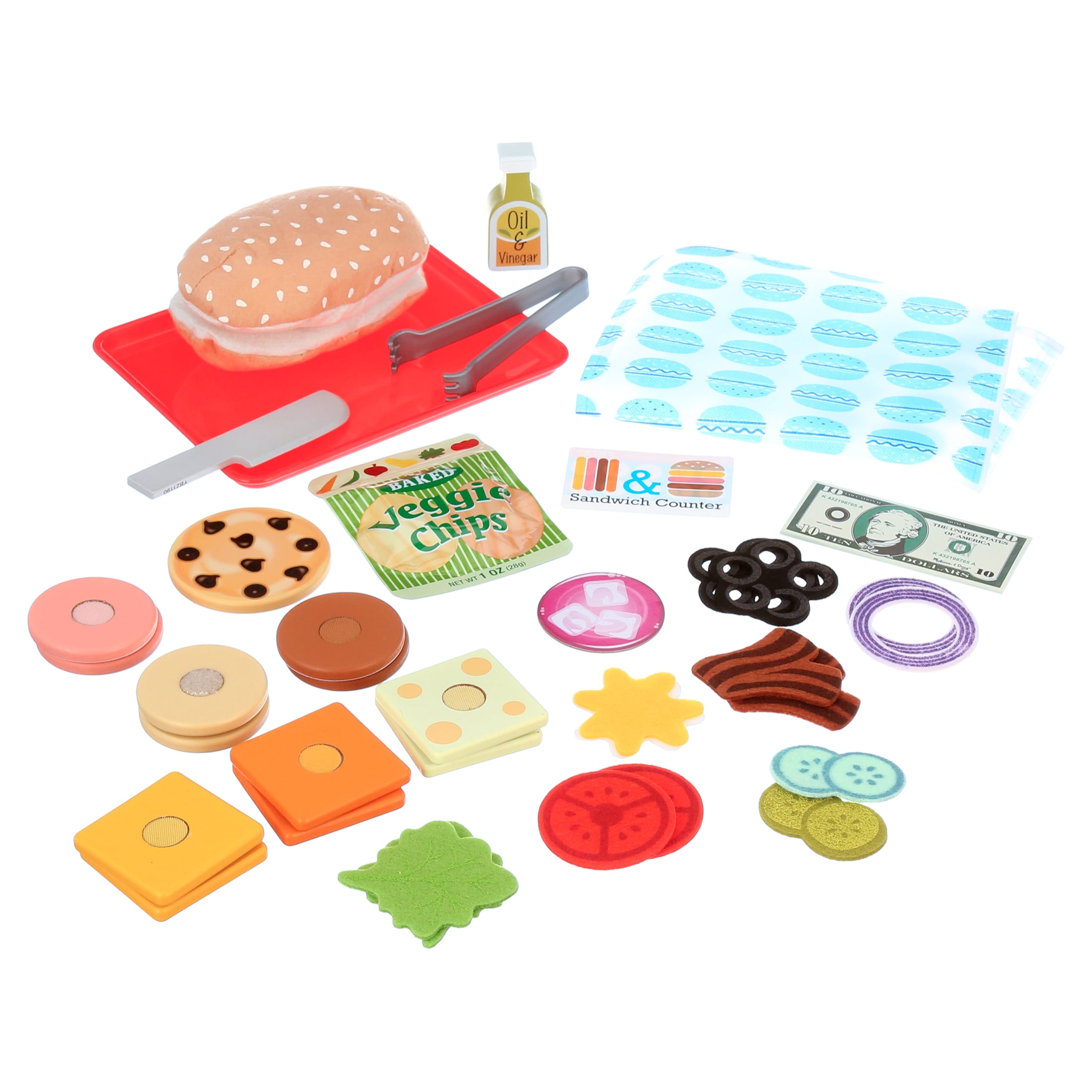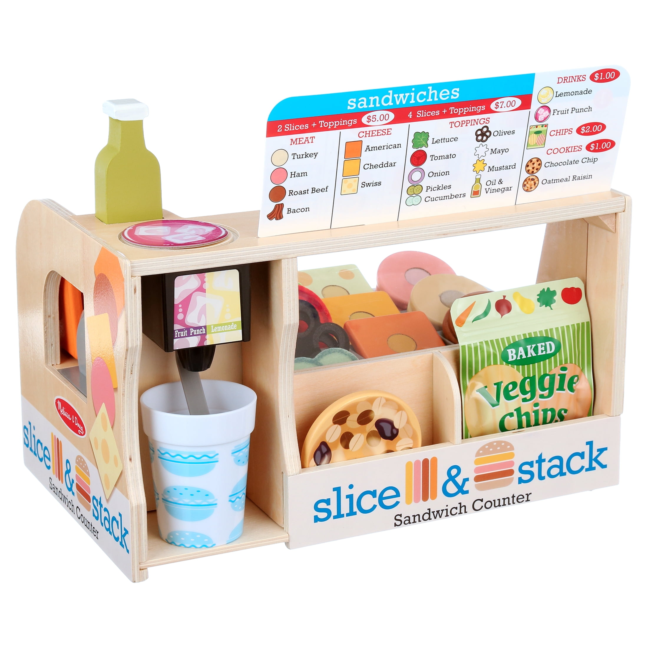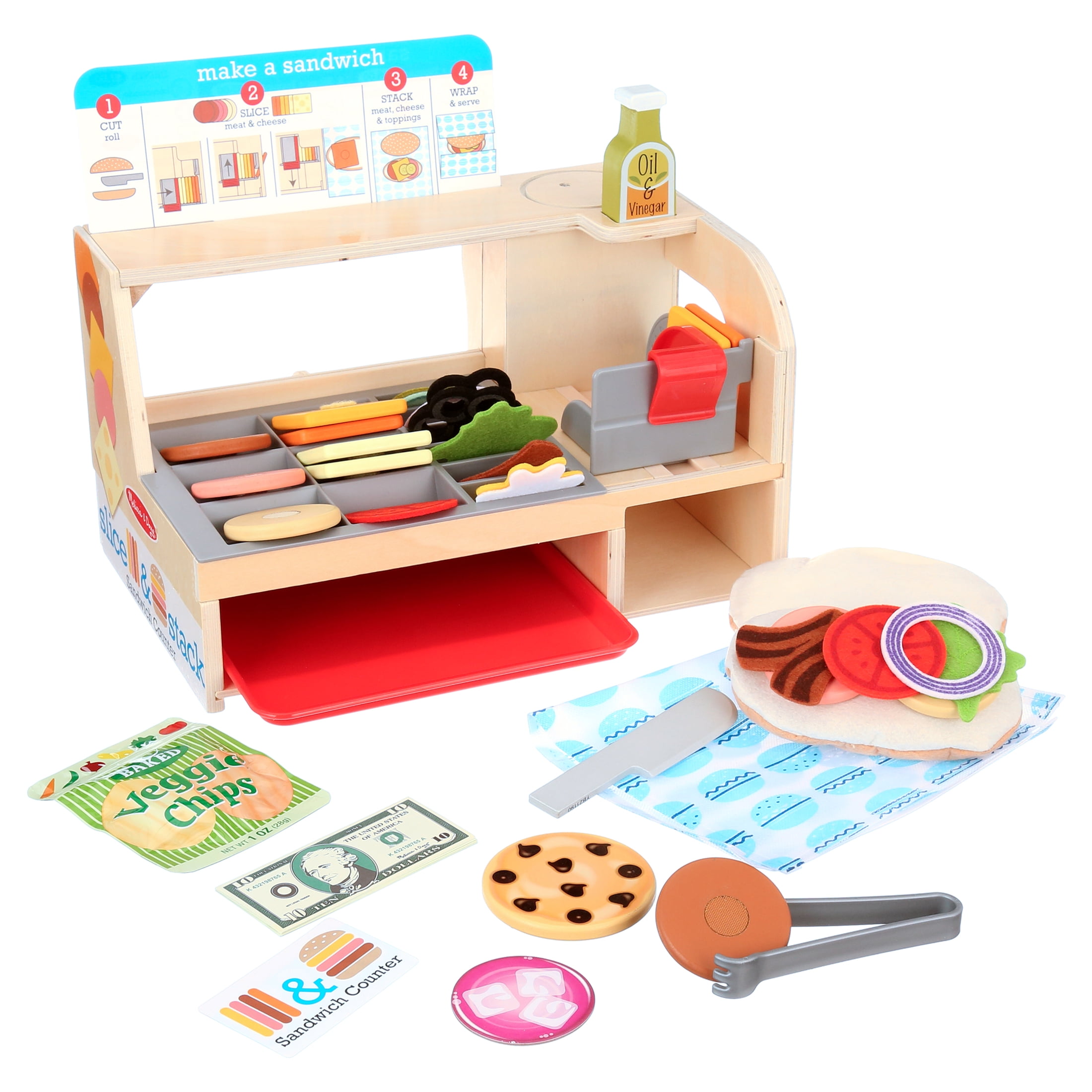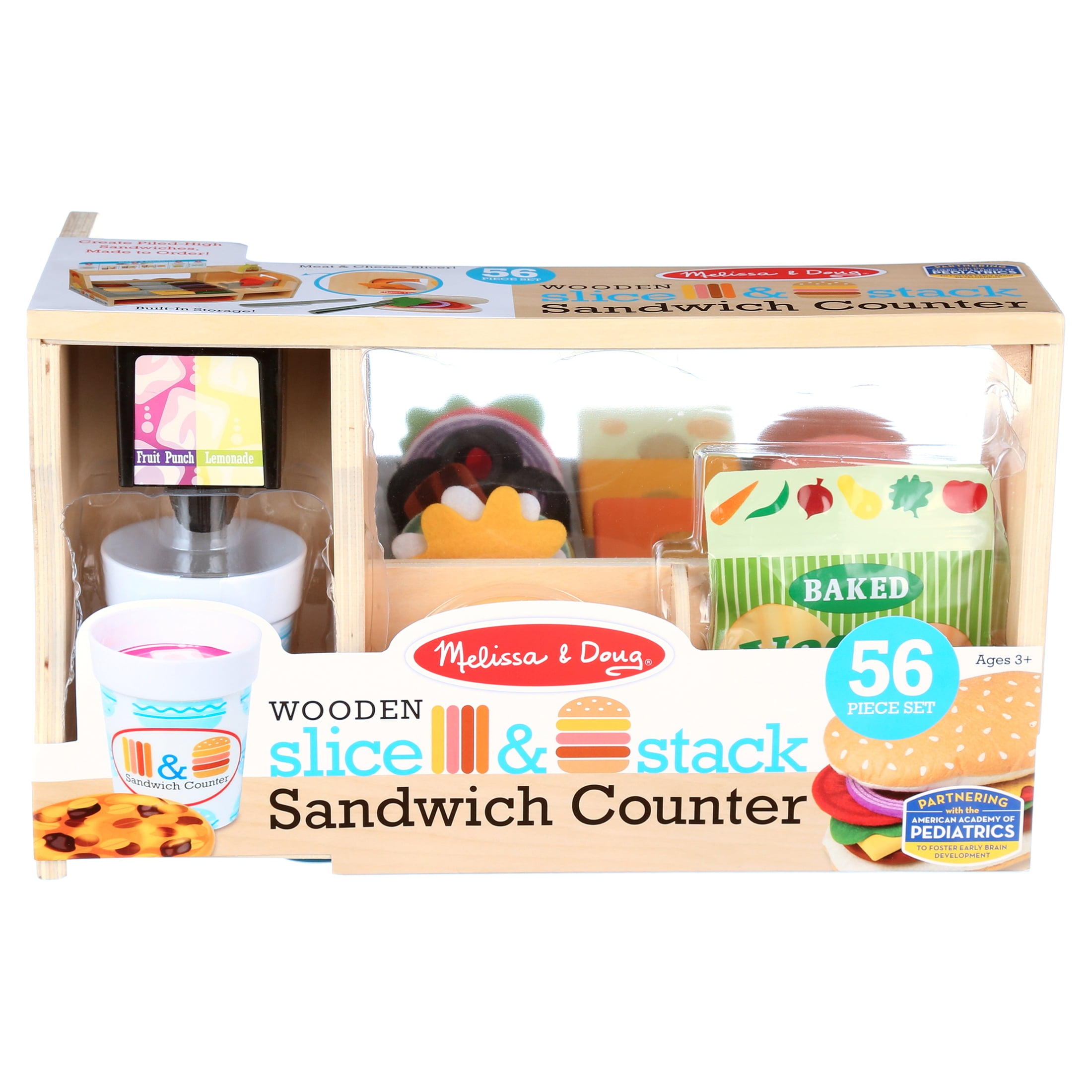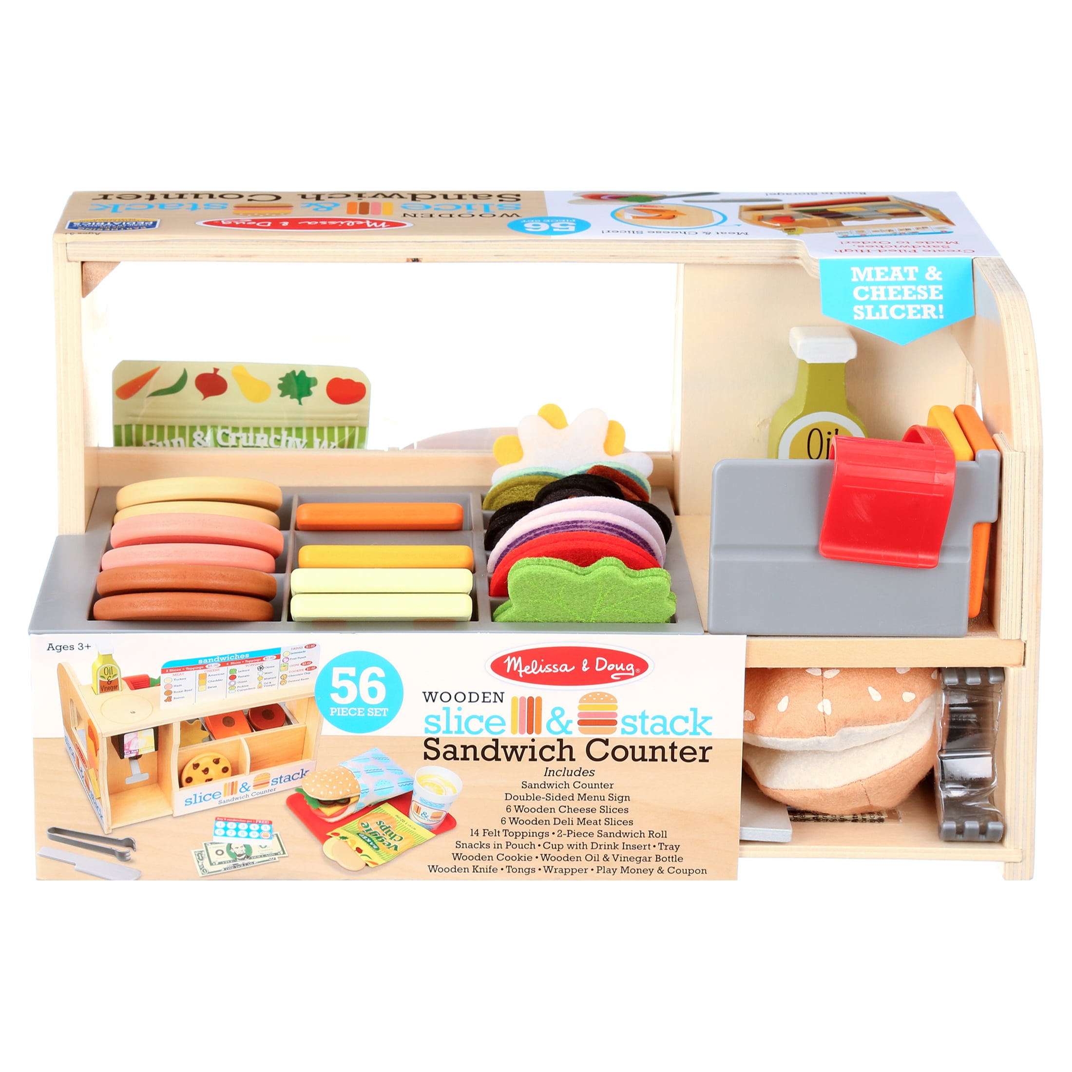 Melissa & Doug Wooden Slice & Stack Sandwich Counter with Deli Slicer Create piled-high, deli-fresh pretend play sandwiches with this 52-piece sandwich counter Play food includes wooden meat and cheese slices, felt toppings and sandwich roll, wooden dressing bottle, play chips, cookie, and drink cup with insert; play money included Counter includes a slicer for wooden meat and cheese pieces, sign with menu on one side and sandwich prep instructions on the other Helps encourage counting, sorting, and fine motor skills, as well as imaginative play and storytelling Makes a great gift for preschoolers, ages 3 to 6, for hands-on, screen-free play