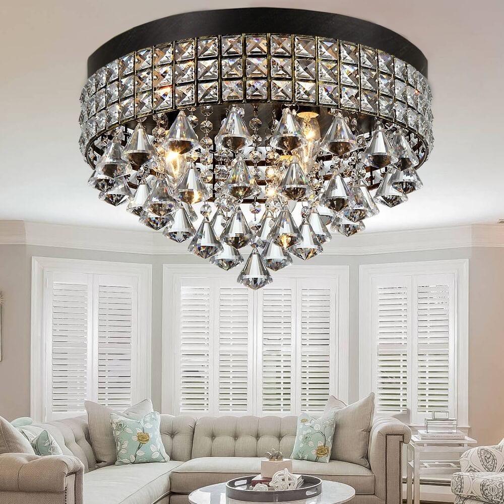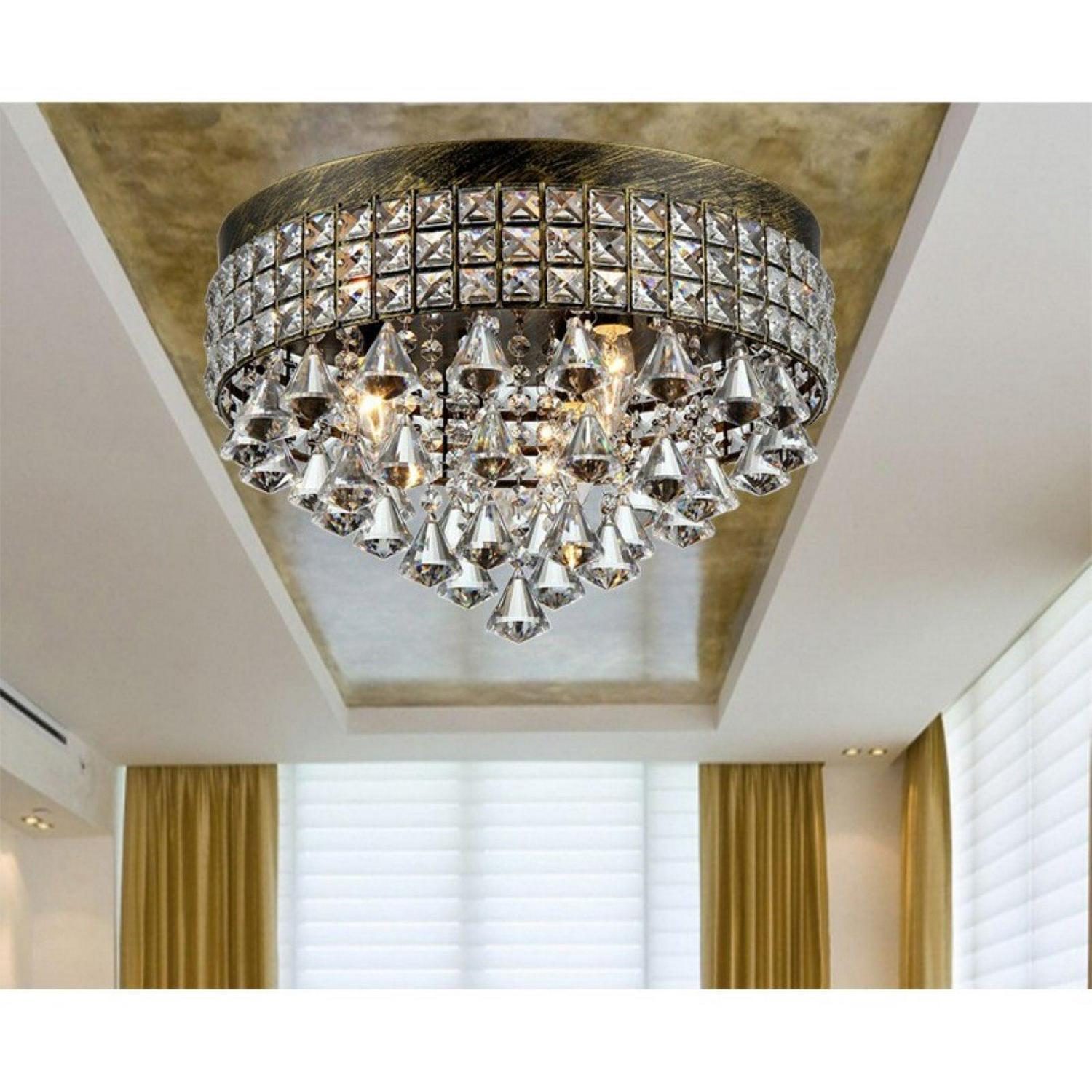 This stunning light fixture will surely look good in your bed room, living room, dining room, kitchen, or entry way. If you are looking for a flush mount that is elegantly functional, this is the light fixture for you and your family to enjoy. It has a generous amount of unique and fabulous crystals dangling from its iron base in antique bronze finish.