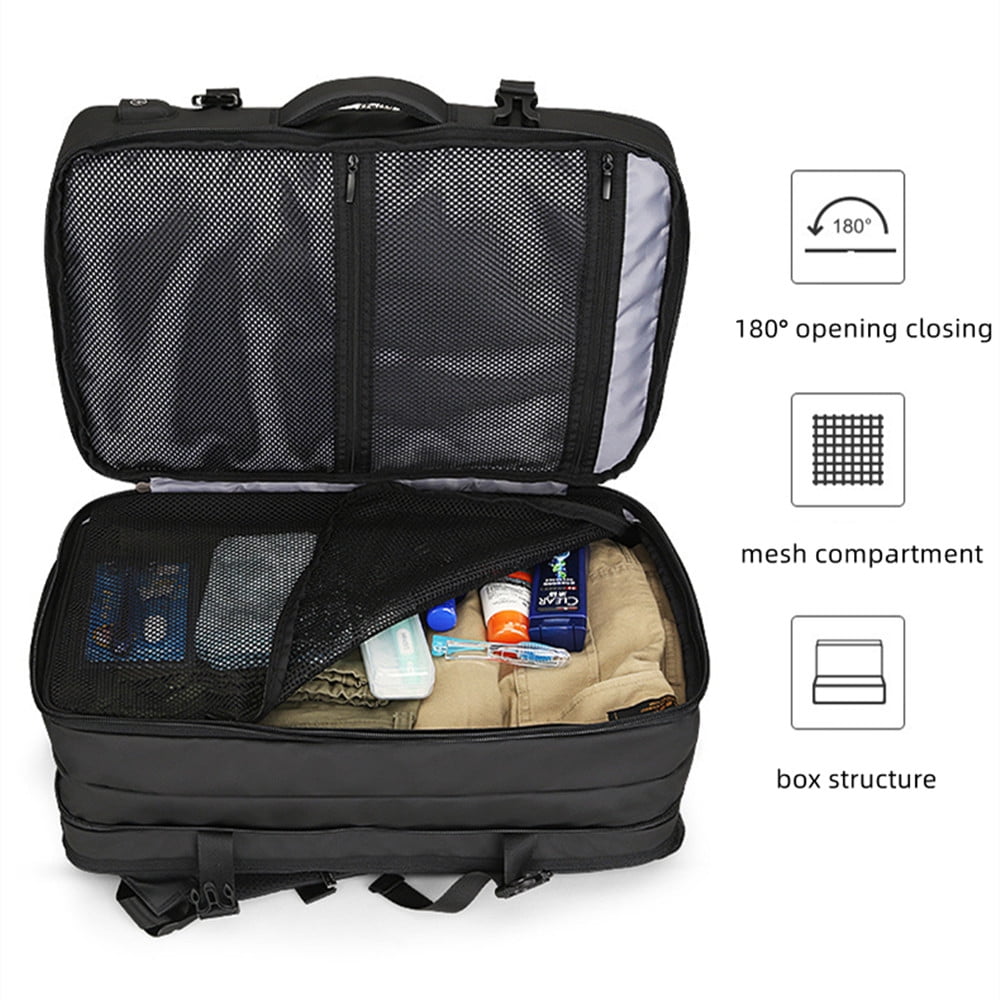 It can expand the 23L compression capacity, increase the space by 30% and the capacity can reach 40L, with a total of three layers. It can store clothes and daily necessities etc. The laptop compartment can store up to 17.3-inch laptops The USB backpack comes with a charging port so you can connect your phone to and easily charge it outdoors and while traveling. Please note that this travel bag does not power itself, the USB charging port only provides convenient charging access The back design of the backpack aids in ventilation and heat dissipation. Wide, breathable mesh straps and foam pads help relieve shoulder pressure The shoulder straps on both sides are designed with lanyards to hang small pendants such as sunglasses The backpack can also be attached to the suitcase to make your journey easier