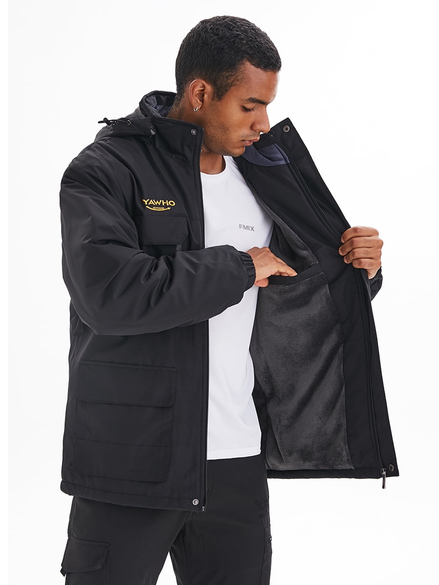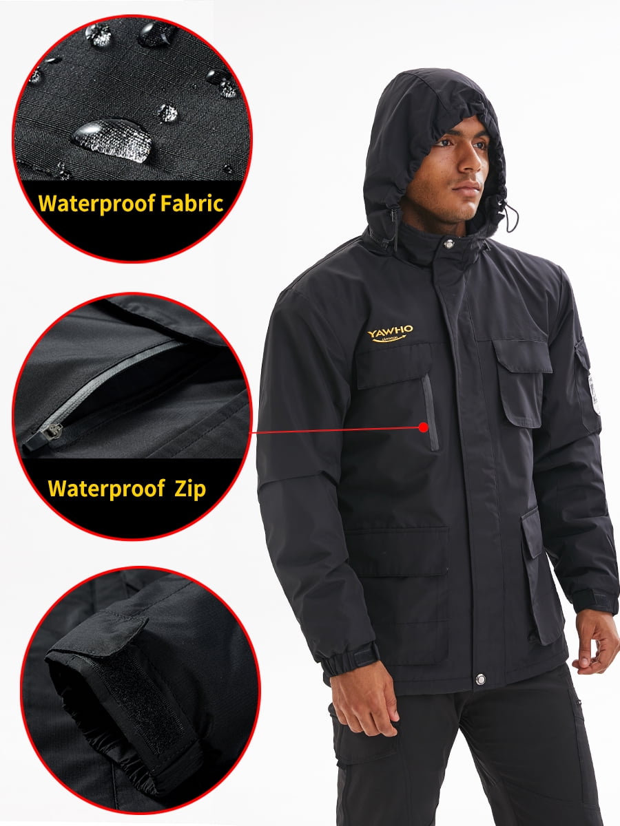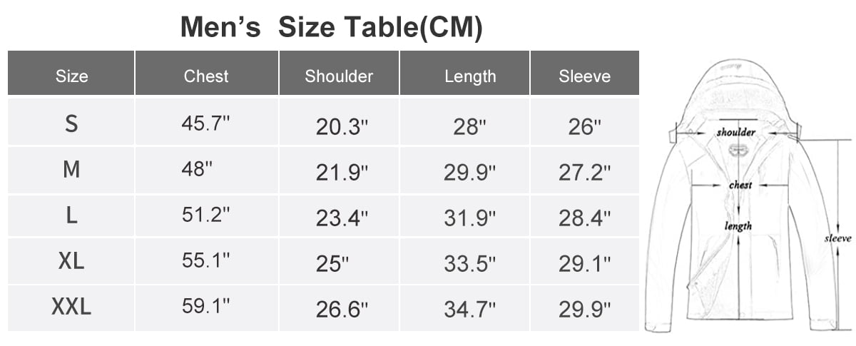 (Size notes: Jacket offers a standard fit. Please choose by US size) Warm Fabric: Professional water repellent coated, Fleece lining and durable fabric with polyester fibre which guarantees the best heat retention. Relaxed-fit style with quick-dry material. Waterproof: Professional water repellent jacket.The outer fabric is waterproof and quick dry. All the zipper design can effectively resisting the water or rain,also can fights for bad weather,always keep your body dry and comfortable. Windproof: 1, Adjustable hook & loop fastener cuffs and stretchable glove with thumb hole help seal in warmth. 2, Inside windproof snap skirt, internal drawcord hem, detachable and adjustable storm hood help to keep wind out. 3, Wear resisting soft shell is highly wind resistant. Multi Pockets:3 chest pockets and 1 Shoulder pocket with flap , 1 chest waterproof zippered pocket,great for cellphone or money,2 big internal pockets ,suitable for wallet,keys,passpor etc. Application: This windbreaker ski jacket is an ideal outfit for downhill skiing, snowboarding, snowsports, hiking, rock climbing and other winter outdoor sports.