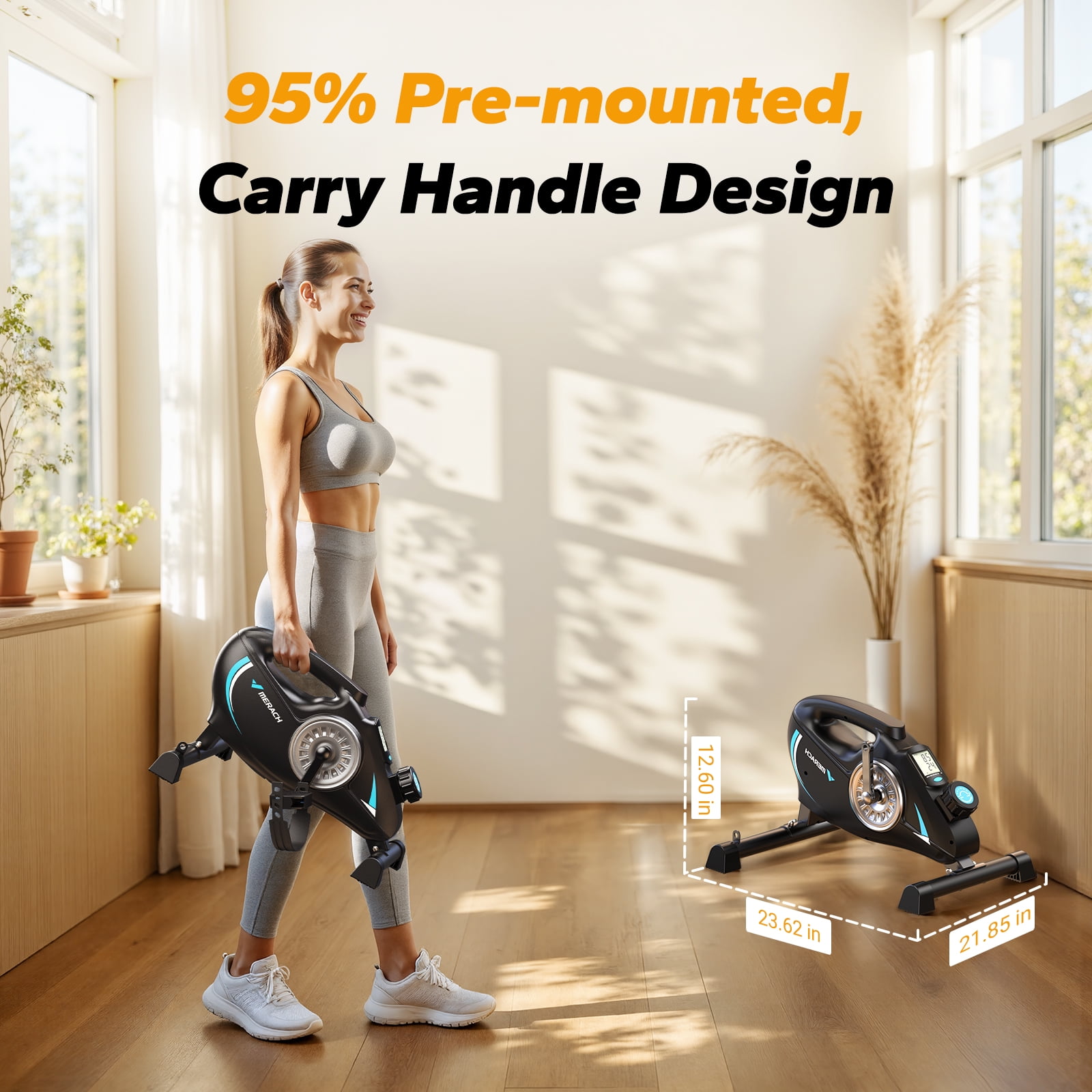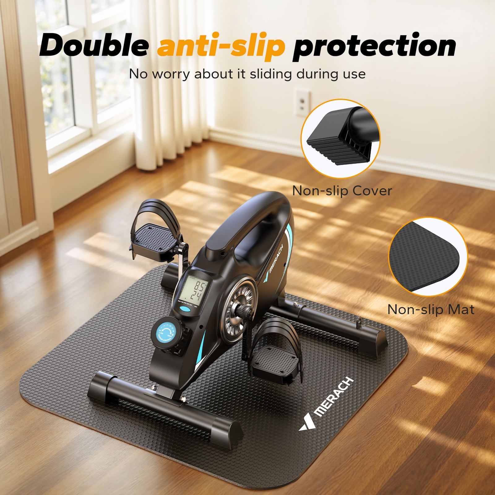 S04 MIni Under Desk Bike Information Brand: MERACH Special Feature: Portable Color: BLACK Power Source: Battery Powered Recommended Uses For Product: Indoor Item Weight: 18 Pounds Maximum Weight Recommendation: 280 Pounds Number of Resistance Levels: 16 Drive System: Belt Includes Floor Mat: Safeguard your floors from friction damage caused by the under-desk bike while preventing it from sliding during pedaling. Premium Silent Resistance Riding: Experience the ultimate in premium silent resistance riding with the S04 Mini Under Desk Bike. With 16 levels of adjustable resistance, you can customize the intensity to meet your specific needs, whether it’s for rehabilitation exercise or activating muscles while sitting. The mini bike utilizes high-quality magnetic resistance, ensuring a smooth and quiet pedal motion that’s gentle on your joints and allows you to focus on your tasks without disturbing others. Stay Active, Stay Fit, Stay Productive: Our portable S04 exercise bike offers low-intensity exercise, aiding in faster recovery and maintaining joint mobility. Ideal for office workers or elderly individuals, it provides a convenient way to stay active and healthy while working, reading, or watching TV. Enhanced Mini Exercise Experience with the FREE MERACH APP: Track your progress, set goals, and choose from free, target, and timed practice options. Connect your mini exercise equipment and access your exercise data on the homepage, while the app silently records your overall activity. Comprehensive Workout with Resistance Bands: Included resistance bands allow you to sculpt and strengthen your arms while engaging your upper body. These arm resistance bands can help improve your posture and reduce tension in your shoulders and neck, providing a well-rounded workout experience. Compact and Versatile Design: Its compact and versatile design allows for use in any corner of your room or even on your table. The ergonomic pedals make it easy to use for both your legs and arms, offering multiple workout options. LCD Monitor: Keep track of your progress with the LCD monitor, which displays scan, speed, time, distance, and calories burned. Stay informed and motivated as you monitor your real-time results. Portable Design: With its convenient carrying handle, the mini exercise bike can be taken anywhere and is easy to store. Product dimensions: 23.6″L x 21.9″W x 12.6″H | Product weight: 17.8 pounds | Weight capacity: 280 pounds Worry-Free Guarantee: When you choose a MERACH under-desk bike, you receive a one-year “manufacturer’s warranty” for added peace of mind. In case of any quality issues, please contact us directly. We are dedicated to providing assistance and ensuring your satisfaction. Choose MERACH for reliable, user-friendly, safe, and durable products! Warm Tips: You can pedal barefoot, in slippers, or trainers, but we recommend avoiding casual shoes. Additionally, you can adjust the pedal tightness at any time by adjusting the straps.