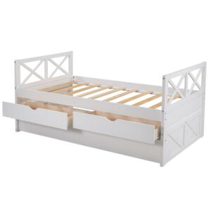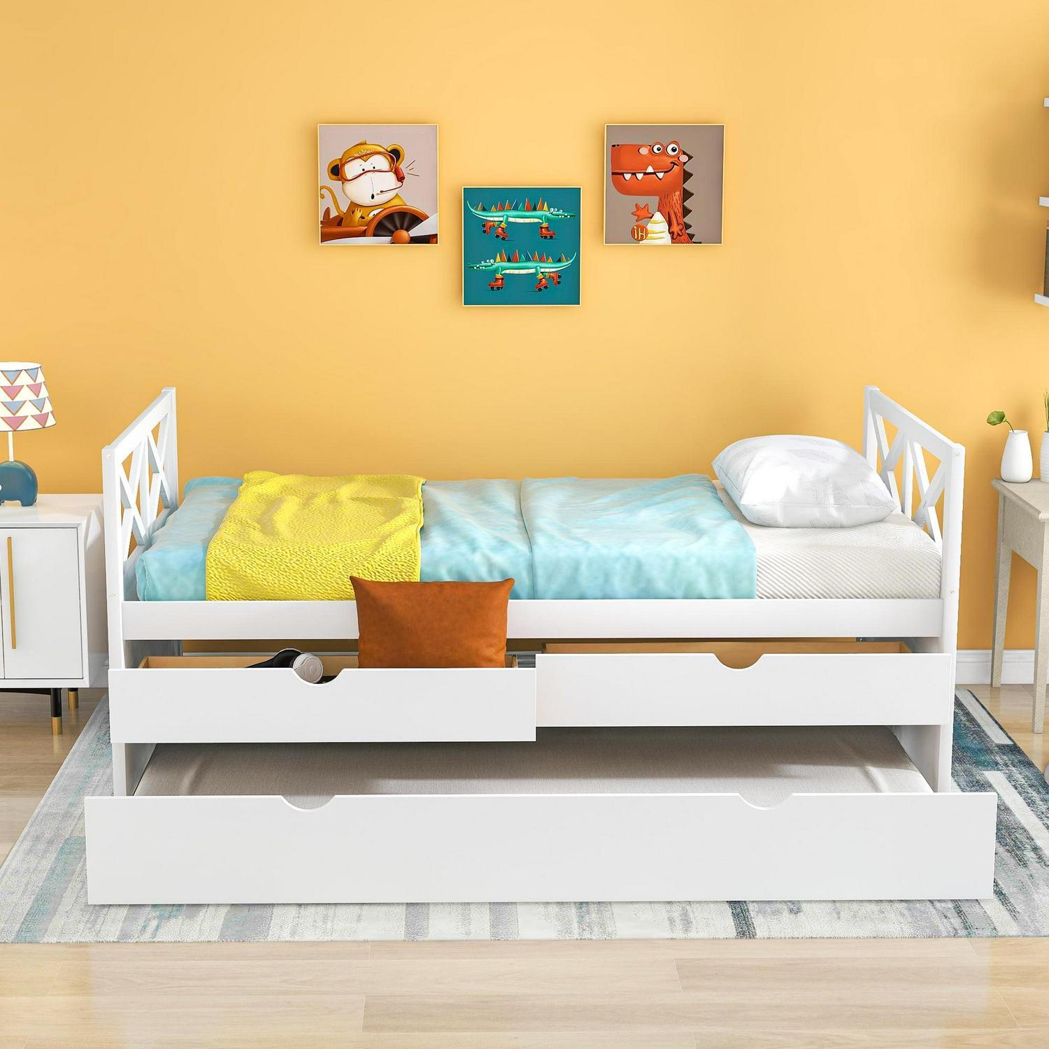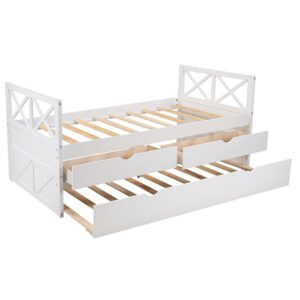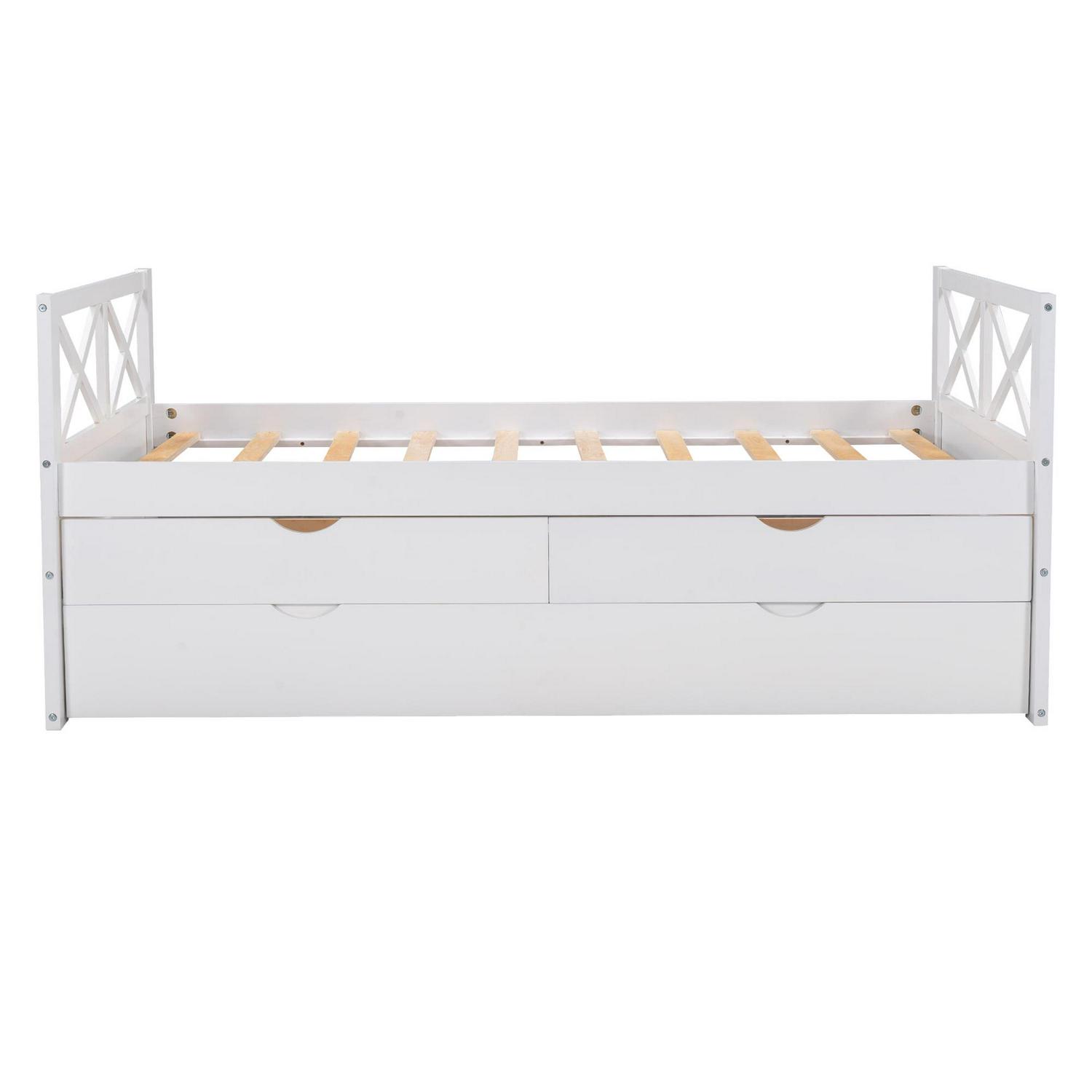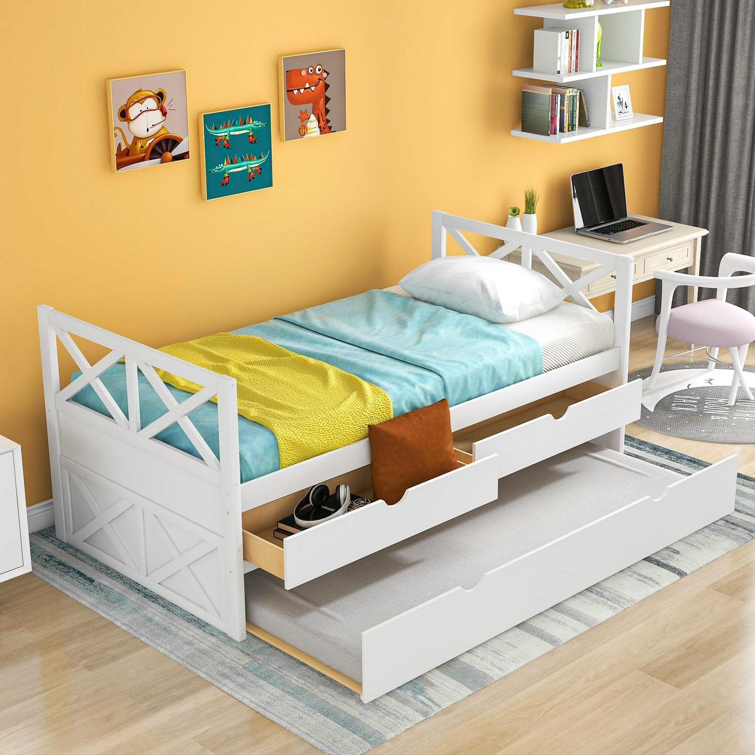 – 3-in-one Functionality: A pull-out twin trundle bed with smooth wheels. Whether you’re expecting company or making the most out of a tight space, this trundle bed gives you an extra twin bed without sacrificing square footage. Three functional spacious drawers for keeping clothes, toys, books, or other kid’s room accessories. 3-in-1 Captain Bed provides sleeping space and storage all wrapped in one elegant design to save space and look great