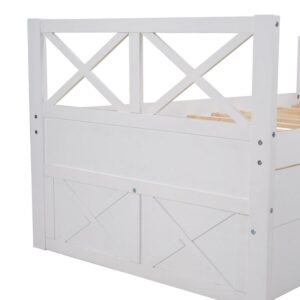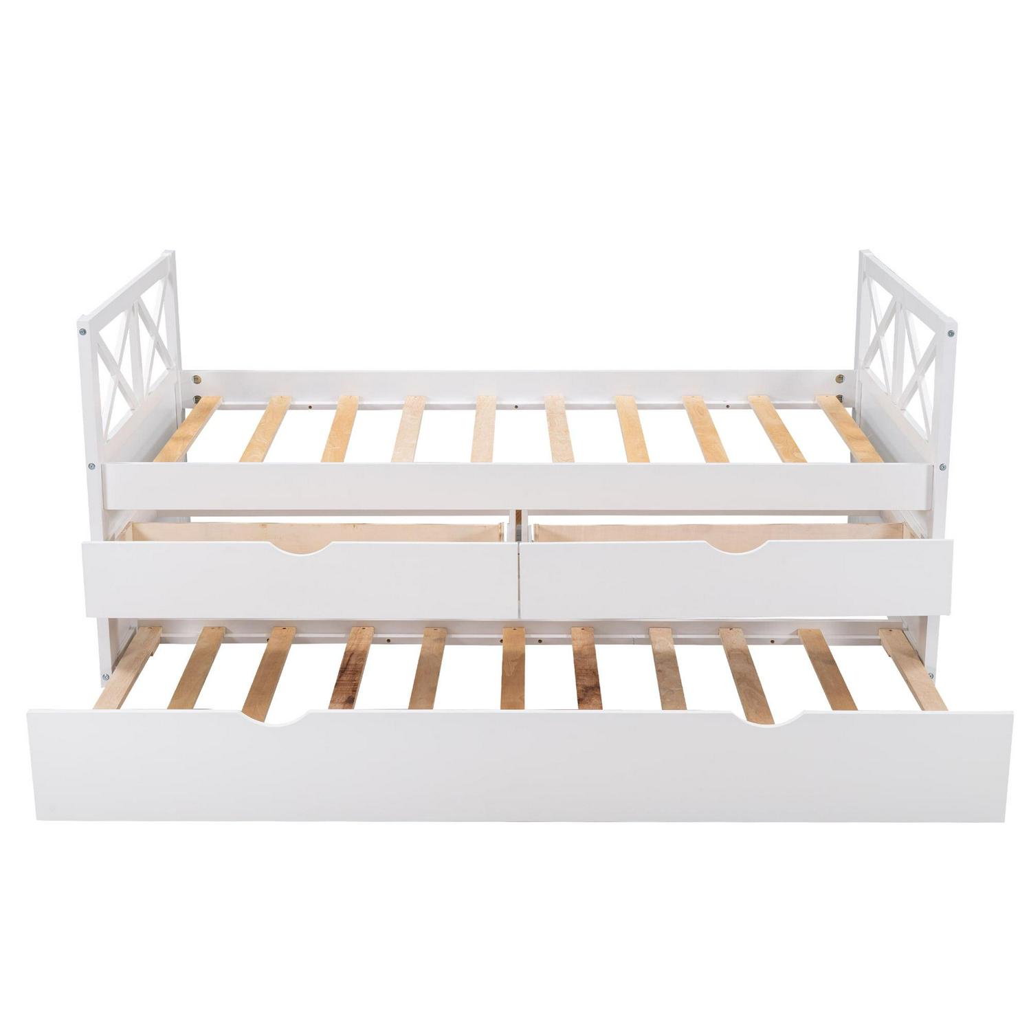 Make the most of your space with the twin captain bed featuring a pull-out twin trundle bed with three functioning spacious drawers to bring style and functionality to any bedroom. When space is at a premium, Merax provides you with the perfect solution for your guest room or kid’s room. Take advantage of the three spacious, pull-out drawers which neatly tuck under the bed, keeping your clothes, books, toys, or bedding organized while also providing two twin beds, making optimal use of this one convenient bed. When not needed, extra beds and drawers are smoothly rolled back under the bed, making this bed the ultimate in functionality. Give your kids or guests a perfect night’s rest while keeping your home neat and organized with a Merax captain bed.