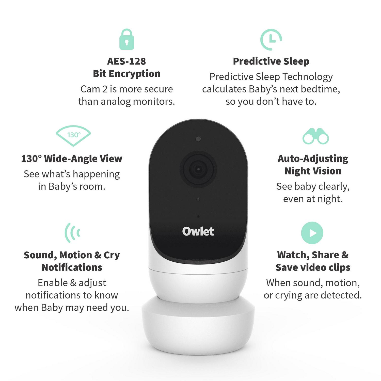 The all new Owlet Cam 2 Smart Video Baby Monitor Camera lets you feel like you re there, from anywhere. Check on Baby with HD video & night vision streamed right to your phone. Enjoy peace of mind with AES 128-bit encryption, making the Owlet Cam 2 more secure than analog monitors. Get a full view of Baby with a wide-angle view & 4x zoom.