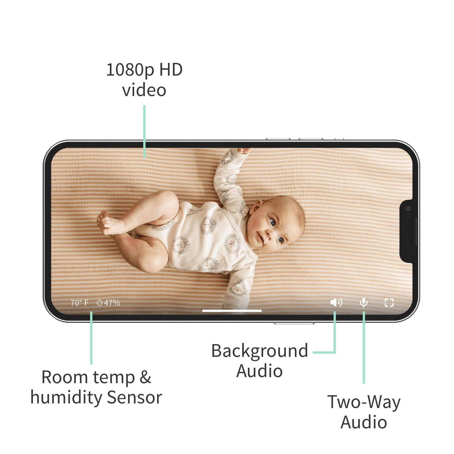 Use two-way talk to stay connected to Baby and soothe them from anywhere. Listen to audio from your baby’s room in the background while using your phone to scroll, shop, or text. Live room temperature and humidity readings help you keep Baby comfortable as the seasons change.