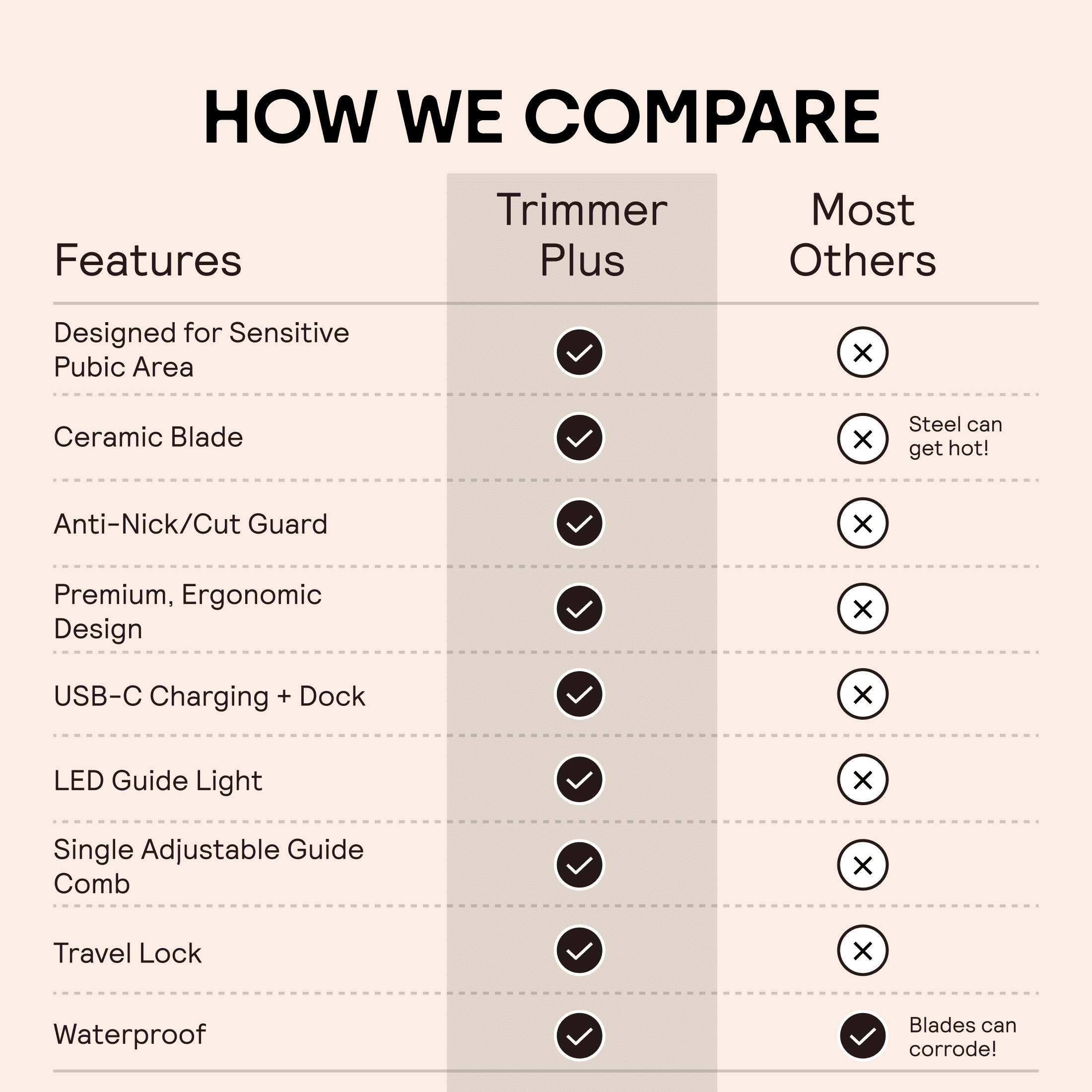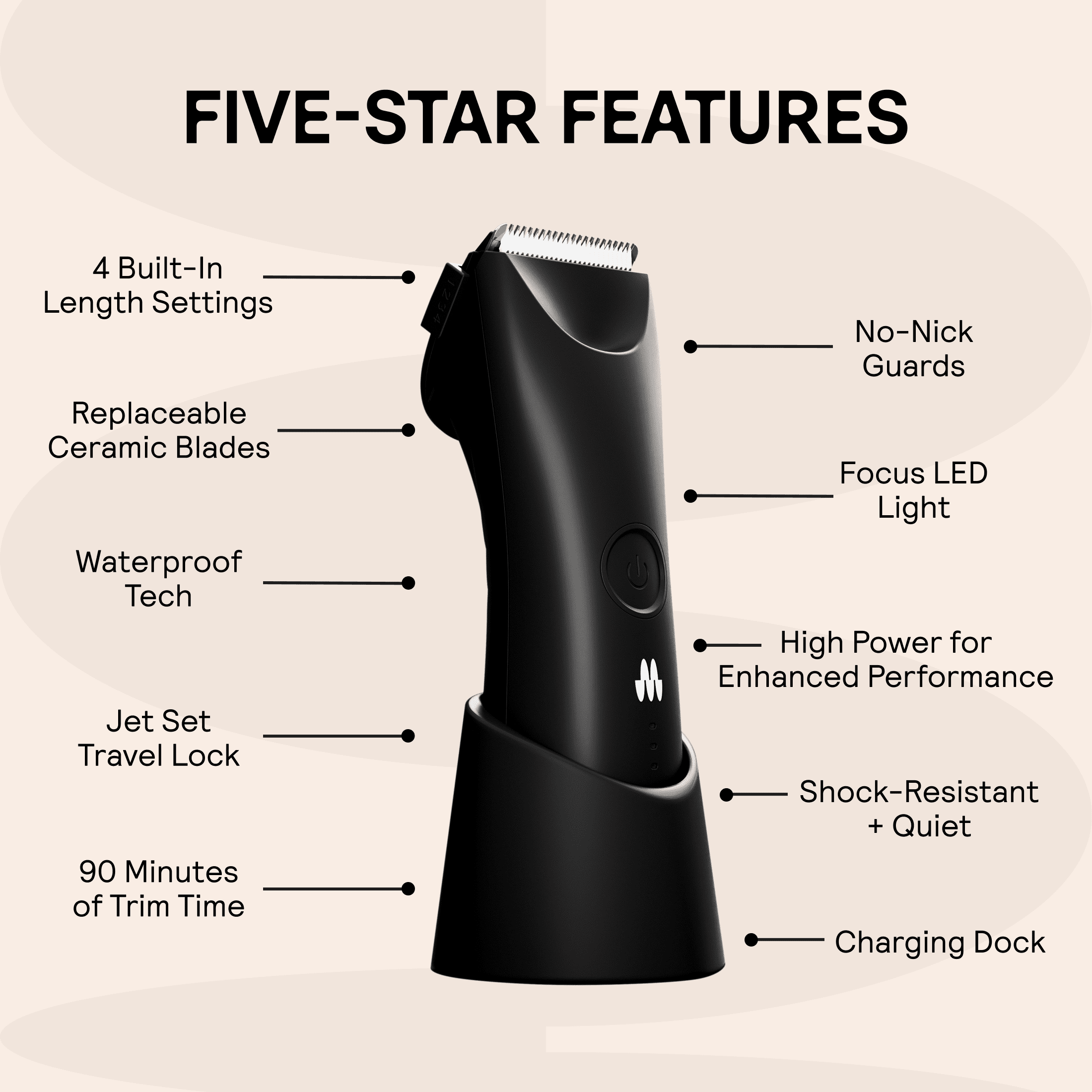 Effortless and precise trim 5-Adjustable settings LED spotlight Ceramic blade Wet/dry technology Quiet and powerful performance No nicks or cuts Built-in travel lock UPC 81004883279