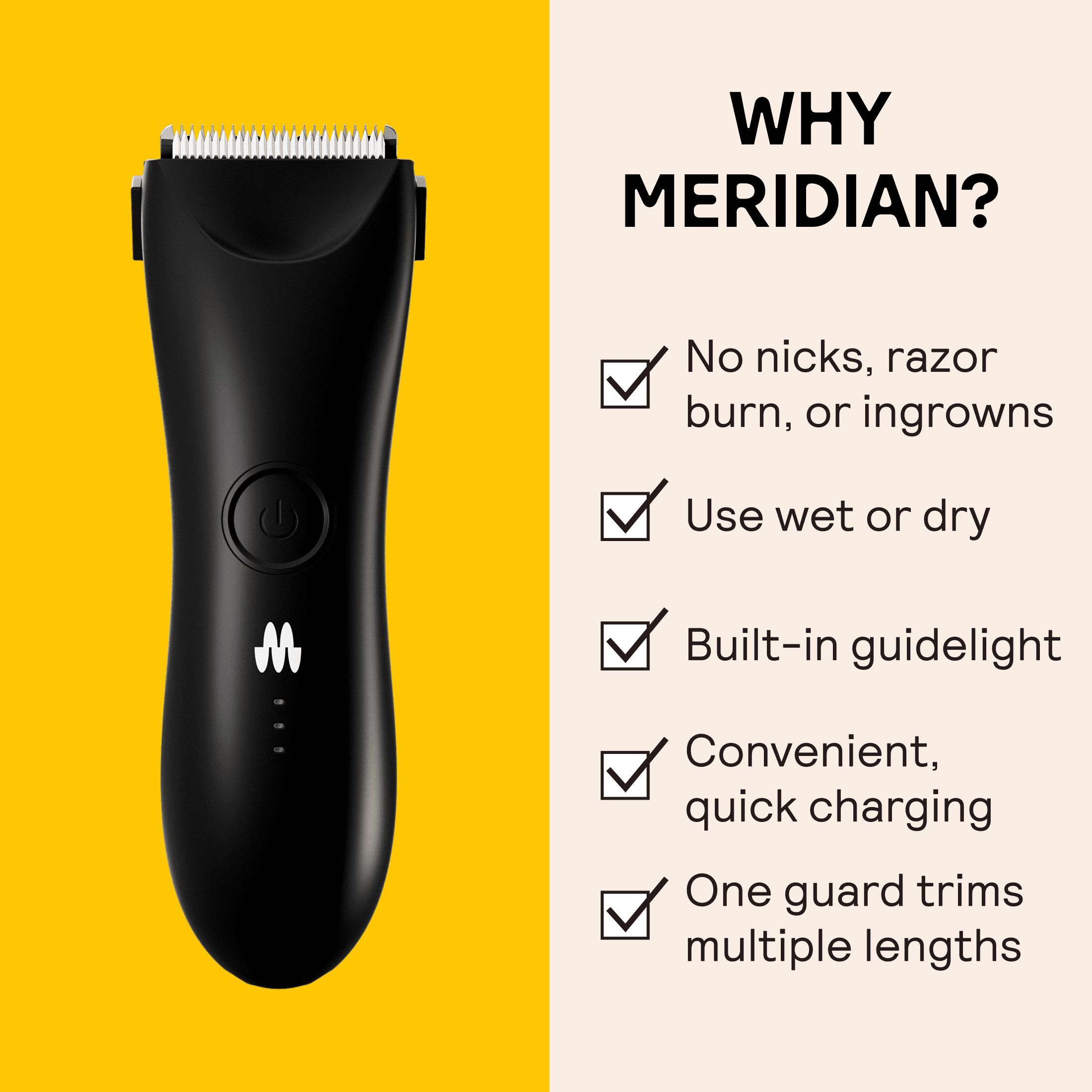 Whether you prefer bare, buzzed or a full bush look, Meridian provides premium trimmers for hair grooming everywhere , on your body. The Trimmer Plus, the next generation of it’s original trimmer, is designed for an effortless and precise trim, featuring a fixed guard with 5 adjustable settings. High-quality ceramic blade provides a gentle glide that removes the coarsest of hair with no nicks or cuts. Whether you prefer a bare, buzzed, or full bush look – you’ll love the quiet, but high-powered performance this body and pubic hair trimmer delivers. The ideal trimmer for travel with built-in travel lock, LED spotlight and wet/dry technology. Color: Onyx 4.1oz assembled product weight.