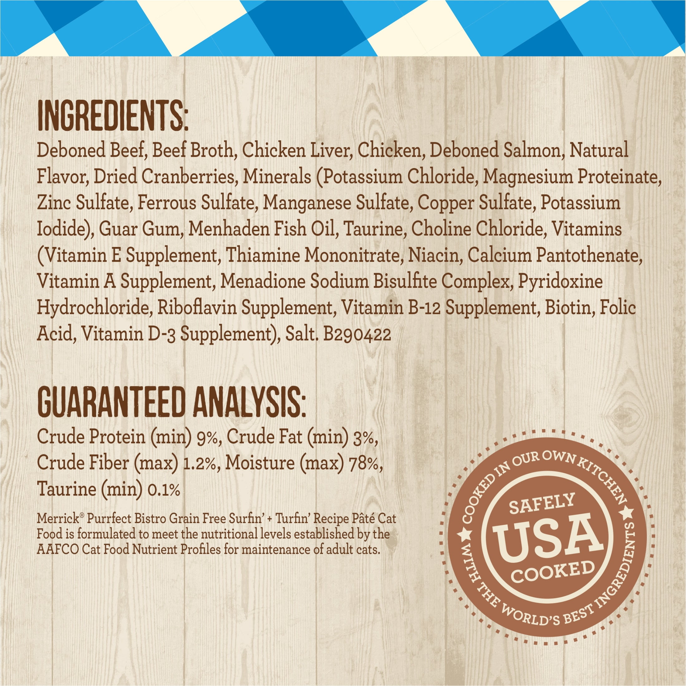 Merrick Purrfect Bistro Pate Cat Food, Surfin’ And Turfin’ Recipe. Premium, Soft Grain Free, Soy Free And High Protein Adult Canned Cat Food Real deboned beef is the first ingredient in this wholesome canned wet cat food. This wet cat food also contains real deboned salmon, and is high in protein to help your cat maintain lean muscle mass This healthy high protein cat food pate is made without grains and is a soy free cat food with a holistic blend of added vitamins, minerals and nutrients, like taurine, for adult cats Crafted to provide wholesome nutrition, Purrfect Bistro grain free surf and turf recipe cat food is a moist and soft canned food that features finely ground pate for a deliciously smooth texture Merrick Grain Free Purrfect Bistro cat food recipes are made without artificial colors, flavors, or preservatives. Proudly founded in Hereford, Texas, crafted in USA facilities