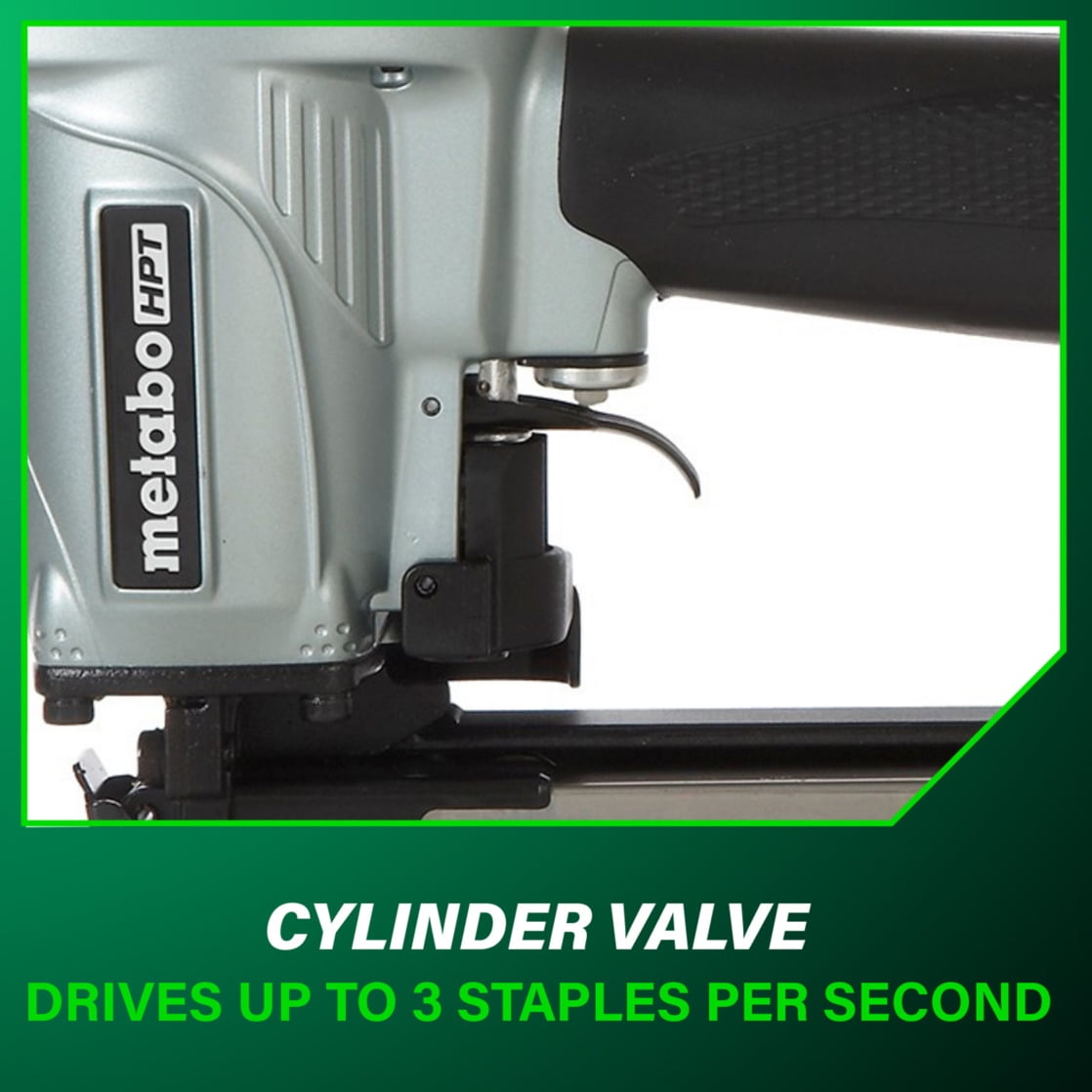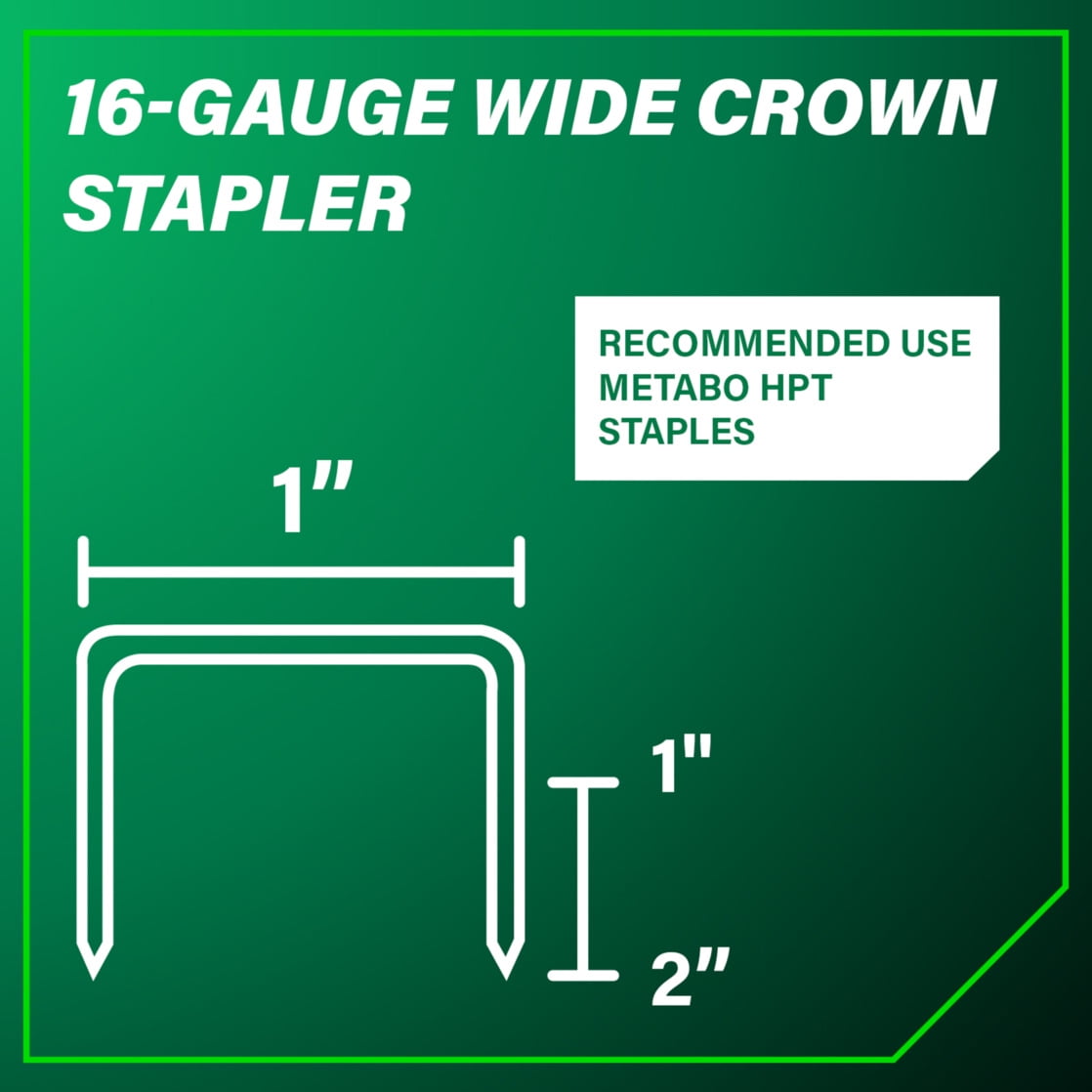 FASTENERS: 16 Gauge, 1 In. Wide Crown Staples AWARD: Rated the Pro Preferred Nailer for 9 years running (2014 – 2022) by Builder and Developer Magazine LIGHTWEIGHT: At only 4.7 lbs and well-balanced allowing for ease of maneuverability and less user fatigue CYLINDER VALVE: Firing mechanism provides a quick response and powerful driving- up to 3 staples per second TOOL-LESS DEPTH ADJUSTMENT: Depth adjustment to countersink or flush drive into a variety of materials MAGAZINE: High capacity top loading magazine holds 150 staples, allowing for fewer replenishment and quick reloading GRIP: Long-lasting elastomer grip surface for added comfort RECOMMENDED: Use Metabo HPT Staples for best results WARRANTY: Covered by Metabo HPT’s Professional 5-Year Tool Warranty