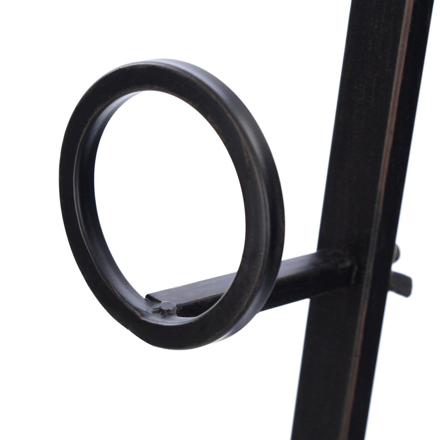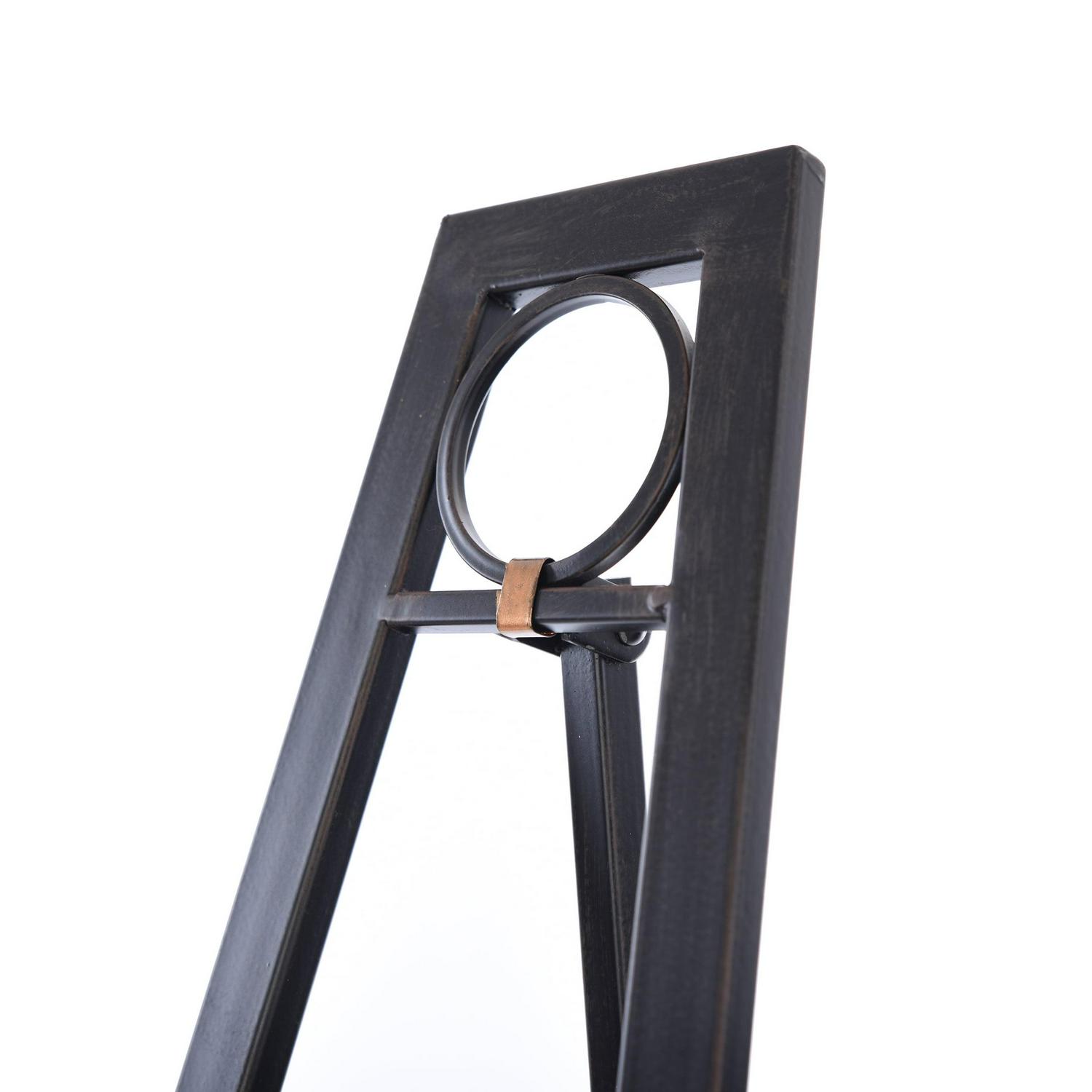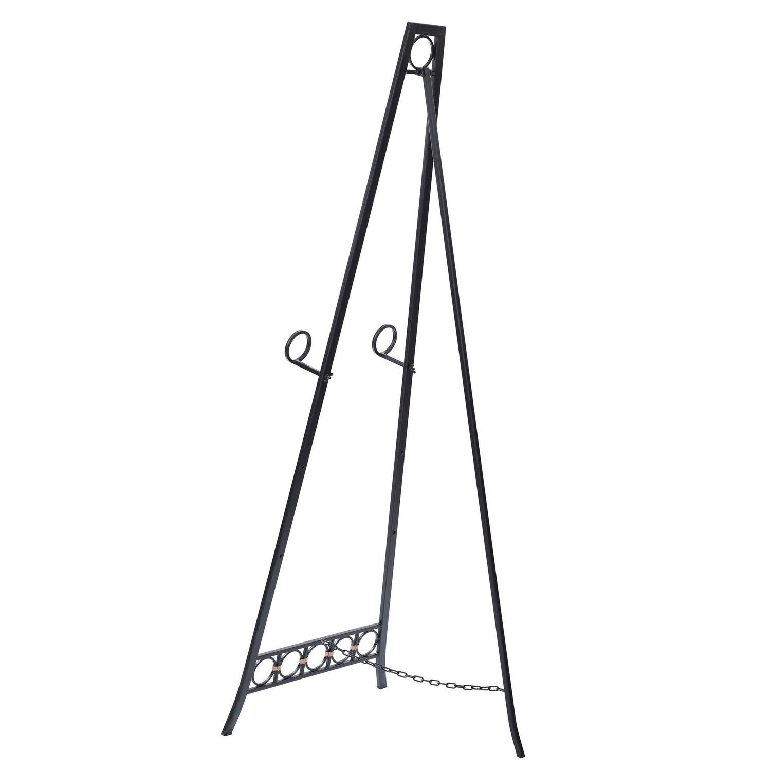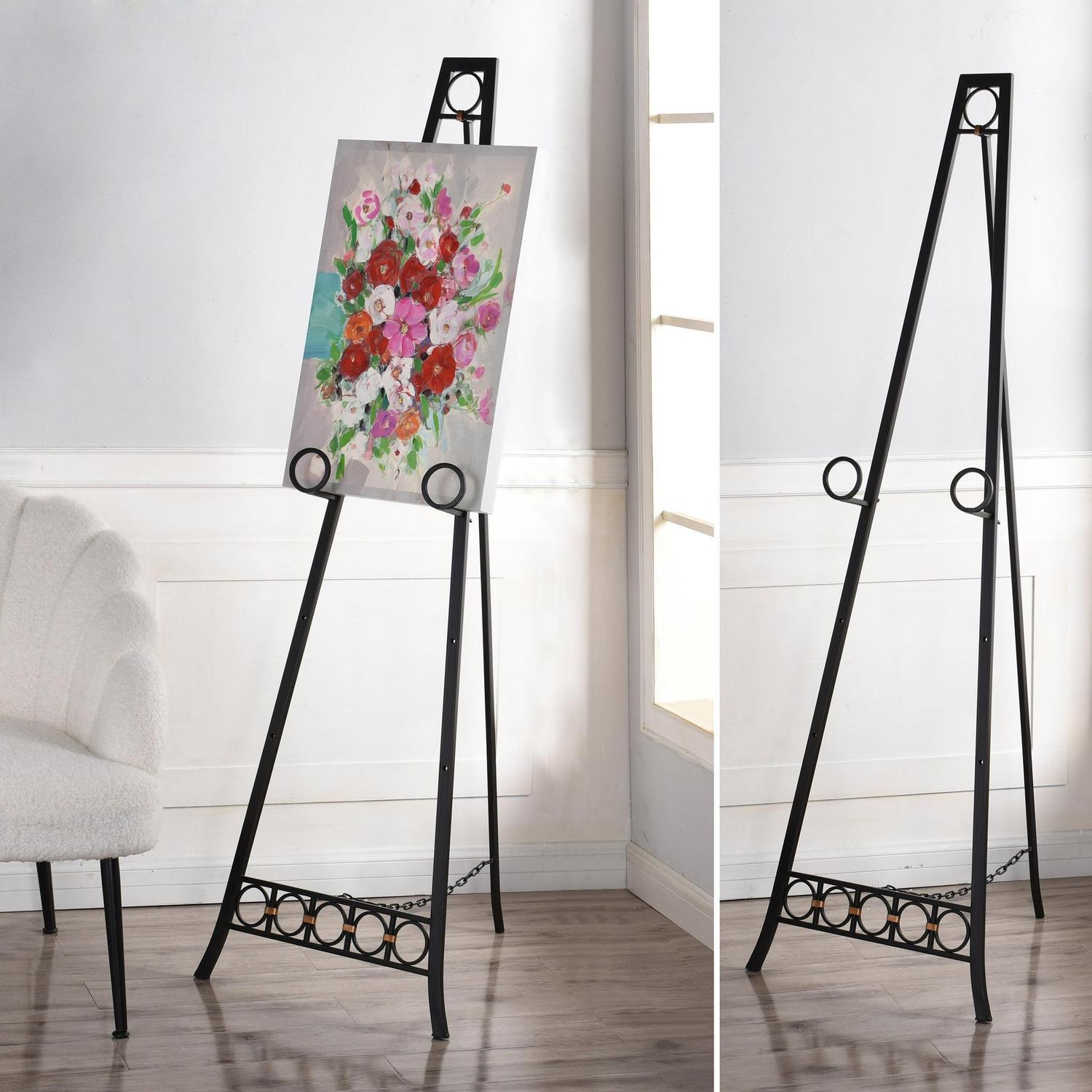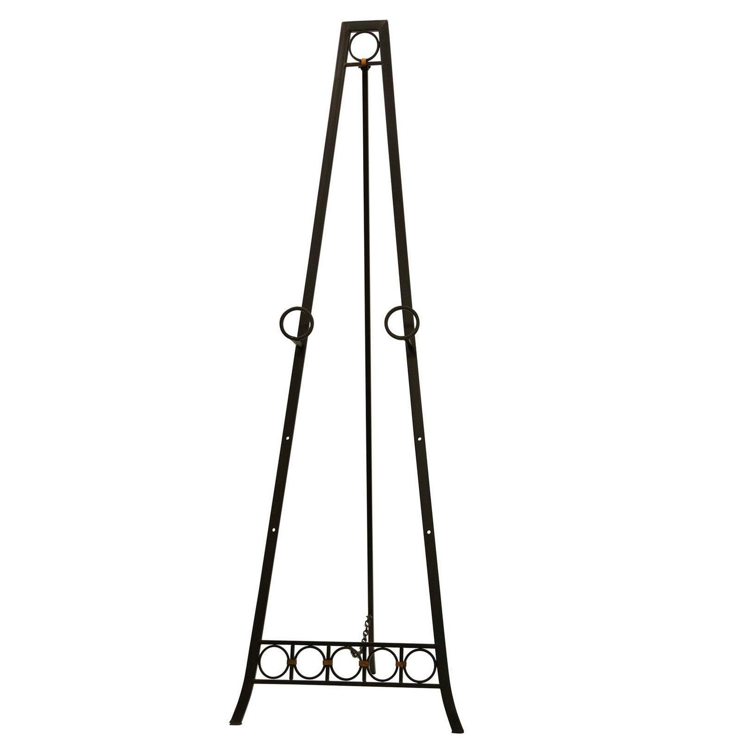 Enhance the look of a living room with this metal floor easel. The dark bronze finish blends into any color scheme, and the eye-catching design features circular details. The easel is adjustable, so it’s a customizable accent for any home.