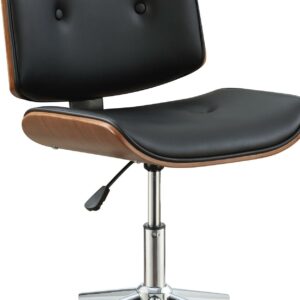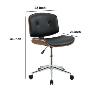 Metal and Wooden Office Armless Chair, Black and Walnut Brown- Saltoro Sherpi Liven up any setting with this simple yet sophisticated, metal constructed Office Chair. It features a wooden backing and faux leather upholstery to sit comfortably and does not put pressure on the backbone. The star base provided with casters for mobility, while a lever adjusts the seat height to accommodate several table heights.