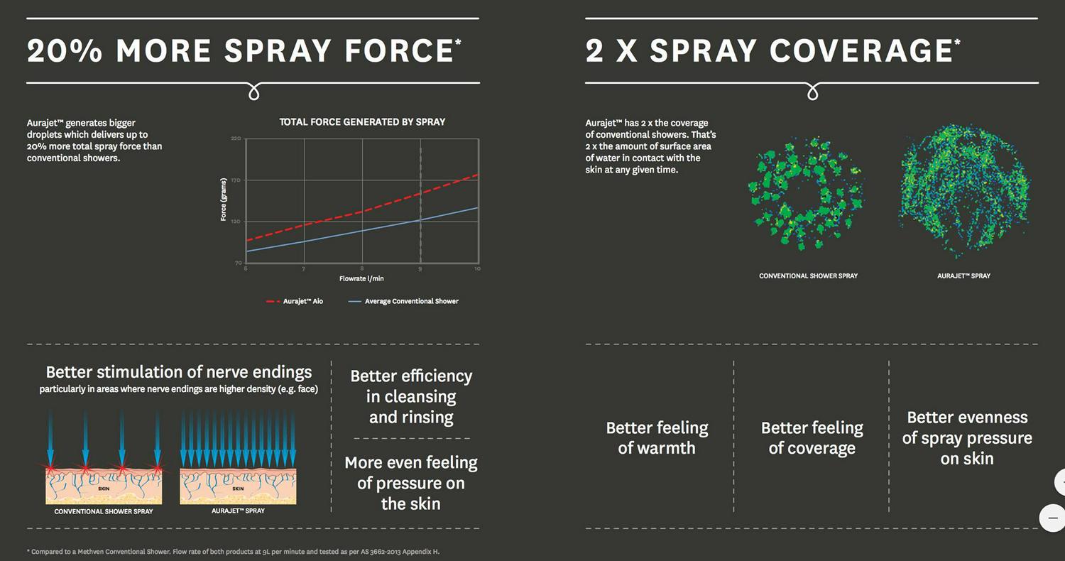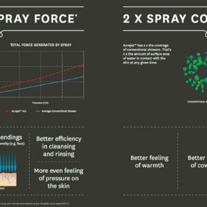 – Ultra-wide coverage. A full-bodied spray for all-over warmth and maximum body contact. Delivers twice water coverage in contact with the skin than traditional showers.