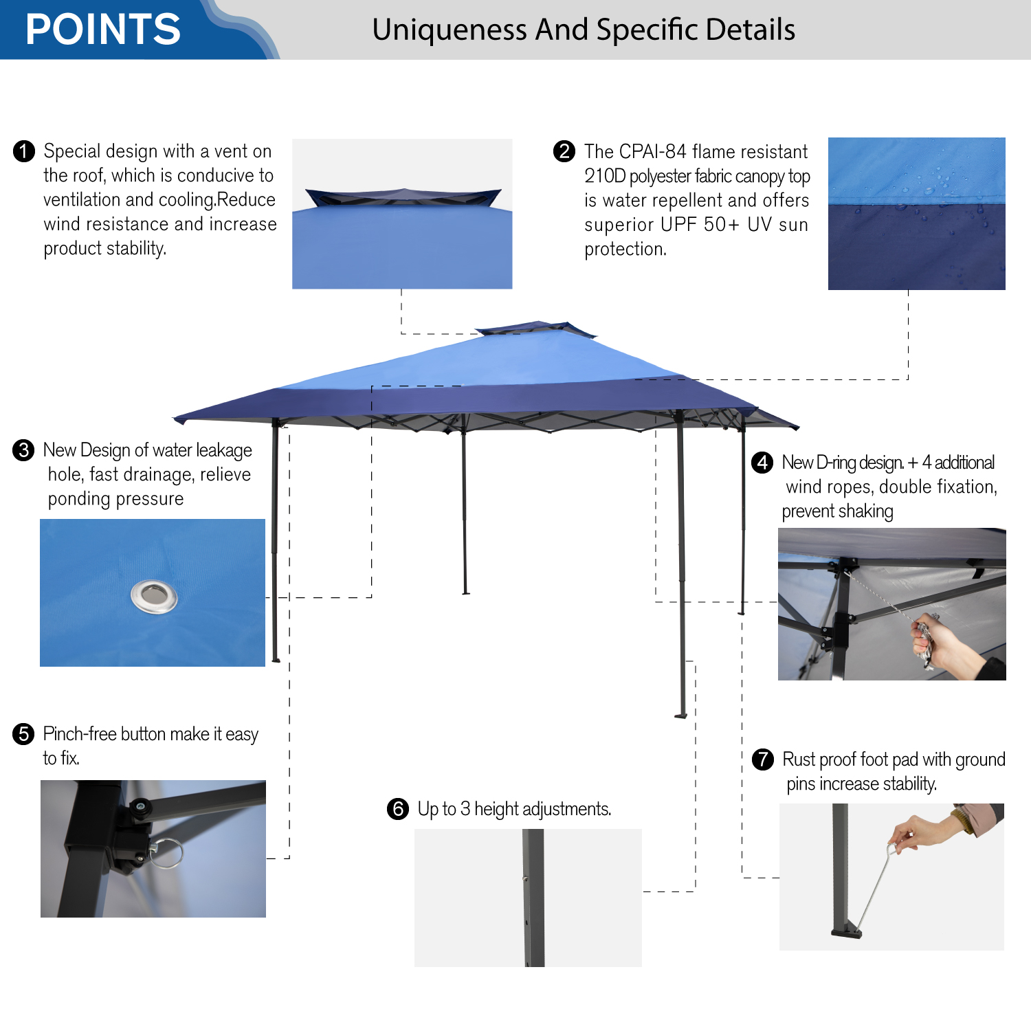 - Ventilated Roof: Double top design helps to ventilate the interior of the canopy helping to release trapped heat and also provides increased stability in windy conditions by allowing the wind to pass through the vent.