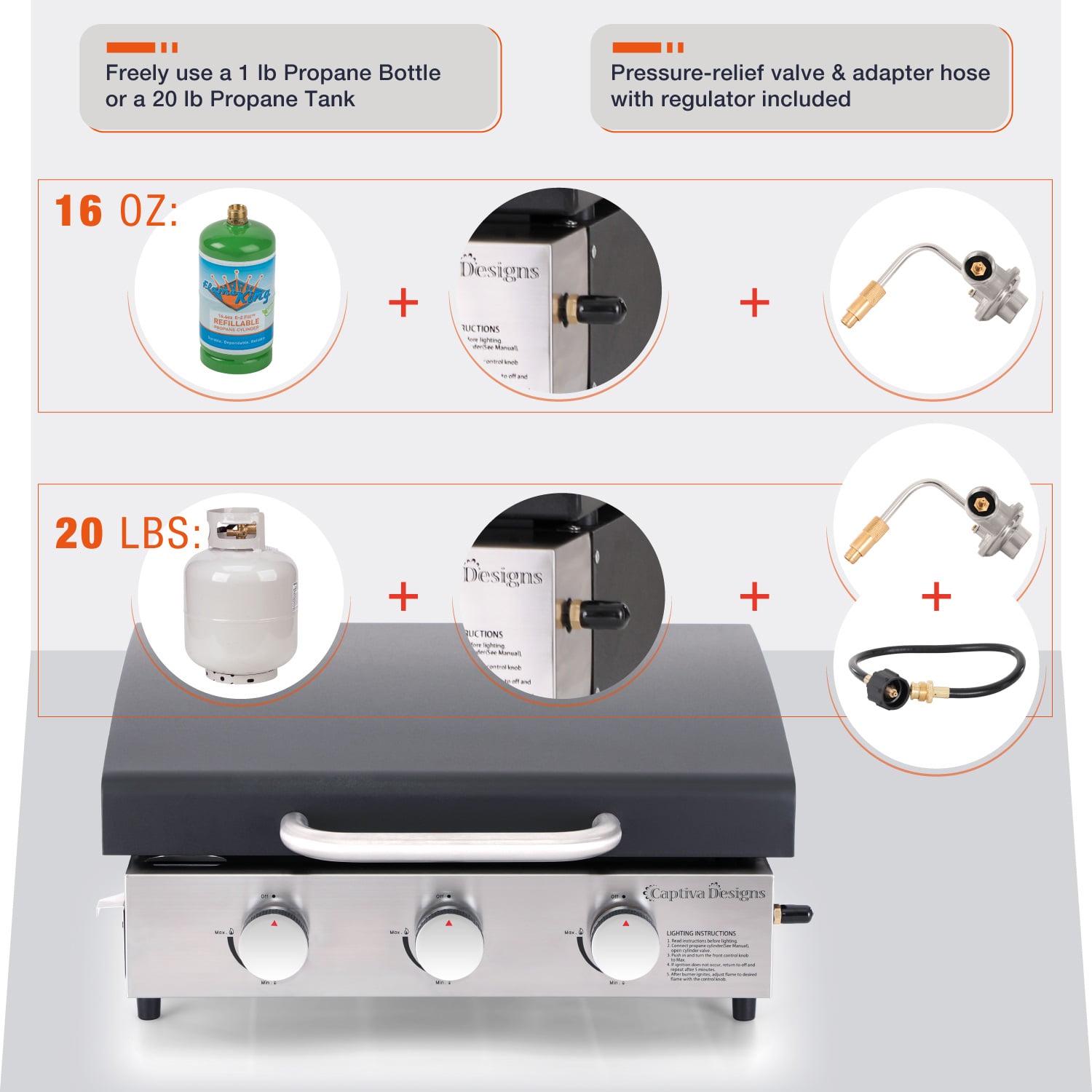 Suitable for a 1 lb Propane Bottle (not included) or a 20 lb Propane Tank (not included)