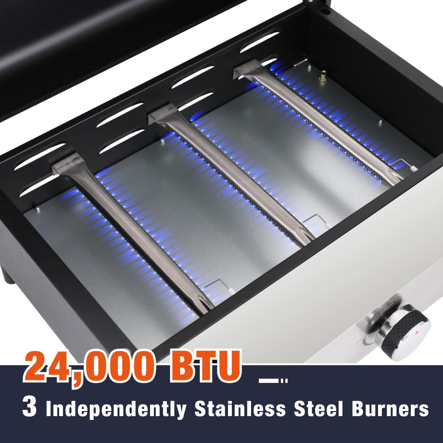 – Three-Burner Griddle: Three individually controlled burners produce a total of 24,000 BTUs for even heat distribution. The griddle has large and spacious cooking area-360 square inches.