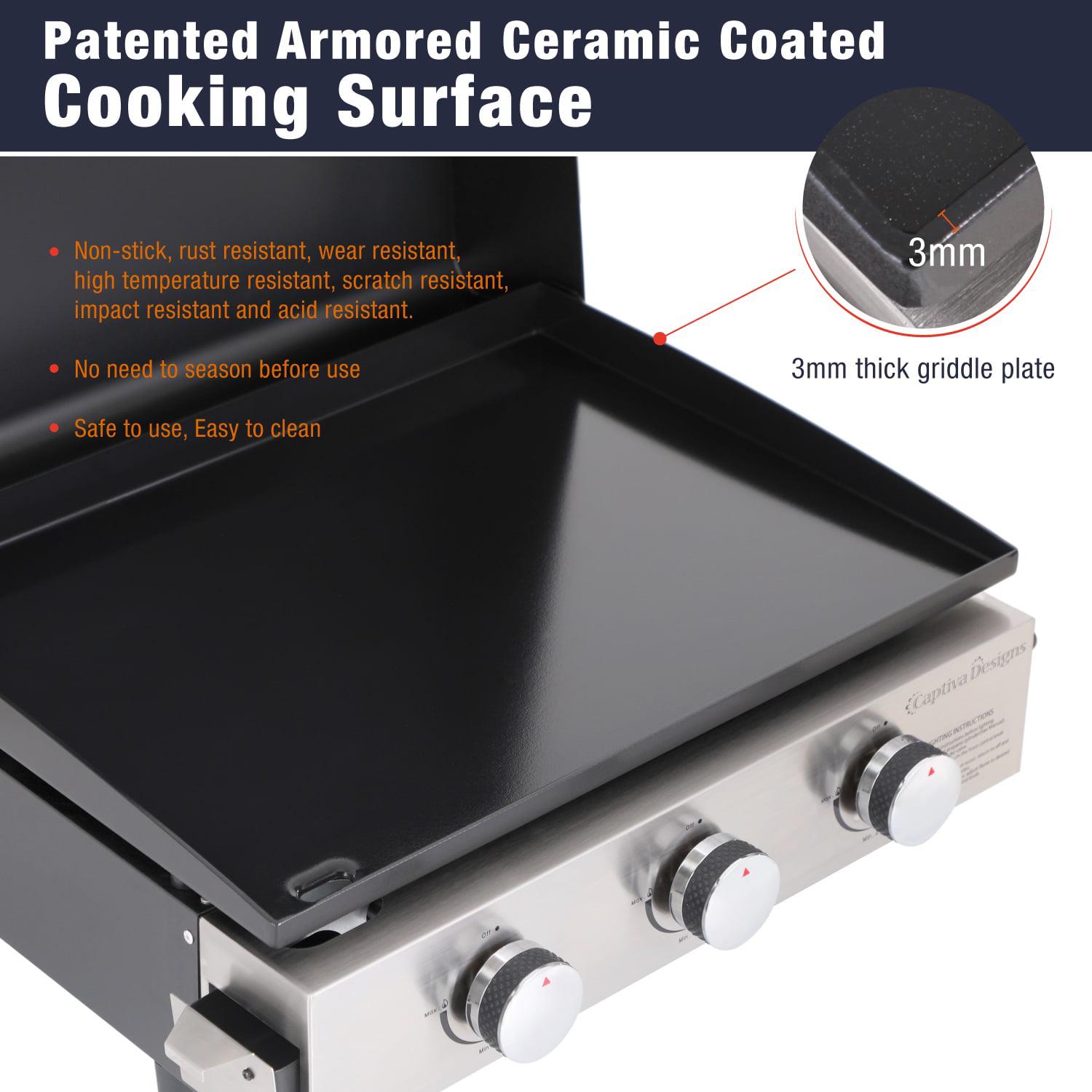 The MF Studio Propane Tabletop Griddle is the perfect cooking tool for breakfast, lunch or dinner. It comes with an armored ceramic-coated griddle plate which provides 360 square inches of cooking space. The non-stick coating is rust resistant and wear resistant for long-lasting use. Our heavy duty flat griddle equips with a solid lid to enhance stability, providing more grilling space and preventing heat loss. Featuring 3 independently stainless steel burners, this outdoor griddle is designed to provide up to 24,000 BTUs of cooking power. Adjustable control knobs for easy and quick ignition. Comes with both the valve for small gas bottle and the adapter hose for large gas tank. Portable and yard use can be switched at will. The large capacity is perfect for frying rice, eggs, hash browns, French toast, bacon and hamburgers. This outdoor grill is sure to bring many delicious meals to the table for years to come.