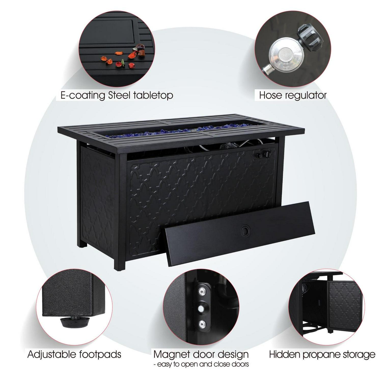 MF Studio 45″ 50000BUT Gas Fire Pit Table with Lid and Free Blue Fire Glass, Our fire pit is a versatile piece of patio furniture that you’ll find yourself using all year round. This fire pit table features is made of durable metal material and uses multiple processes to heat protection. The fire bowl and burner are made of superior stainless steel for a longer working life. This CSV approved fire table is 50,000BTU heat output by using propane fuel to provide burning without ash or smoke. The flame is adjustable to meet your needs. It also equipped with Automatic Gas Cut-Off Device which will prevent gas leakage for safety use. When not burning, it can be used as an outdoor dining table by covering the removal lid.