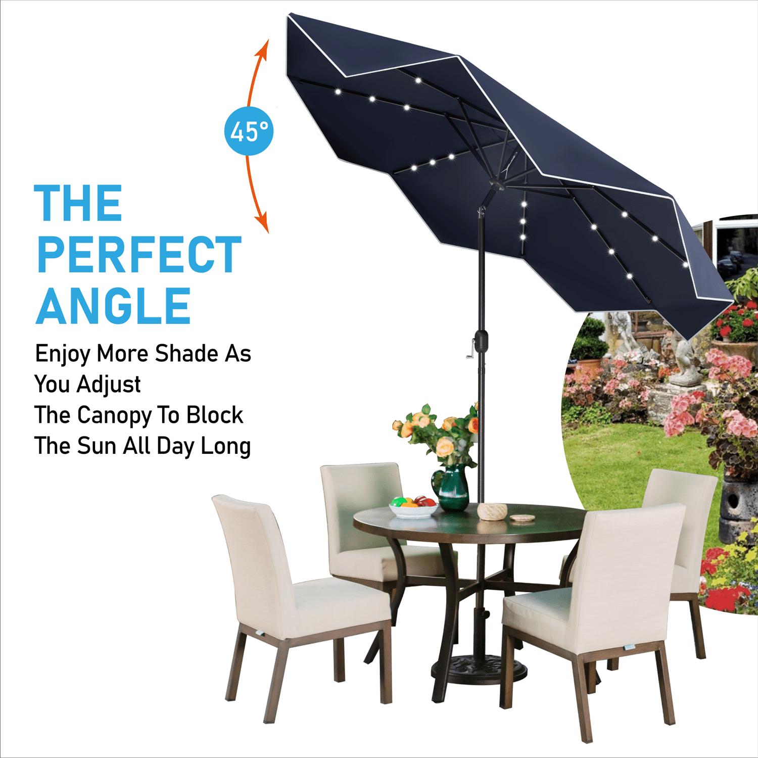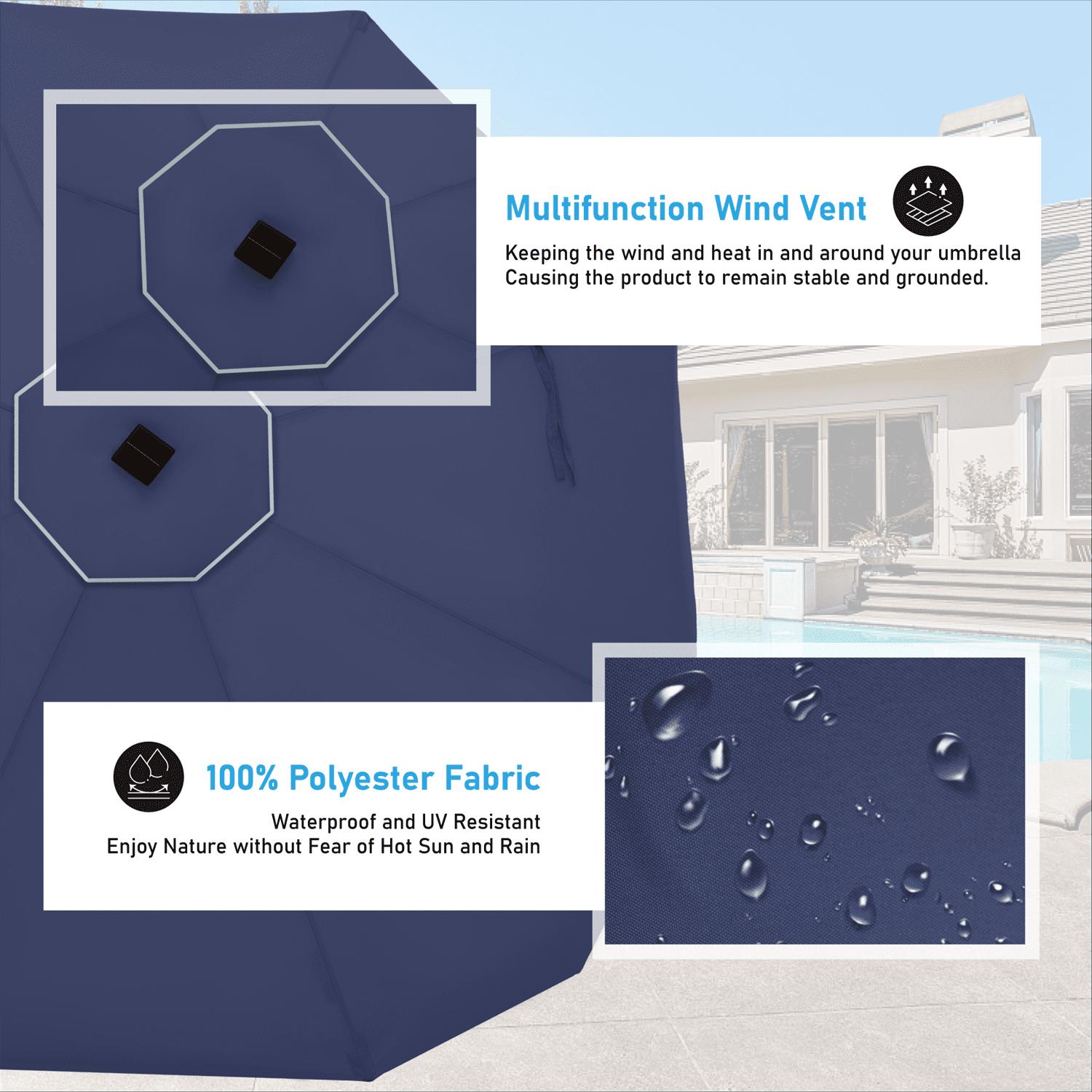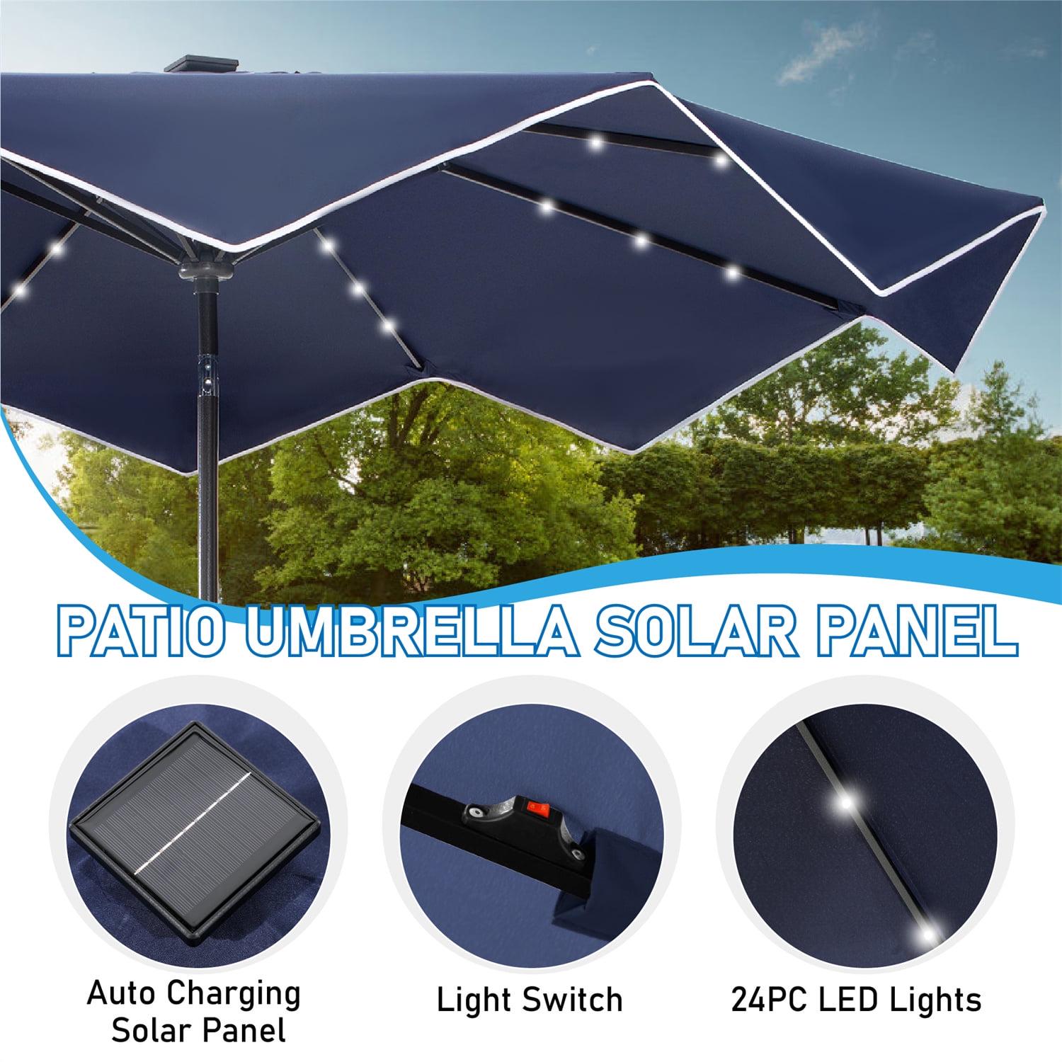 – With 24 LED Solar Lights Equipped with 3 LED lights on each rib, this outdoor umbrella has a total of 24 built-in LED lights to help keep bright or create a romantic atmosphere at night. More importantly, the lamps are powered either by solar panels or battery, thus can provide lighting even in cloudy days.