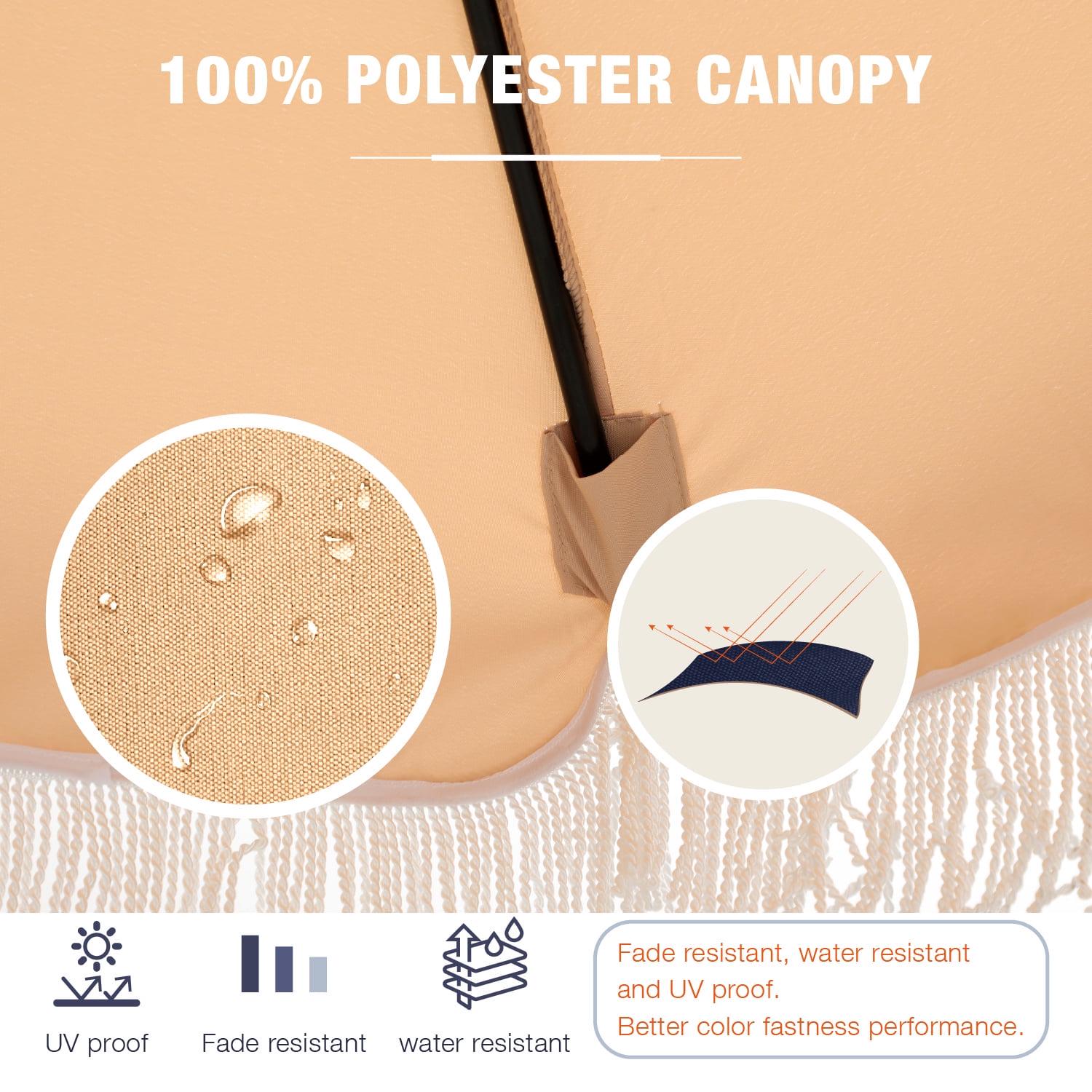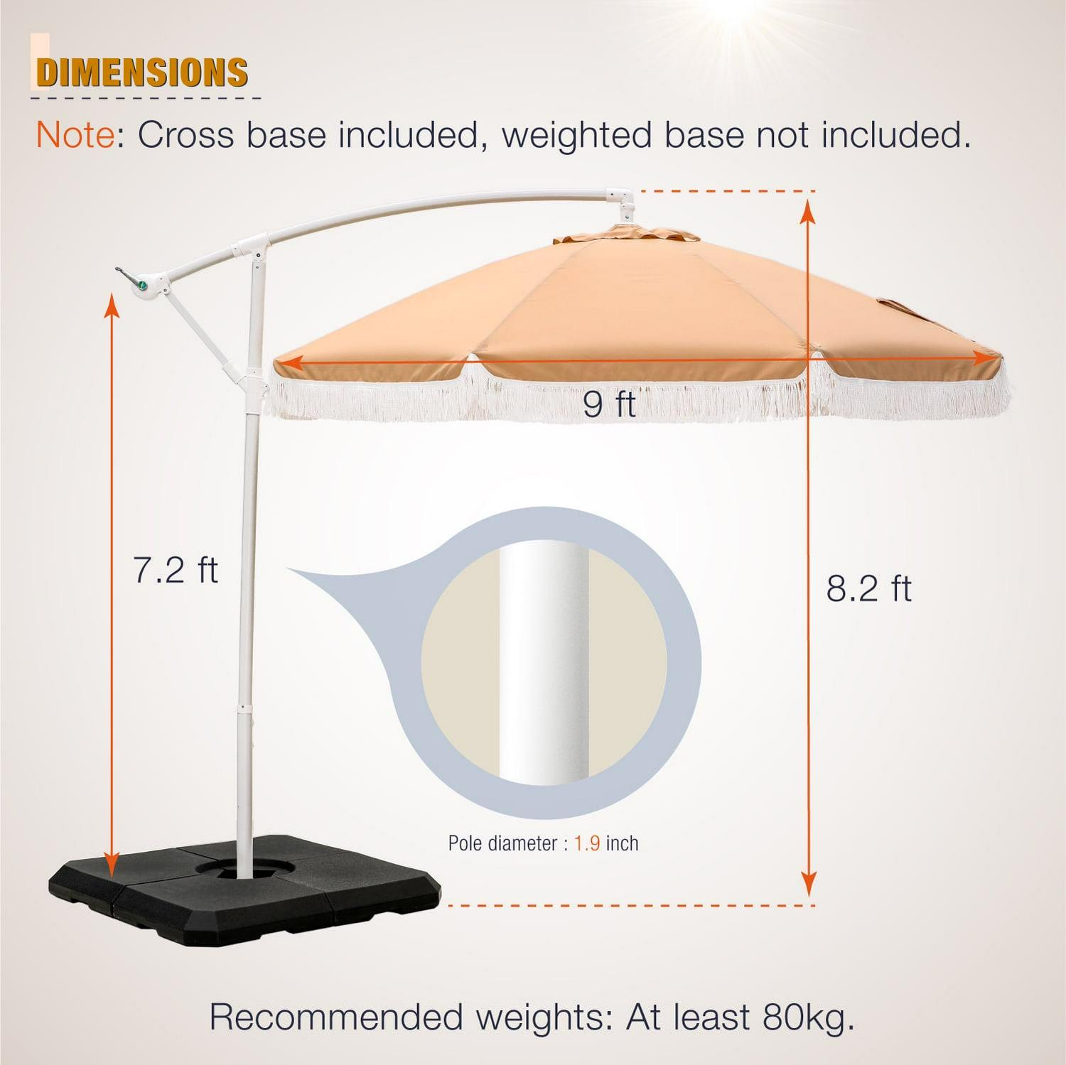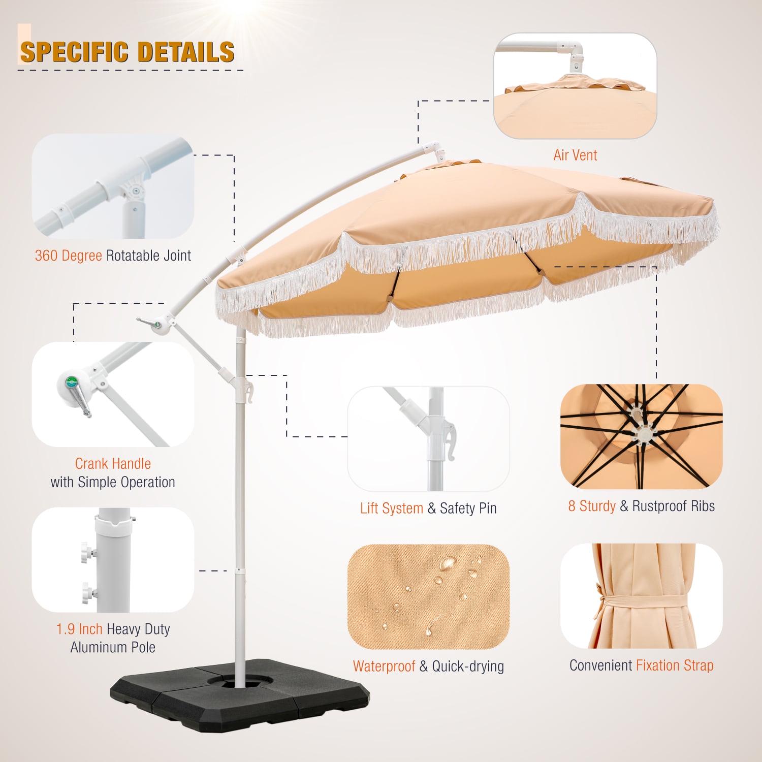 Enhance your outdoor aesthetic with our brand new tassel designed offset cantilever patio Umbrella. With 8 reliable sturdy fiberglass ribs and powder coated aluminum pole, this hanging patio umbrella is rust-resistant, can provide strong and durable support for the umbrella canopy. Wind vent at the top to allow air and heat flow, reduce wind pressure to enhance stability and create cool experience. 100% polyester fabric canopy, water-repellent, UV resistant and fade-resistant. A smooth-turning crank make you easy to open or close the umbrella. Moreover, beautiful tassel edge umbrella will add a fresh look and unique appearance to your patio or outdoor space. Ideal for the backyard, lawn, and garden. Transform your ordinary day outdoor to an exotic vacation with our tassel fringe umbrella.
