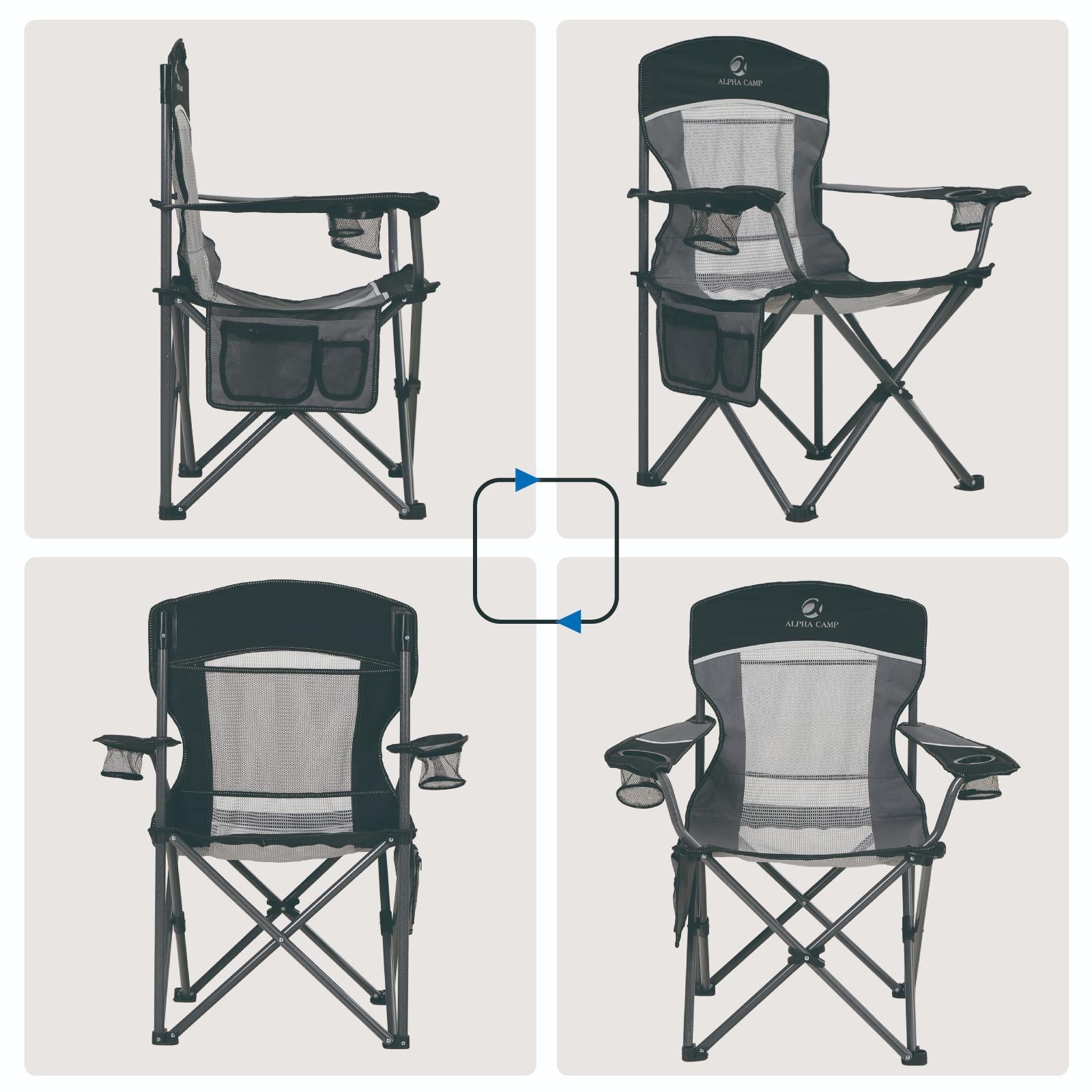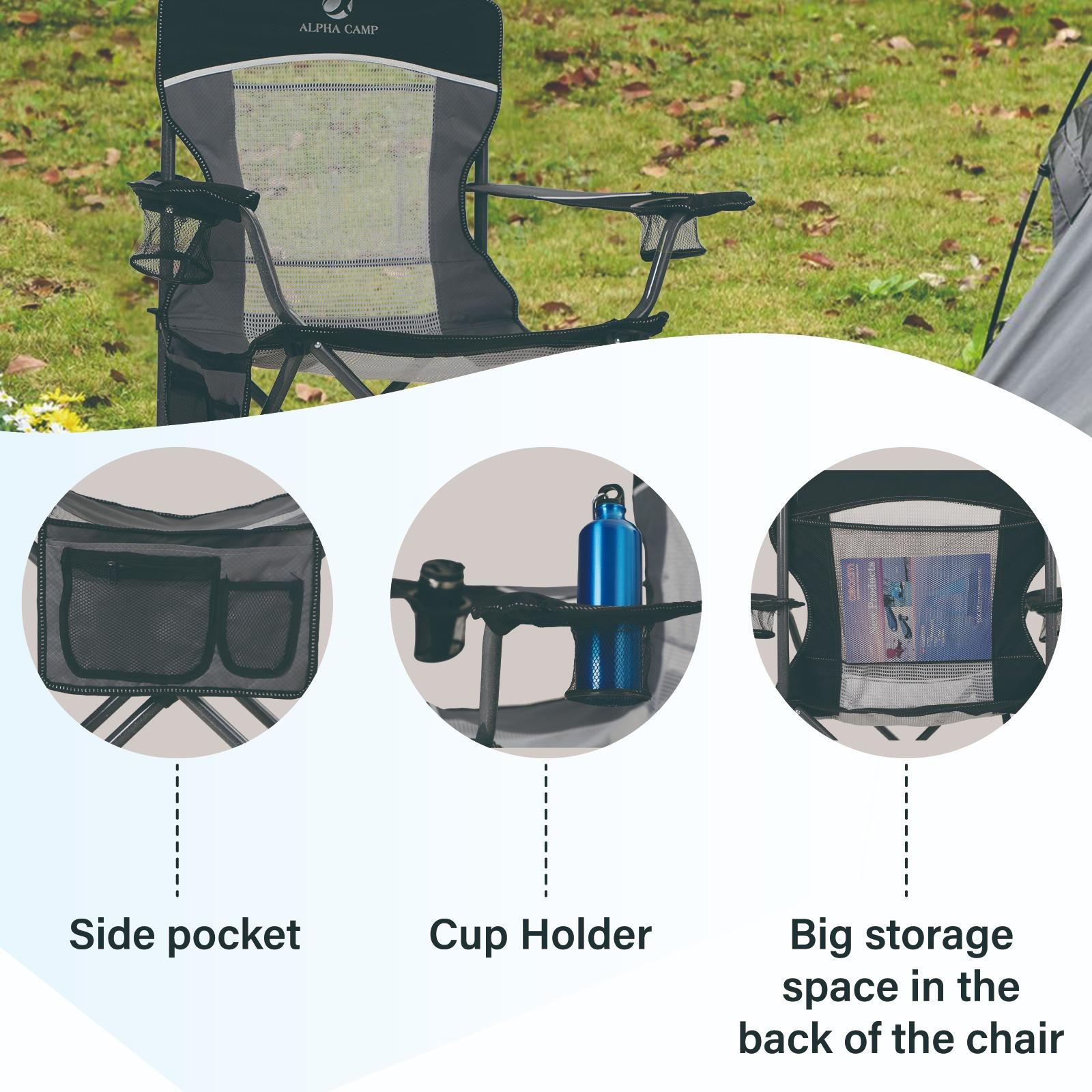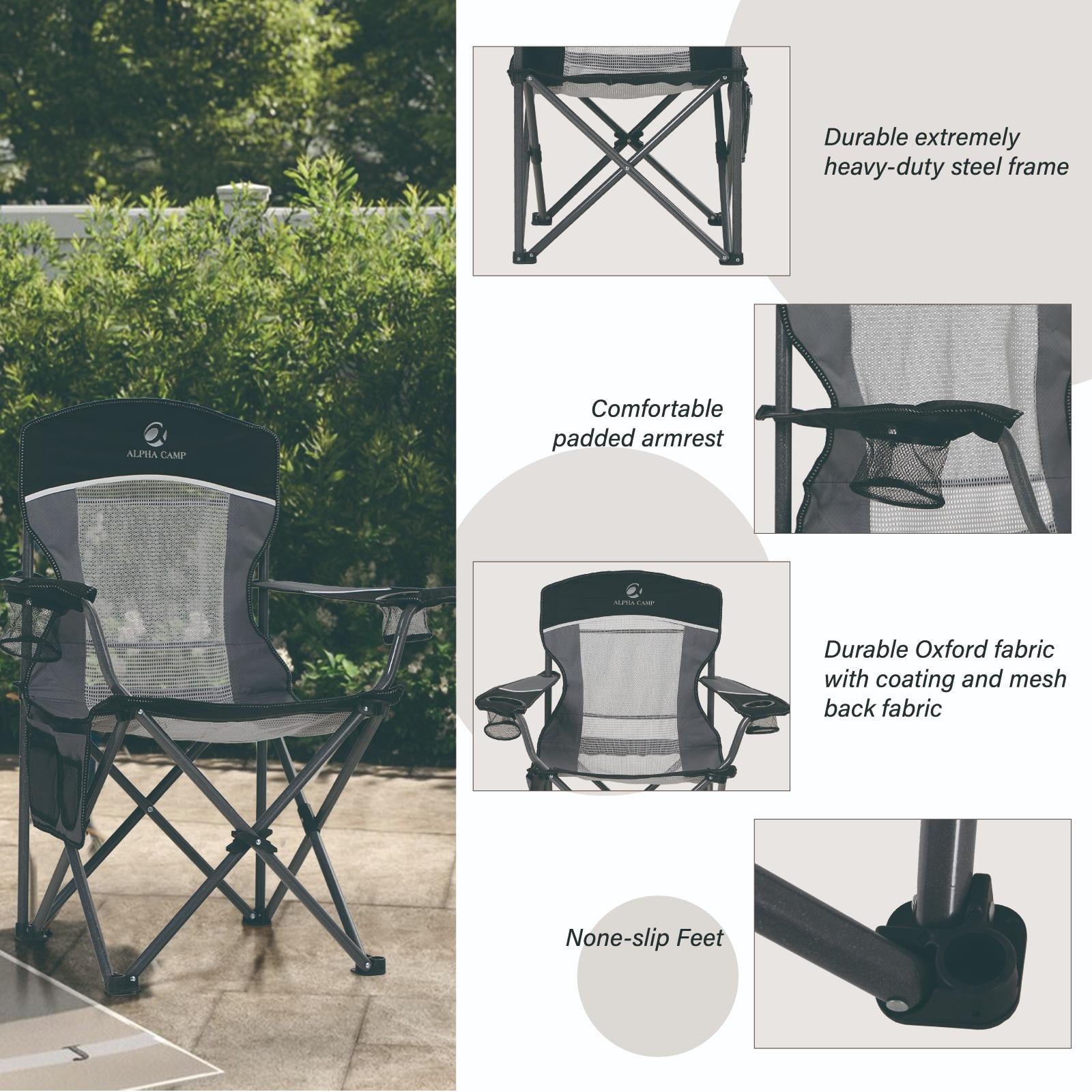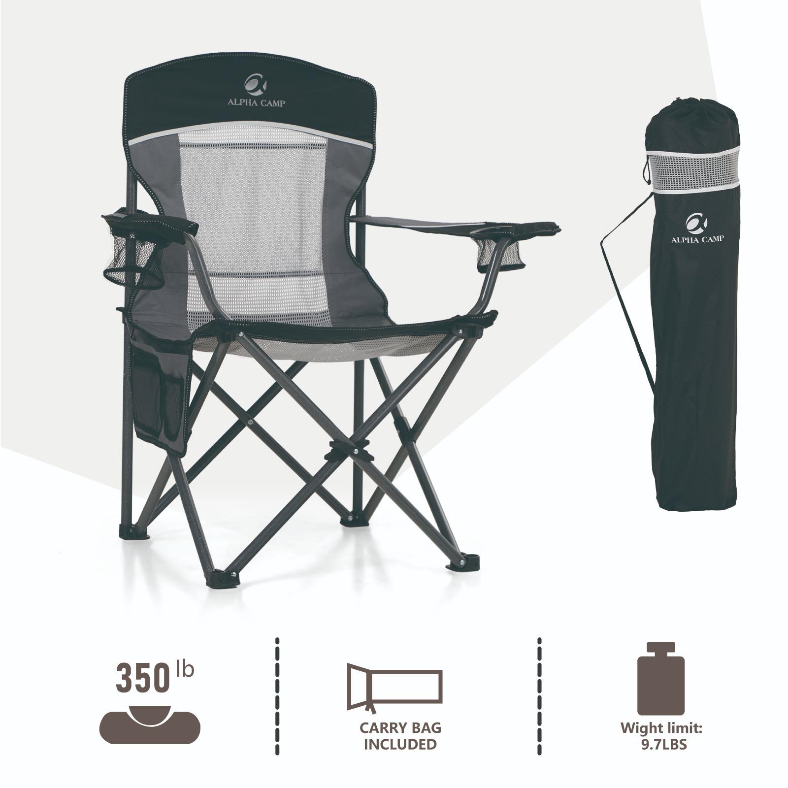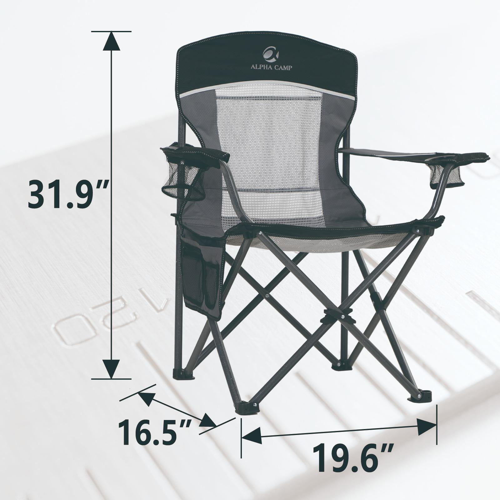 MF Studio Camping Chair, Black: Large Size: 37″ x 22″ x 40.1″ Powder-coated steel frame with durable Oxford fabric. All the materials are treated for weather-resistant Durable oxford fabric with coating assure water and stain resistance and mesh back fabric keeps ventilation well. With bigger size feels more comfortable and the mesh keeps you cool Extra-large storage spaces: Side zipped pocket to hold your cell phone and other personal goods; 2 durable mesh cup holders; Large pocket in the back of the chair Two built-in mesh cup-holders to keep all your favorite drinks nearby Perfect chair for a variety of outdoor activities like camping, tailgating, or watching sporting events No assembly required, easy to fold and open up in seconds, portable with a carry bag for easy carriage and storage Material: Thick oxford cloth Fabric: Oxford Weight: 9.7LBS Package Includes: 1 x Big boy XL chair; 1 x Carry bag