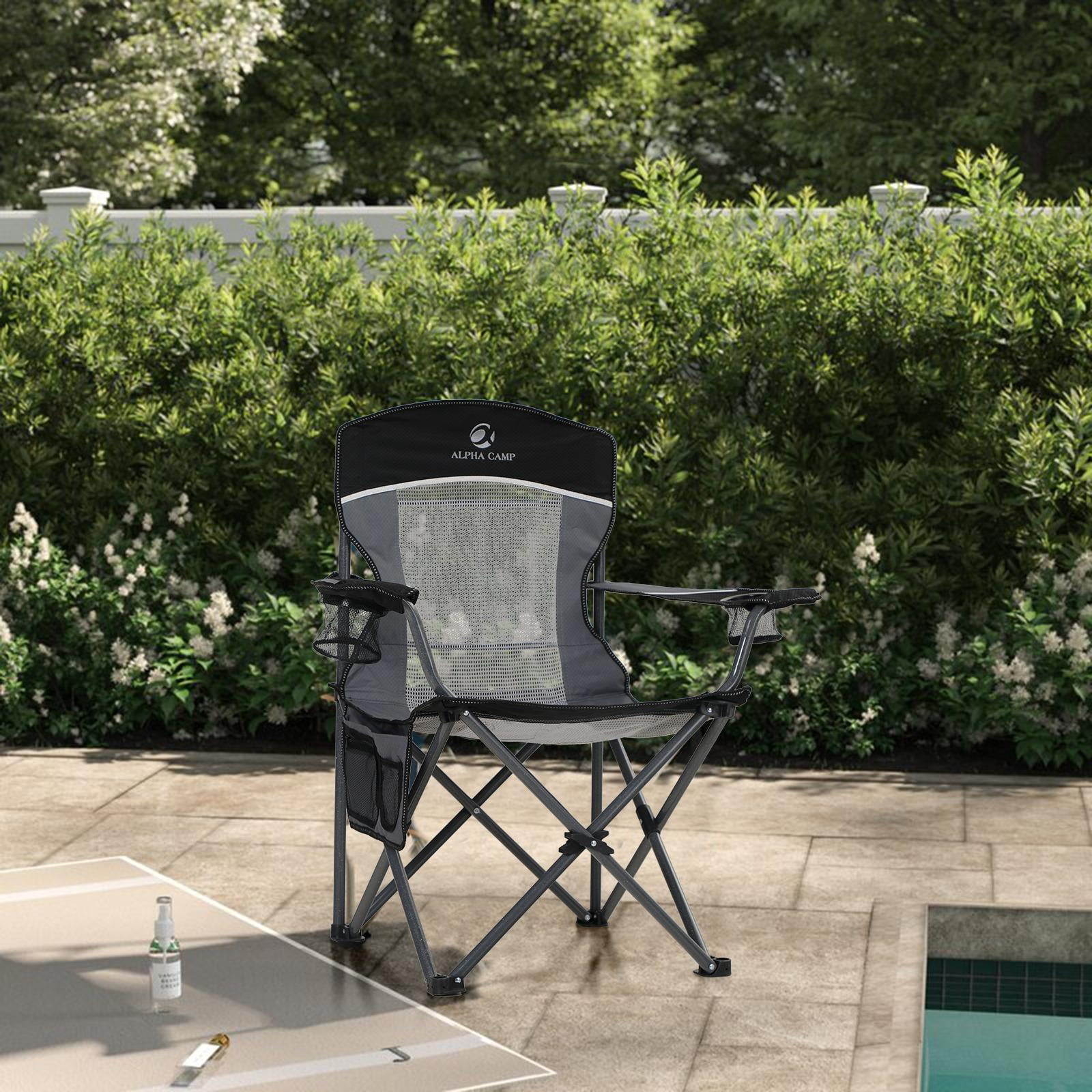 Enjoy the ultimate comfort experience in the MF Studio Oversized Mesh Chair. This camping chair features a heavy-duty steel frame, which allows this chair to support up to 350 lbs. To meet your patio needs, this chair comes with two cup holders. One holds a larger 32-ounce drink, while the other holds a standard cup size. Padded armrest and oversize frame to ensure the comfort of this chair. The MF Studio Oversized Mesh Chair with cup holder is the perfect chair for any camping trip, concert, sporting event or just to have at home on your patio!