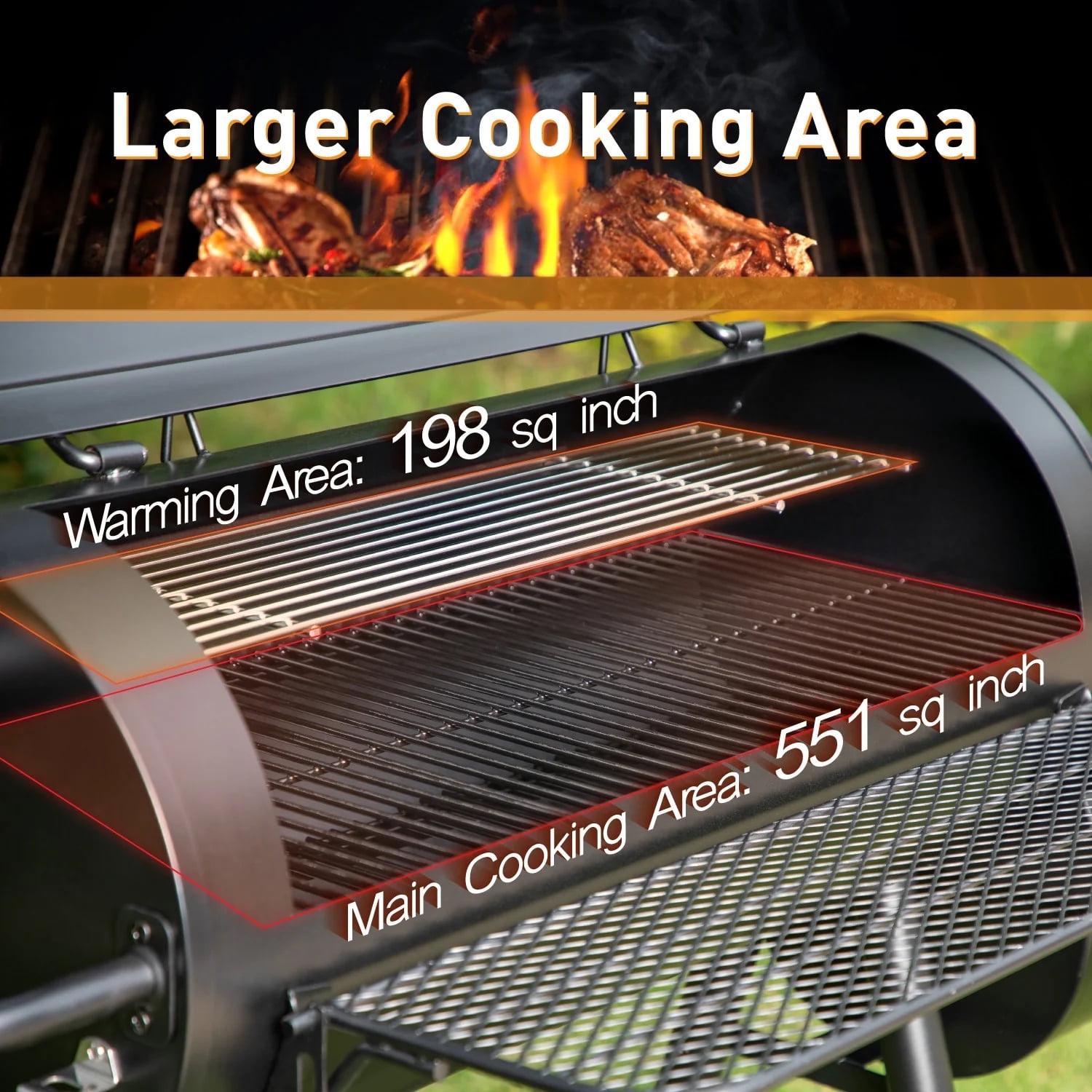 – Extra Large Cooking Area There are 3 different cooking areas to meet various cooking needs. A total of 941 sq. in. cooking surface includes 551 sq. in. primary smoking area, 198 sq. in. removable warming rack and 192 sq. in. offset smoker.