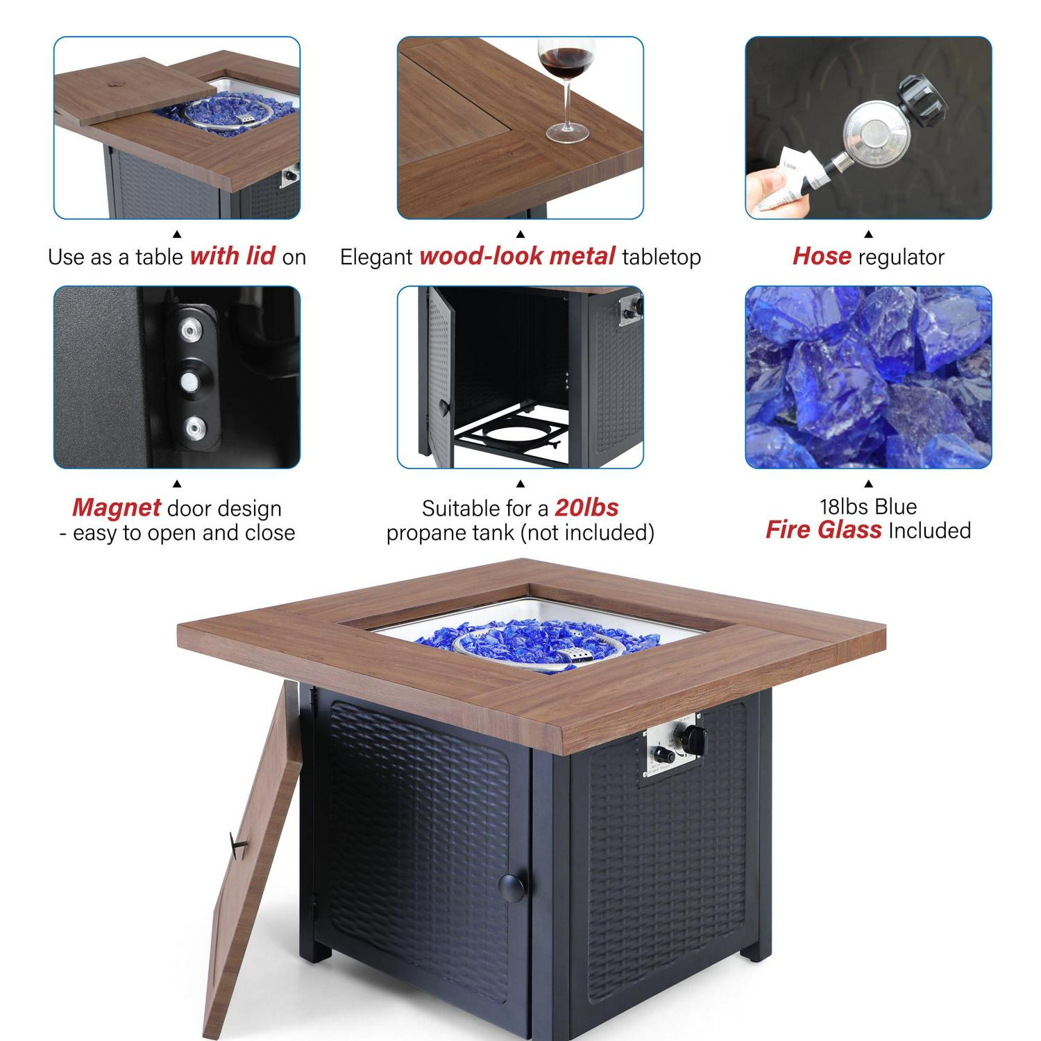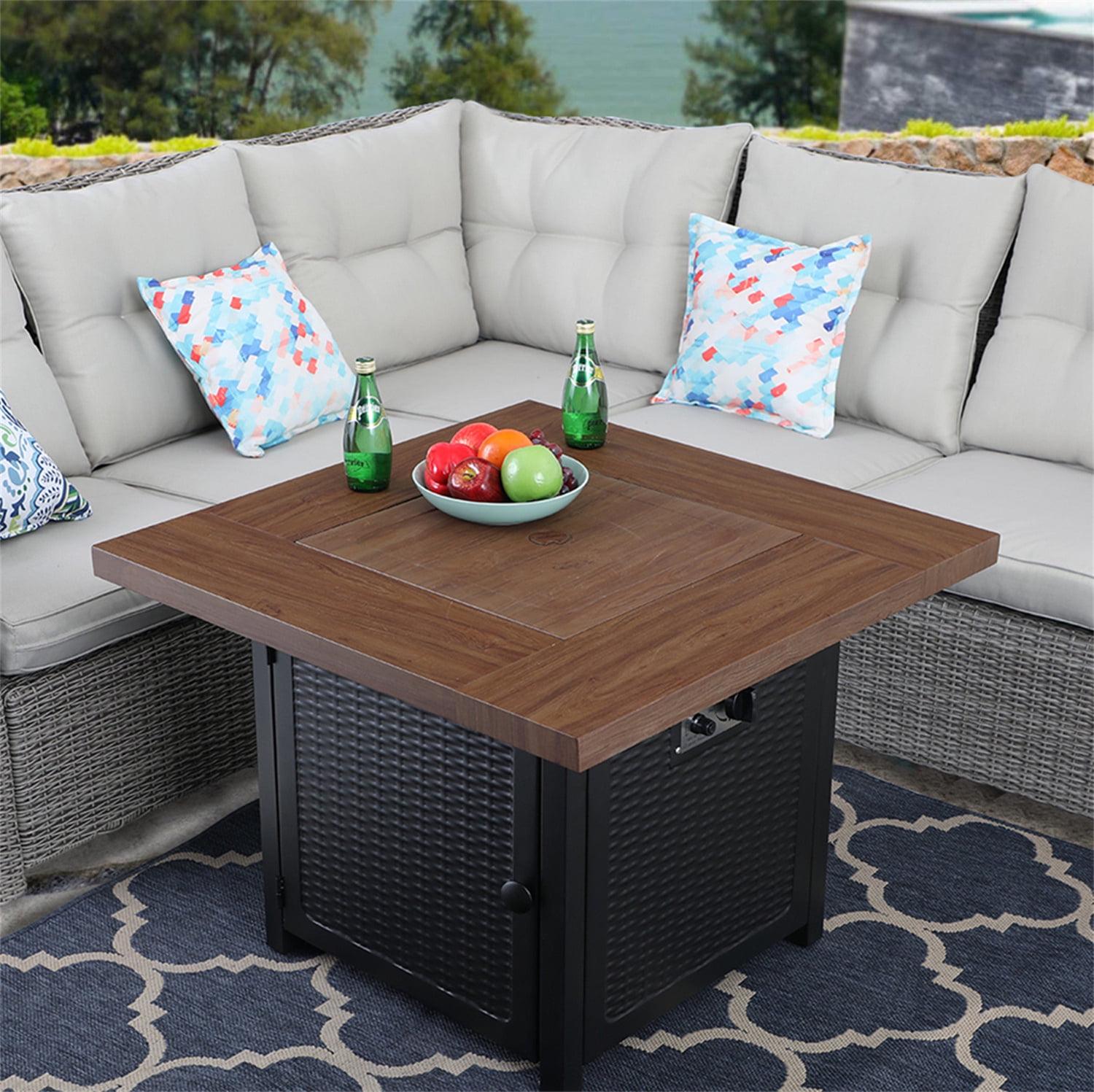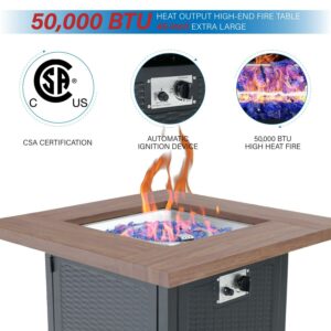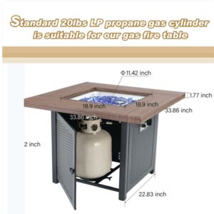 MF Studio Gas Fire Pit Table, 34 50,000BTU Outdoor Progane Firepits for Outside 2 in 1 auto-Ignition Square Patio Fireplace with Blue Fire Glass and Lid, Wood-Like Top
