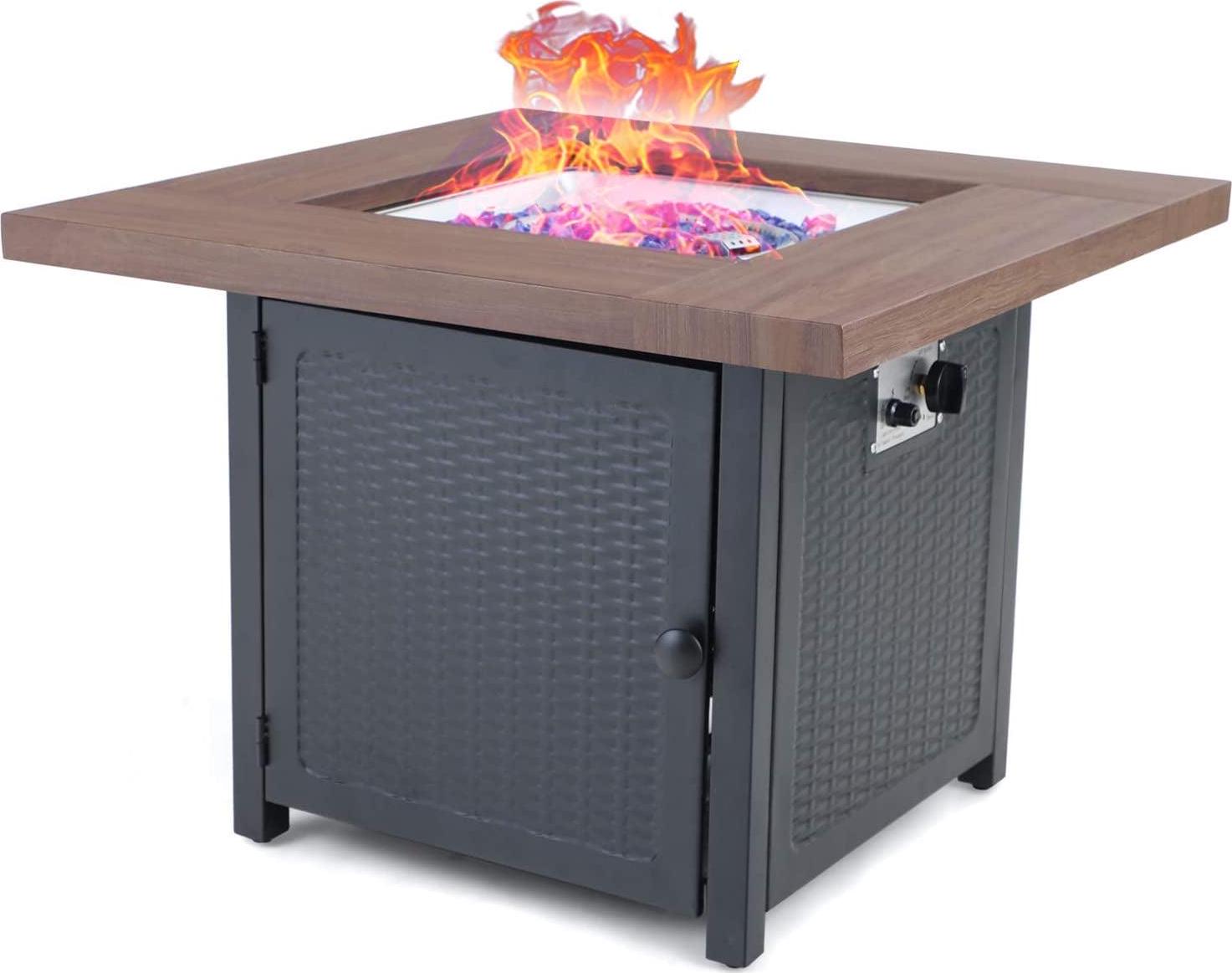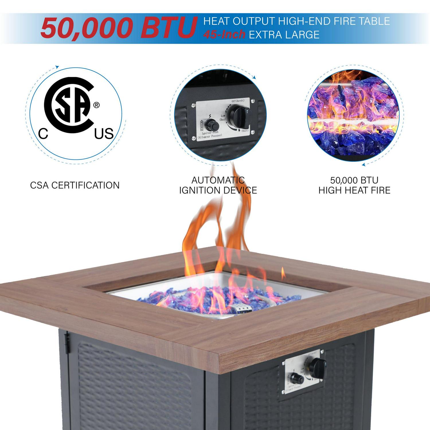 – Our outdoor fire tables are 50,000BTU heat output by using propane fuel to provide burning without ash or smoke.