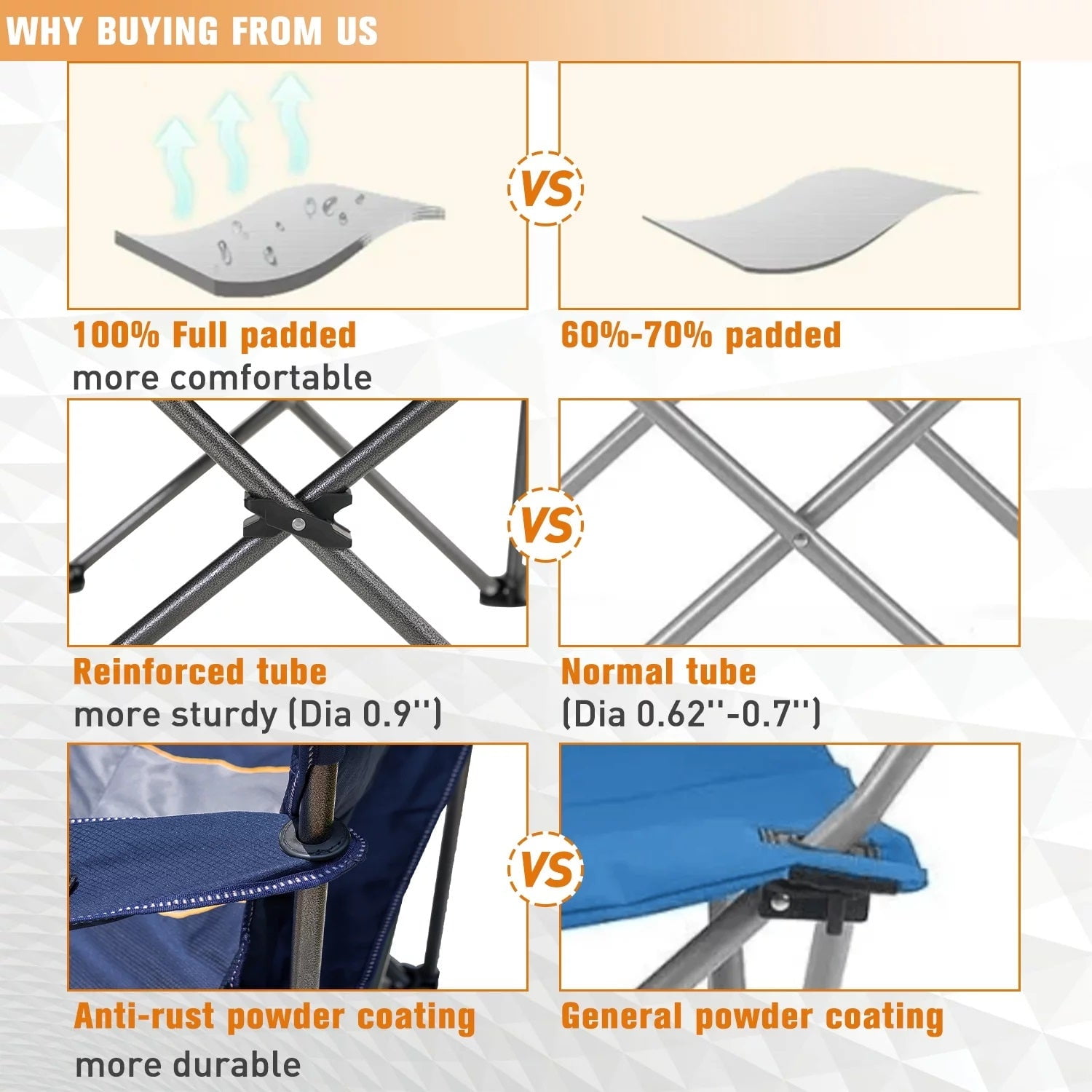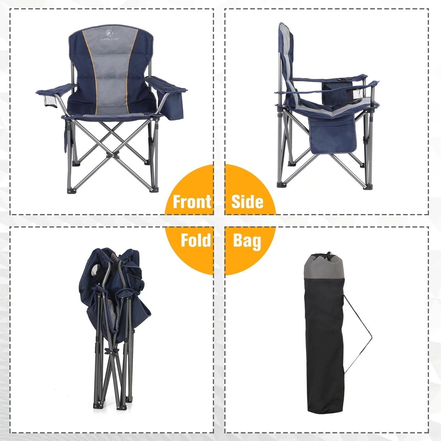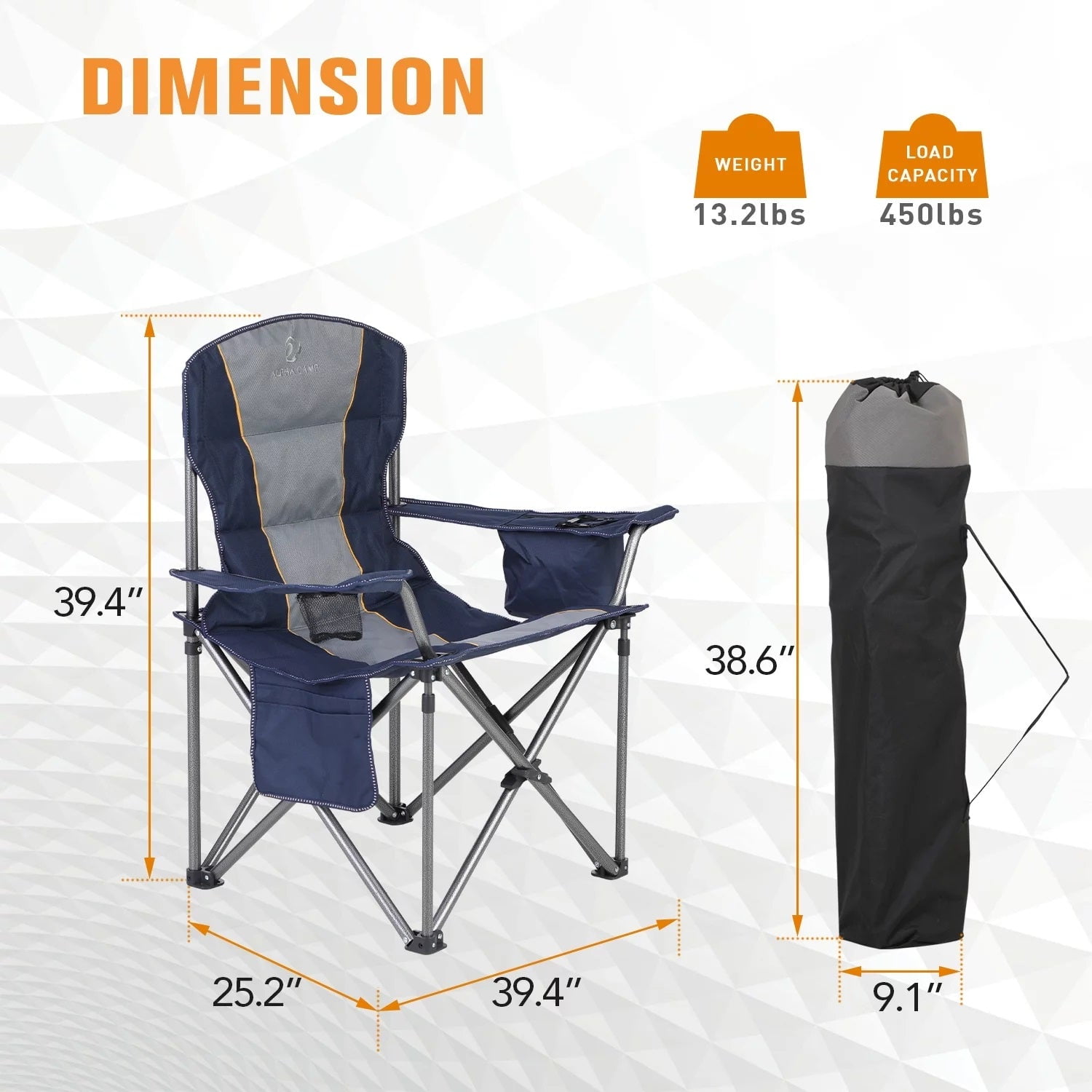 Constructed of heavy-duty steel frame with reinforced tube allows this chair to support up to 450 lbs; Large and wide seat area with 600x300D padded oxford fabric and padded armrest ensure comfort of this chair; With hammer tone, powder coating prevents corrosion and fading; Four additional steel frames increase stability and bearing capacity; Our camping chair comes with two cup holders, a side storage pocket, and a cooler bag; Suitable for any adults.