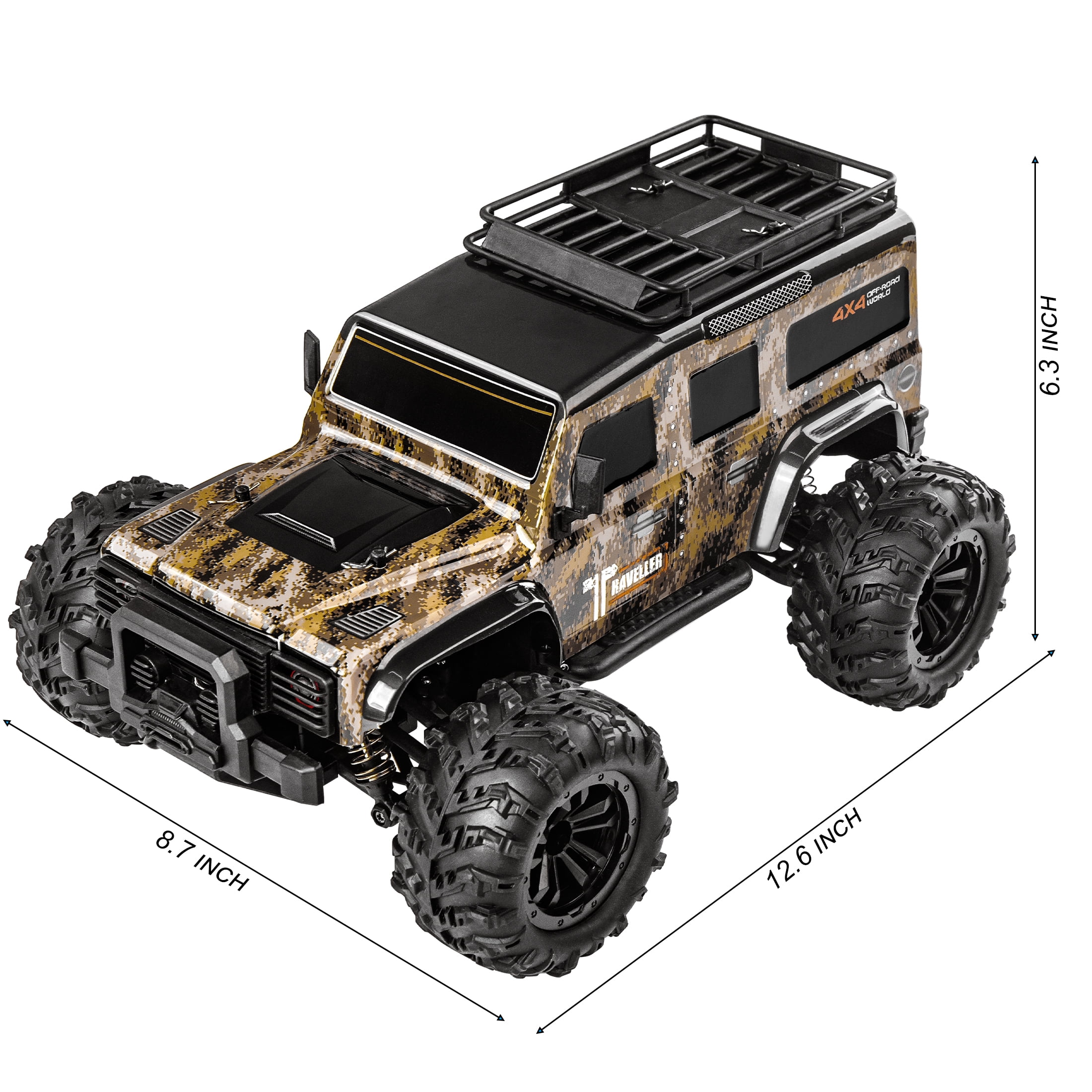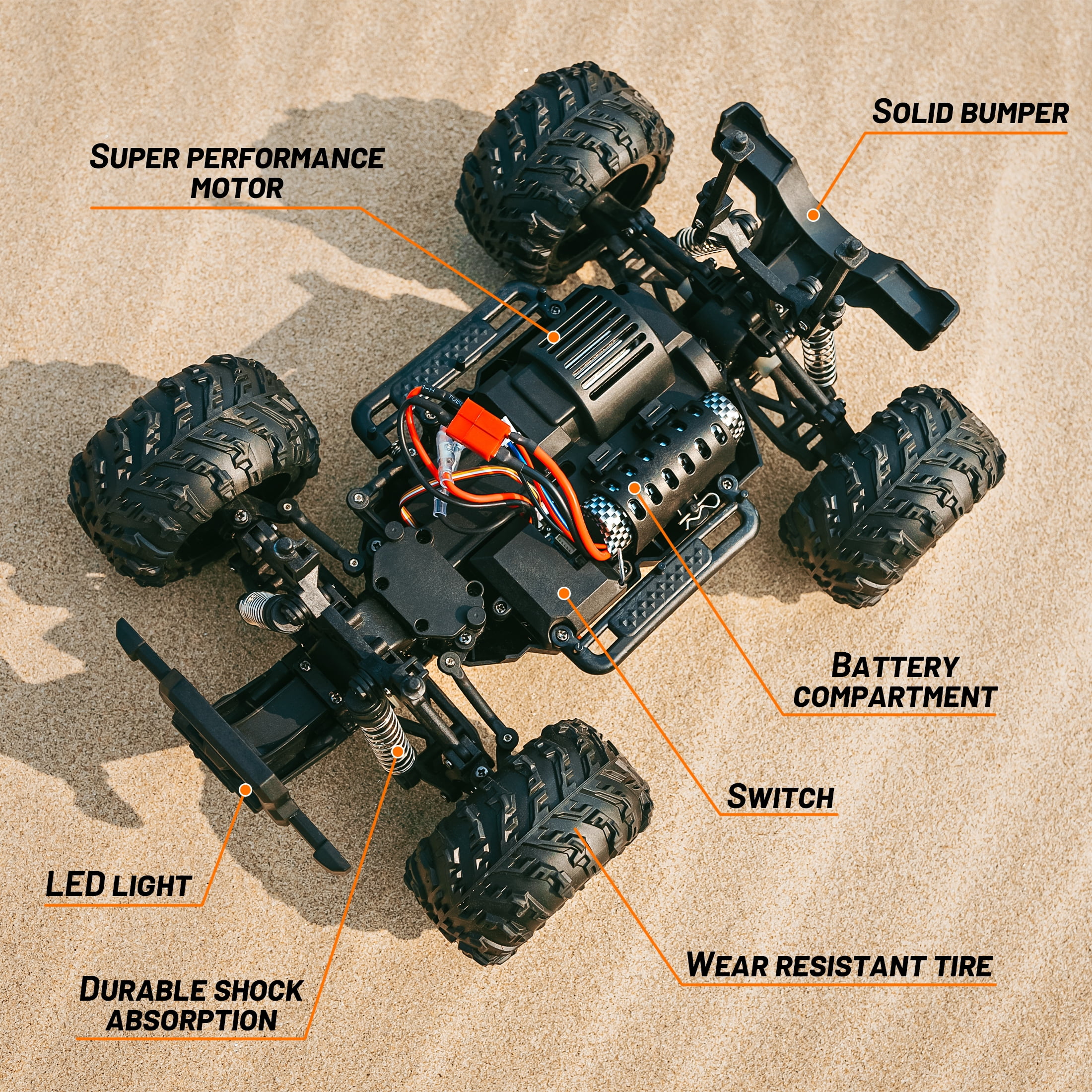 Superb and fast brushed RC 390 motor- this 4WD rc trucks Rampage speeds topping to 36 KPH, which finds operators in marvelous enjoyment. Hobby class design with classic ball bearings-solid gear diff., independent suspension. This rc monster truck is durable, speedy, funny and yet affordable, which is advisable to be toys gifts for boys and adults. 2.4GHz full-function proportional radio control system-suffices a stable control range within 328 feet. Reliable transmission forward, brake and reverse would never fail. Splash waterproof electronic components make a all-terrain vehicle out of this truck. No worries to run this remote control cars on grassland , sands, and bumpy grounds. Flexible and solid PVC truck body-high grip knobby off-road tires, and equipped with two long-time service 7.4V Li battery among which the one is pre-installed in the vehicle, and one qualified USB charger, our remote control truck comes in 99% Ready-To-Run version. Take it out, and get it moved immediately. What’s in the gift color box? RC monster truck Charging Cable 2 rechargeable batteries Remote control User Manual Screwdriver