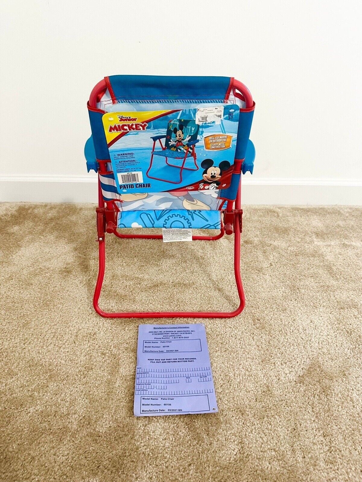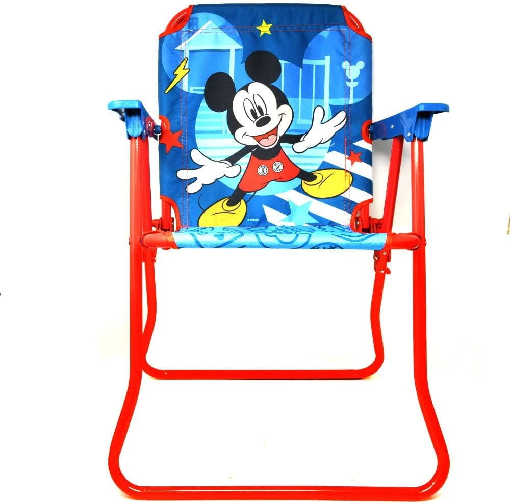 Mickey Mouse Club House Patio ChairMickey and the roadster racers patio chair has colorful character graphics and is great for indoors or outdoors. Sturdy metal tubular construction. Folds for easy storage. Each chair has a safety locking mechanism. No assembly required. For ages 3+ Product Details: Recommended for Ages: 3 years and up; Weight Limit: 60lbs; Washable surface: (please see care label for instructions); Folds flat for easy storage; Colorful character graphics; No assembly required ; Folds for easy storage ;