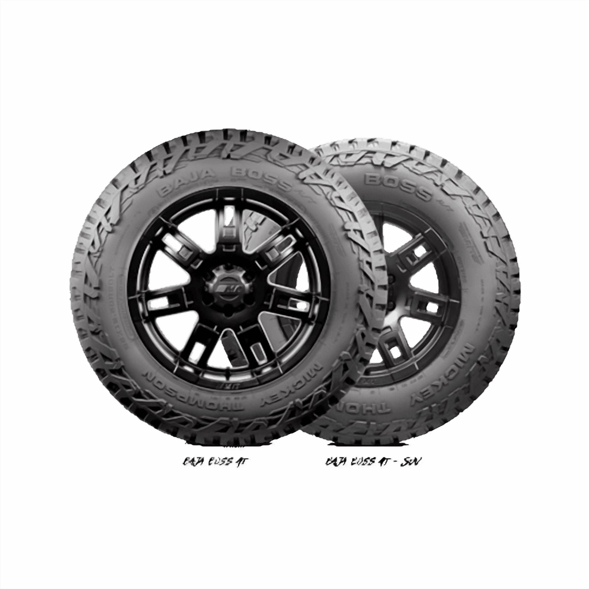 The Mickey Thompson Baja Boss A/T is the ultimate rugged all-terrain tire, delivering top-tier performance on and off the road. This tire is engineered for drivers who need confident off-road traction without sacrificing comfort on pavement. It is ideal for trucks and SUVs that see both highway and trail use. Engineered for SUVs, light trucks, and Jeeps, this aggressive yet refined tire features an asymmetrical tread design for superior handling, reduced road noise, and exceptional all-weather traction. Its silica-reinforced compound enhances wet grip, braking performance, and resistance to cuts and chips, while the PowerPly XD construction provides added puncture resistance, improved handling, and quicker steering response. For off-road enthusiasts, the Baja Boss A/T boasts 150% deeper Extreme Sidebiters® than the Baja ATZ P3, offering maximum traction, sidewall protection, and a bold, rugged appearance. It’s severe snow service rated (3PMS symbol) in sizes 12.50 (315) and narrower, ensuring reliable winter performance. With a 50,000-mile limited treadwear warranty (LT-metric sizes) or 60,000 miles (select sizes), this tire is built to last, making it a versatile and durable choice for those who demand superior all-terrain capability. This tire also delivers a composed ride on the highway. Noise-reduction patterns help maintain road comfort, while the reinforced sidewall construction adds durability and confidence under load or while towing. Best-suited for: Trucks, off-road SUVs, lifted crossovers, and light-duty trail use. Tire Best Features: Deep tread blocks and open shoulders provide off-road bite. Stone ejectors prevent debris retention and enhance durability Reinforced sidewalls protect against cuts and impacts On-road tread design reduces noise for pavement use All-terrain capability for mud, dirt, and uneven surfaces
