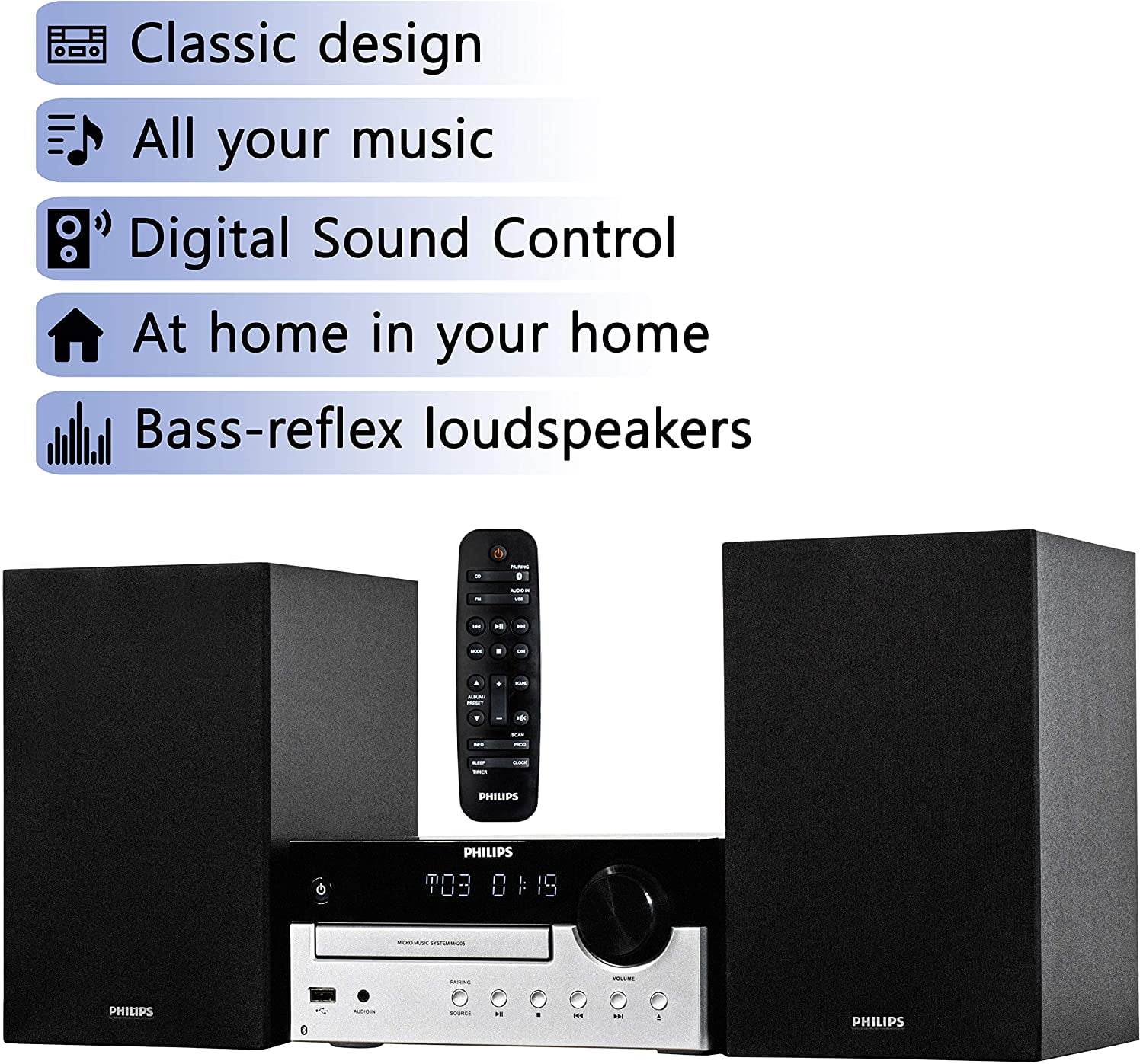 Philips Bluetooth Stereo System for Home with CD Player, MP3, USB, Audio in, FM Radio, Bass Reflex Speaker, 60W, Remote Control Included All your music – This stylish micro system lets you stream playlists and more via Bluetooth, play CDs and listen to FM radio. The digital radio tuner with 10 presets delivers clear reception, and the CD player can read MP3 CDs and recorded CDs. Bass-reflex loudspeakers. Richer low tones – These bookshelf-style loudspeakers give you clear sound and good bass thanks to the combination of woofer, tweeter, and bass-reflex ports. A 60 W maximum output brings big sound to any room. Perfect for a lounge or open-plan living space. Classic design – The two-tone central unit and speaker cabinets recall the design of hi-fi separates. The textured volume-control dial adds a satisfying analog feel to operation. There are buttons on the front of the unit for playback and source selection. Digital Sound Control. Choose a preset sound style – Hip-hop or choral, symphony or rock opera? Whatever you love, this micro system’s Digital Sound Control function lets you enjoy it more. Pick from preset sound styles designed to bring out the best in your music. At home in your home – This AC-powered micro system looks great in any room. Bluetooth wireless range is 10 m, and you can charge a smart device via the USB port. An easy-to-use remote puts key functions at your fingertips.