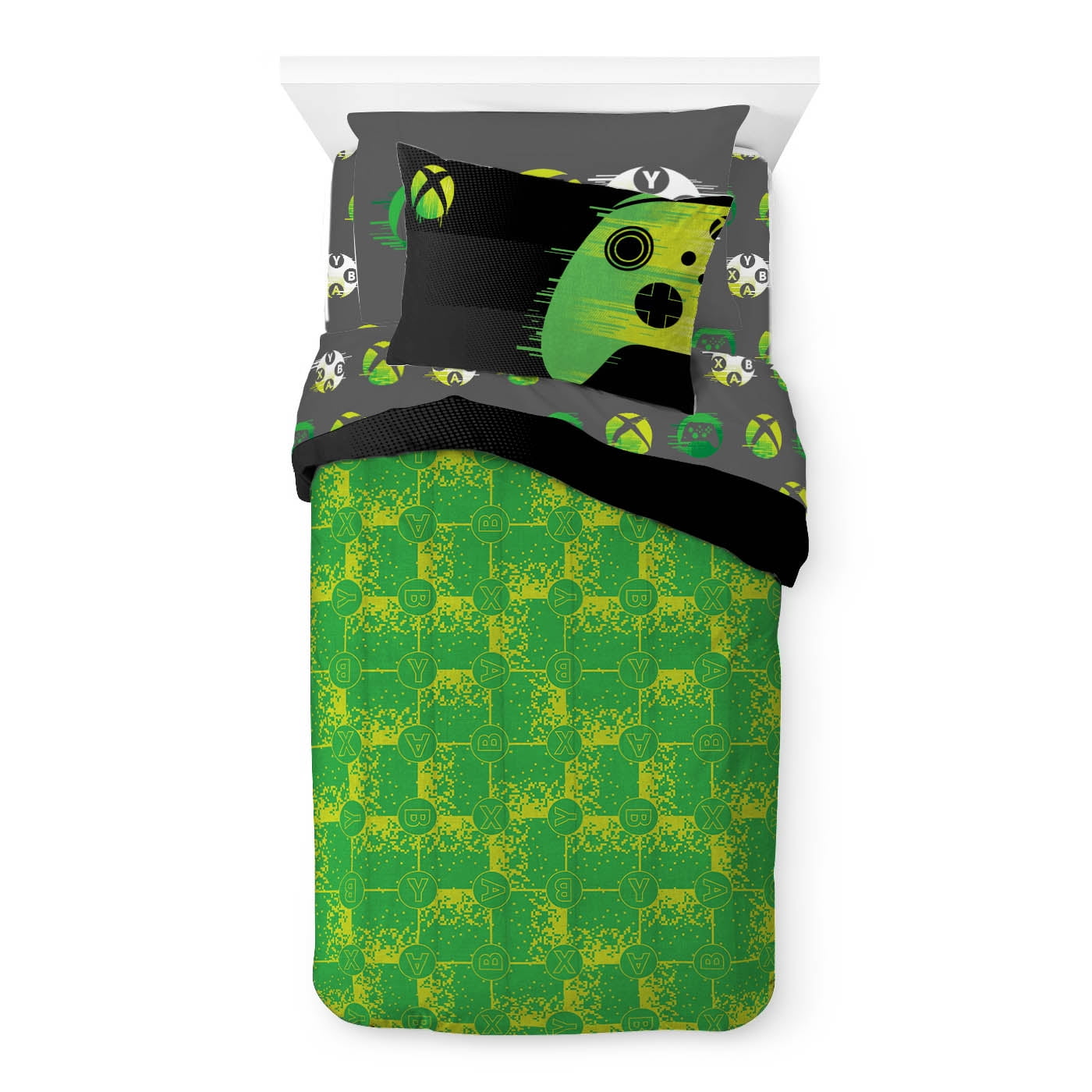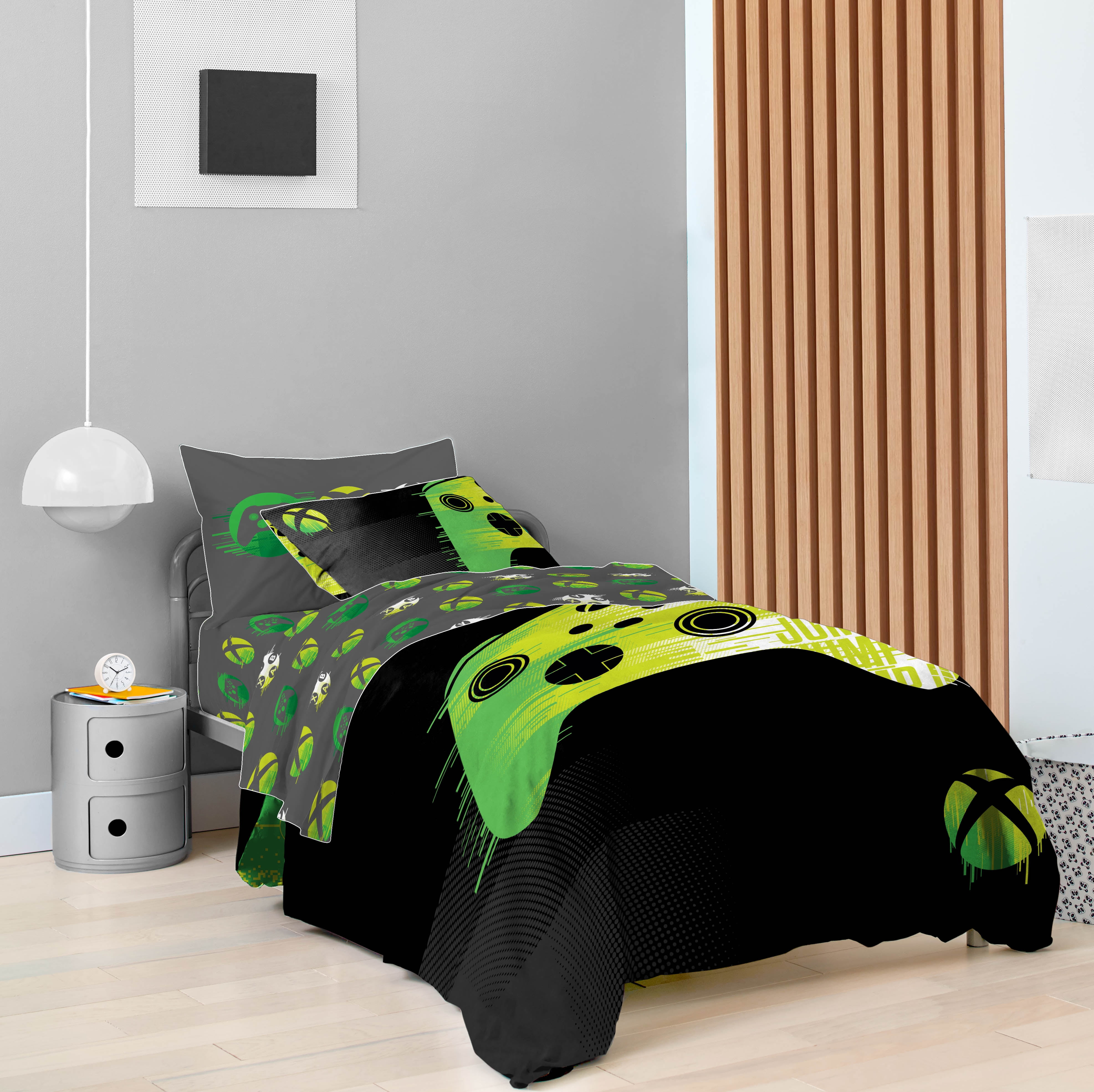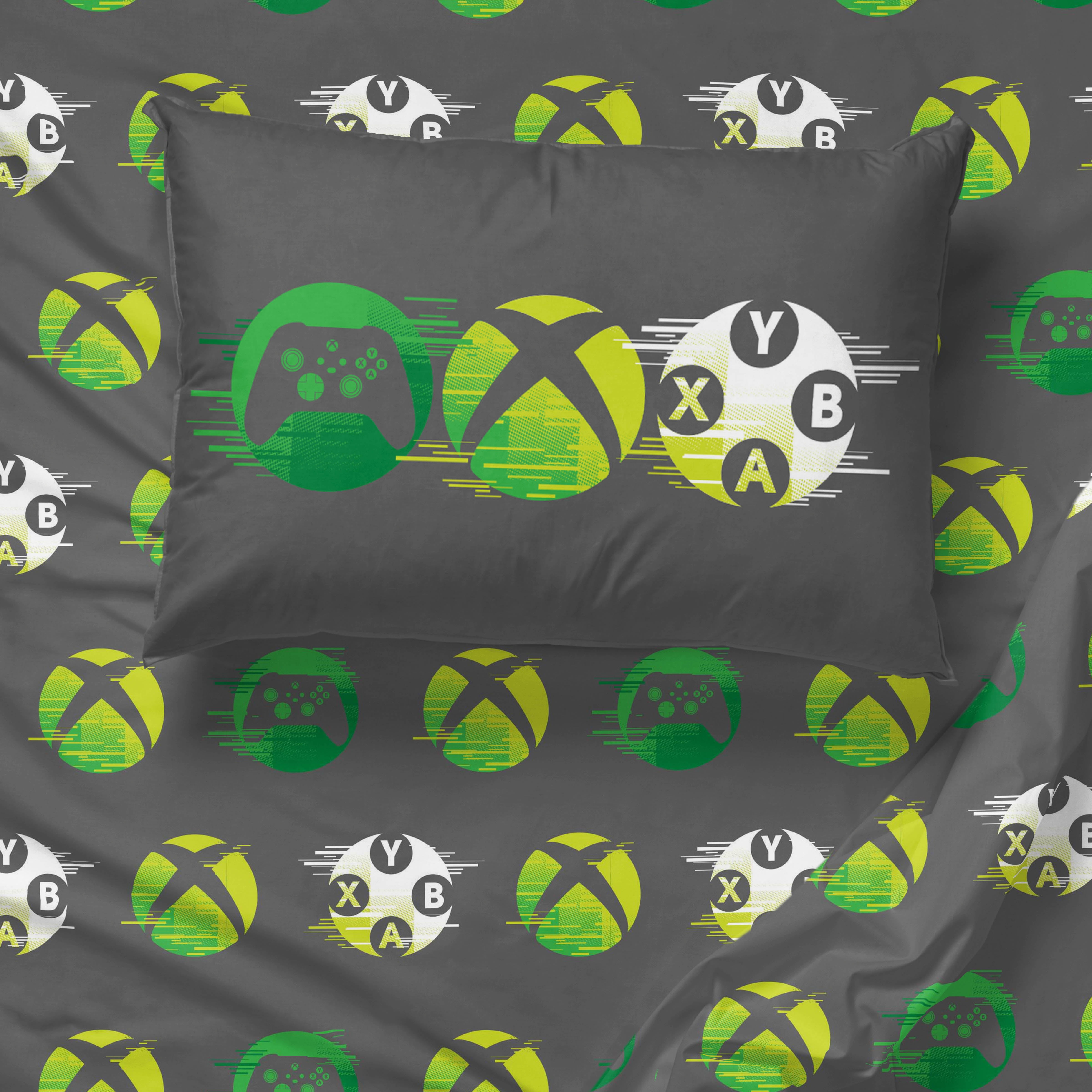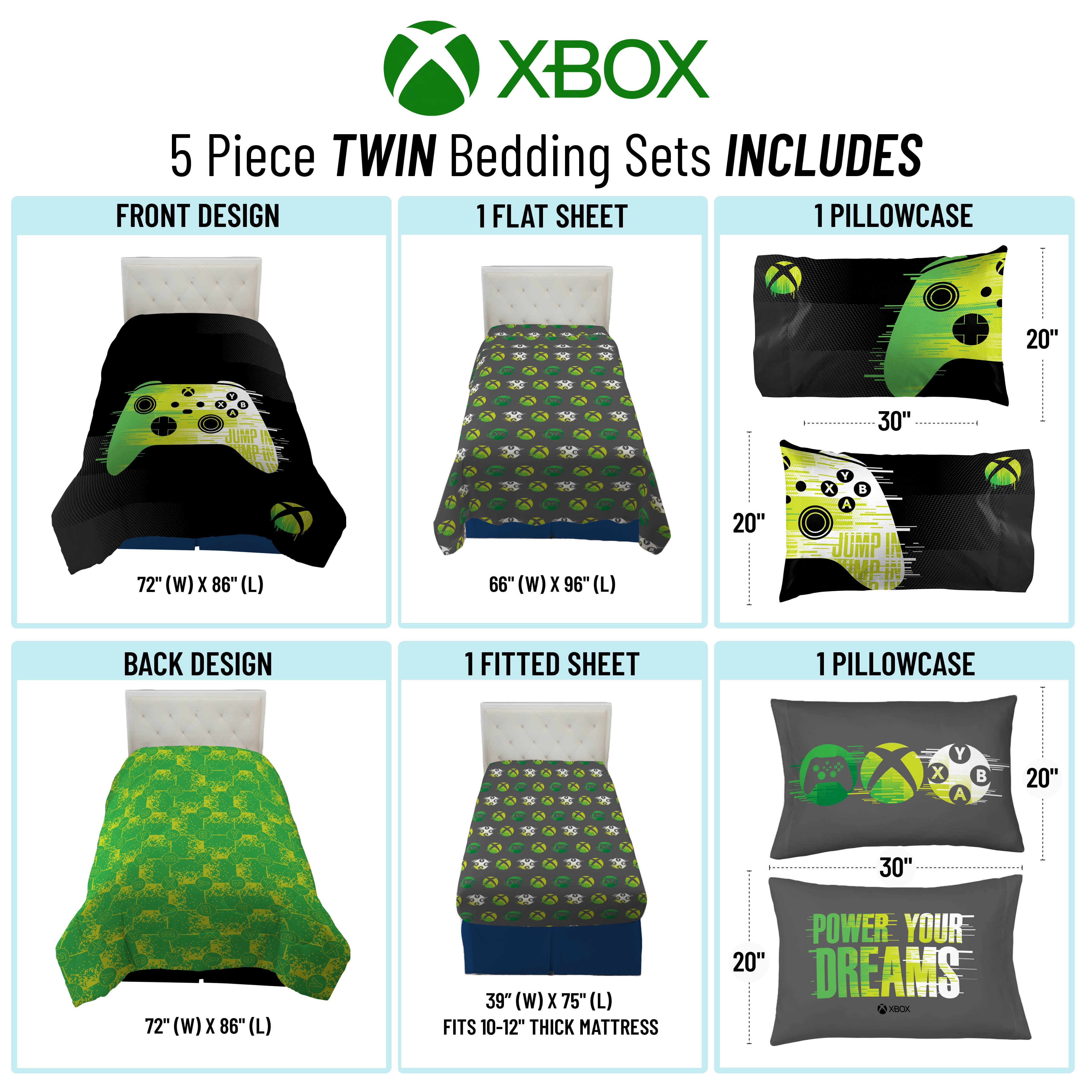 Unleash your inner gamer with this Xbox 5 Piece Twin Bed Set with Sham. Set includes a comforter, one sham, fitted sheet, flat sheet, and one standard sized pillowcase. This bed set features an Xbox controller atop an allover printed gray sheet seet. Made from 100% Microfiber, this bed set is the perfect weight to keep you comfortable all year round. Simple care instructions include machine wash cold and tumble dry low. Complete the look by shopping our other Xbox home and bedding items, sold separately on .