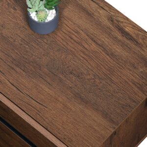 – It’s made from engineered wood and sits on a black metal base. The natural brown finish shows off the wood’s unique grain color variation as well as the exposed wood knots.