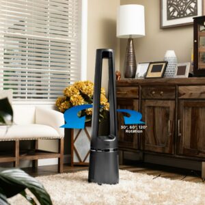 The ultimate in tranquility and comfort, the Midea Bladeless Fan provides an extremely quiet operation across all 12 speeds Sound is undetectable through the first 5! Air from the maximum speed can be felt up to 25 feet away for convenience in a large room. An oscillation function promotes customized airflow as it can be set for stationary use, or 30-, 60, and 120-degree rotations. It also cleanses the atmosphere your family breathes through plasma ion technology and HEPA filters, which meet stringent California certification standards.