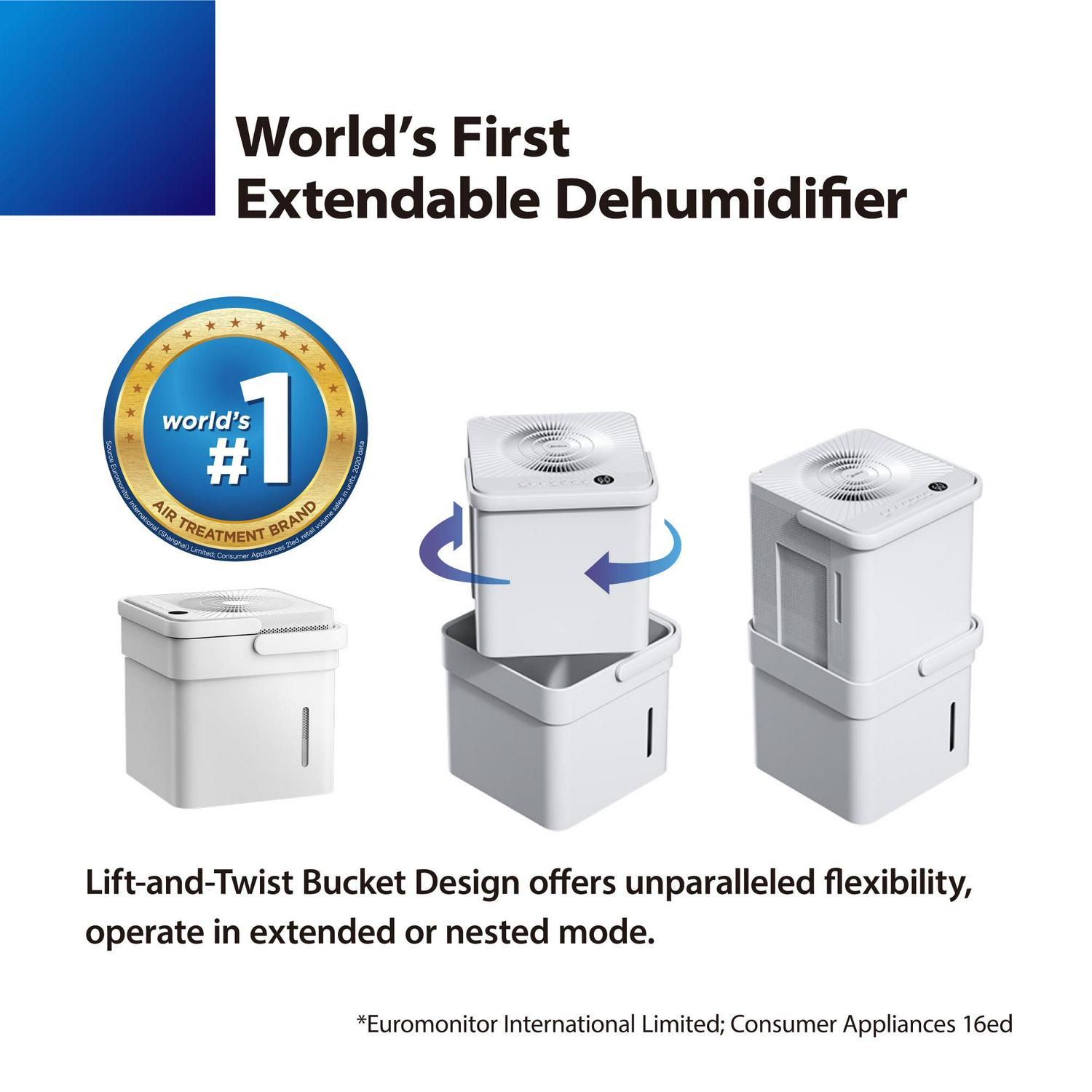 The Midea Cube dehumidifier has a unique lift-and-twist design that offers unparalleled flexibility: when operating in extended form, it has up to 3 times more water tank capacity than traditional dehumidifiers and can run much longer without the hassle of frequently emptying the tank; when in nested or drain form, the unit is half the size allowing compact storage or flexible draining. It can fit into any room and maintain the desired humidity level in your home. The patented sensor and wi-fi enabled app allow you to monitor the humidity and water level, all at your fingertips. With multi-directional air intake and up to three different fan speeds, it is powerful enough to dehumidify your room, and quiet enough that you’ll forget it’s even there.