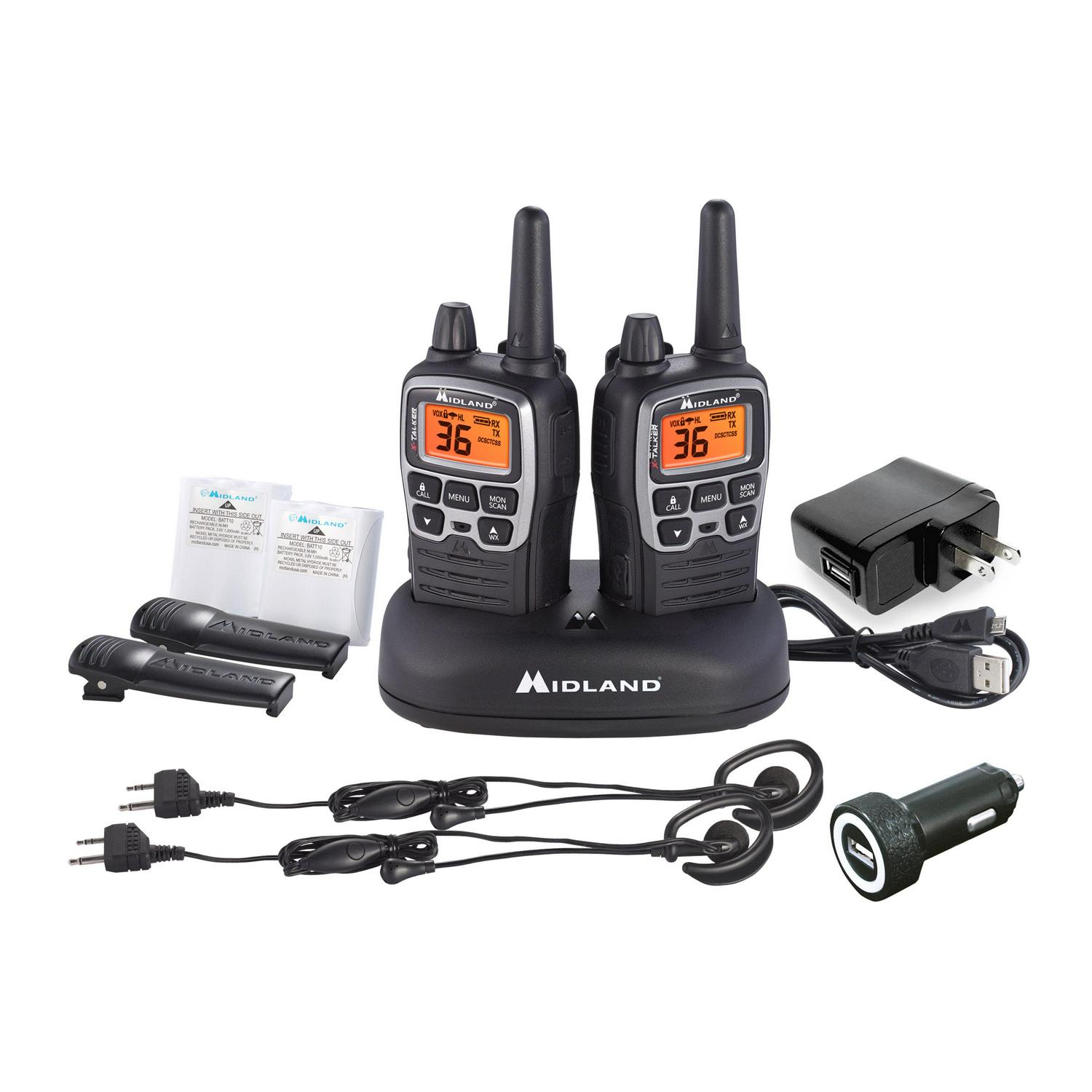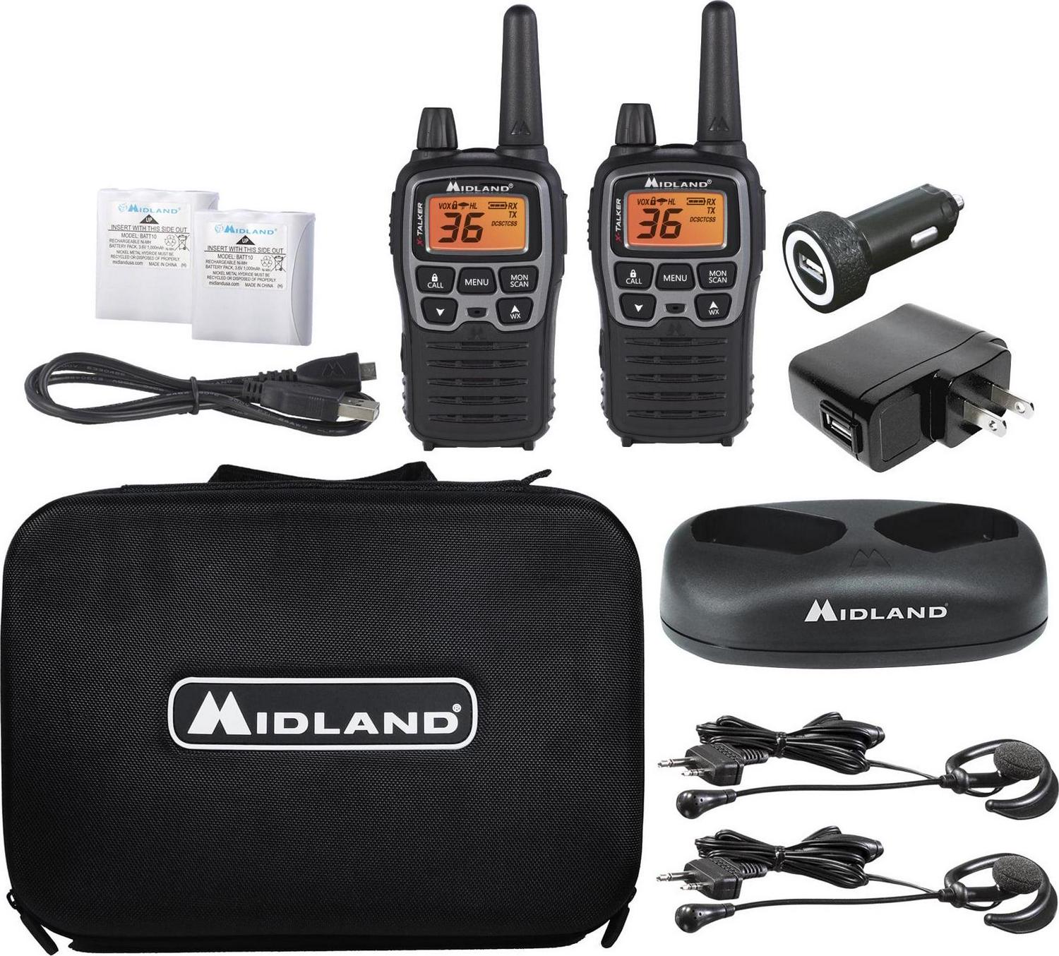 Gear up for your adventure with the fully loaded T77VP5 Extreme Dual Pack. Complete with six of Midland s most popular FRS accessories in a soft-shell carrying case. The Extreme Dual Pack comes equipped with a pair of X-Talker T71 FRS walkie talkies featuring communication range of up to 38 miles, 22 channels plus 14 extra pre-programmed privacy code channels, Midland s signature Weather Scan + Alert Technology, NOAA Weather Scan will automatically scan through 10 available weather (WX) band channels and will lock onto the strongest weather channel to alert you of severe weather updates. NOAA Weather Alert will sound an alarm indicating that there is a risk of severe weather in your area, hands free communication, 121 Privacy codes, and silent operation.