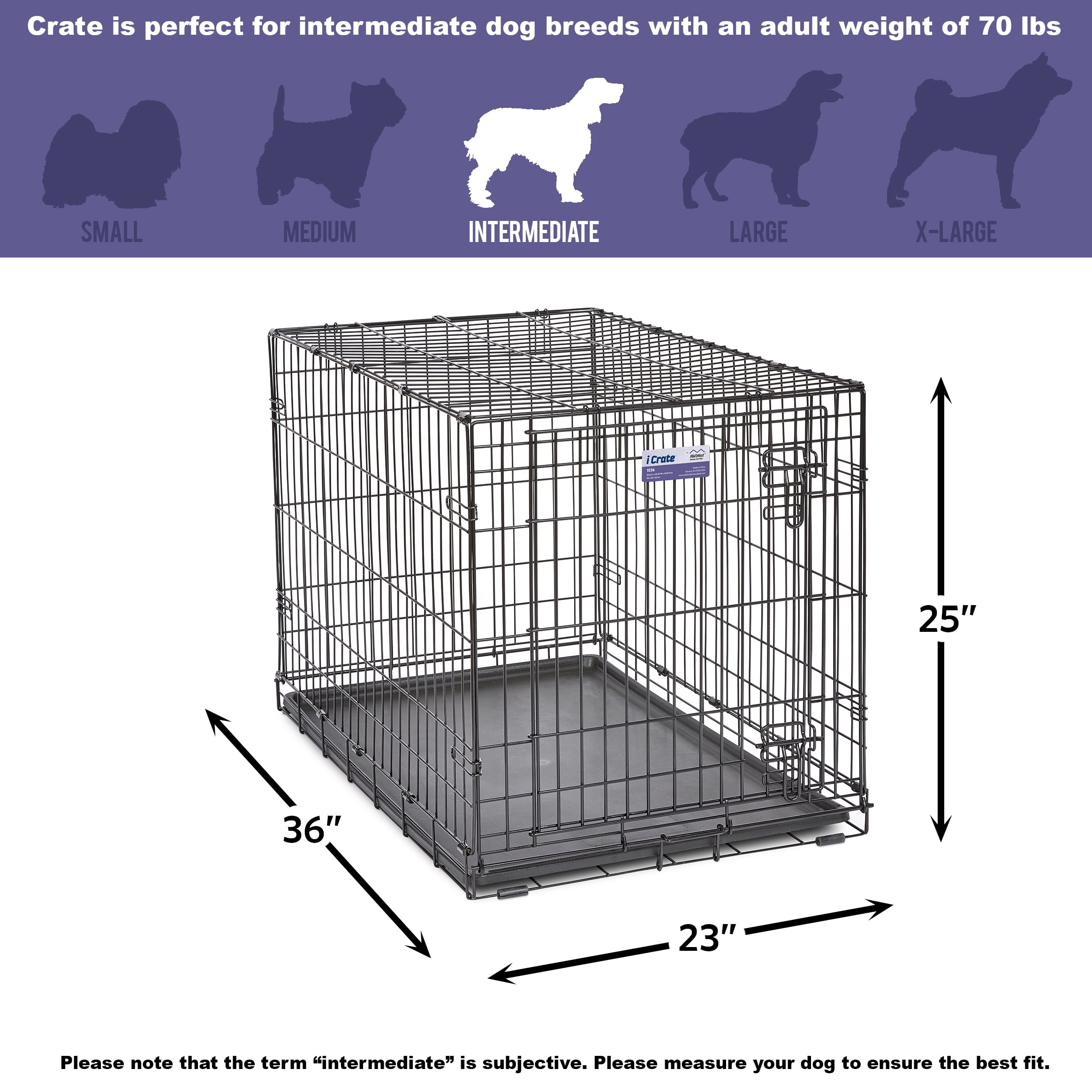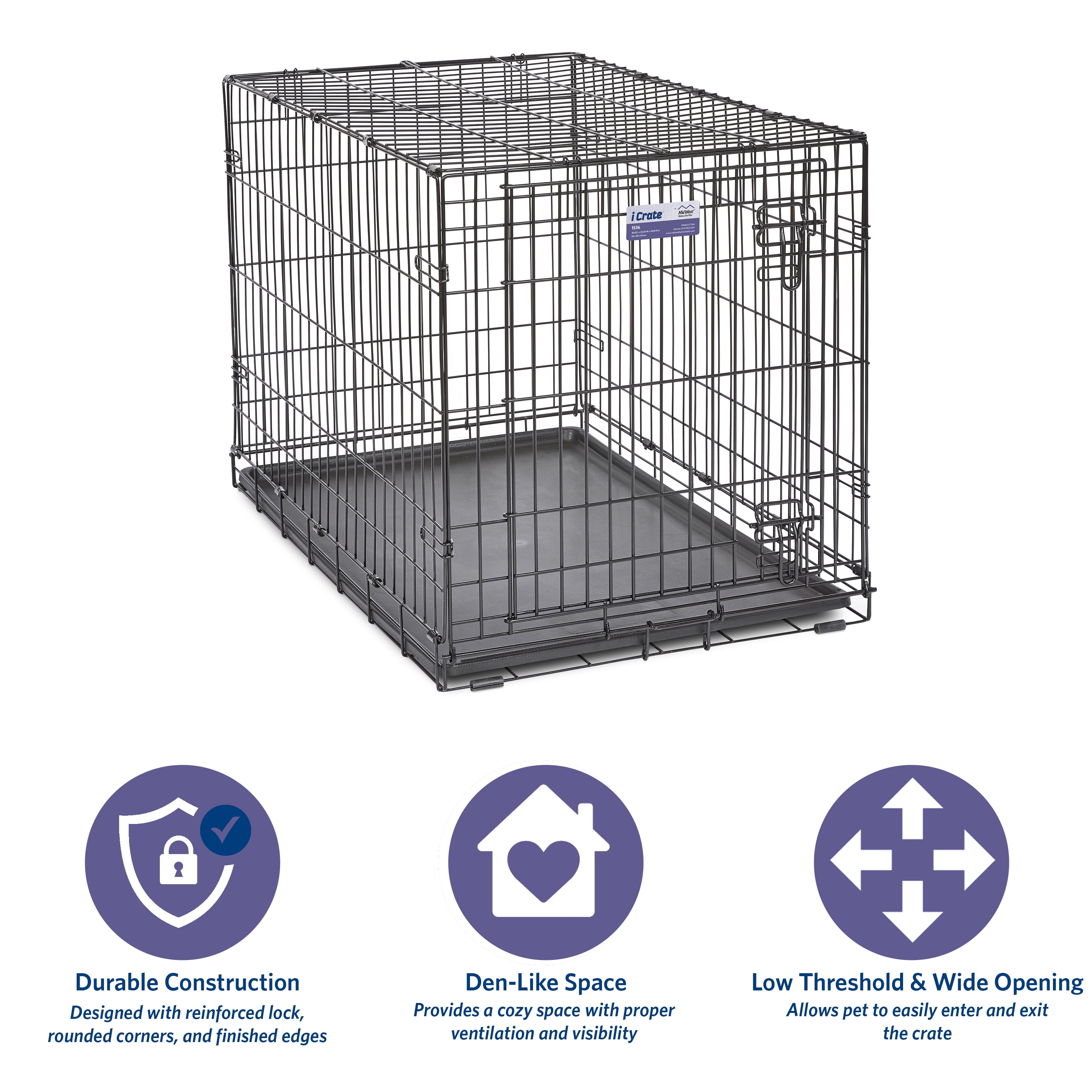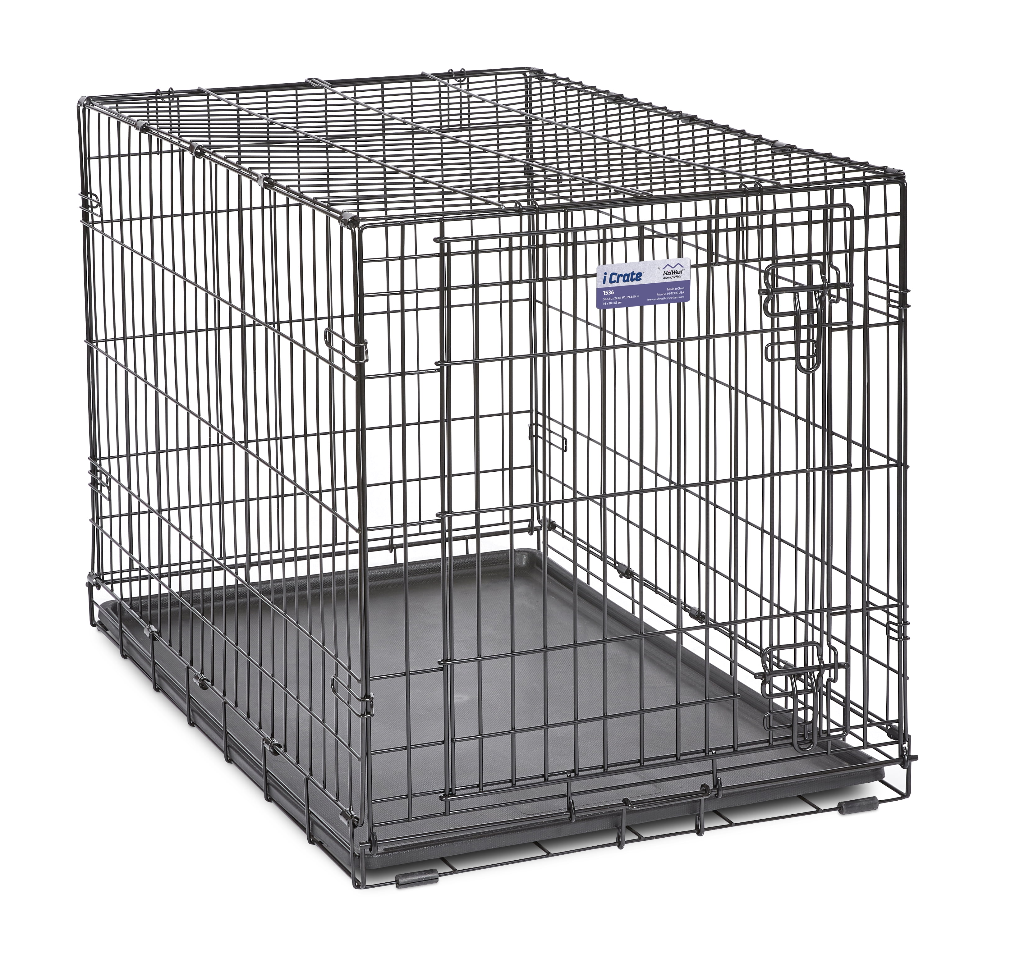 Midwest 36″ iCrate Dog Crate: Easily sets up and folds down to portable size – no tools required Durable, satin black electro-coat finish Safe and secure slide bolt latches Tough, easy to clean plastic pan Includes free divider panel, allows you to adjust length of living area as your puppy grows into its adult size home Available in seven sizes, from 18″ long to 48″ long
