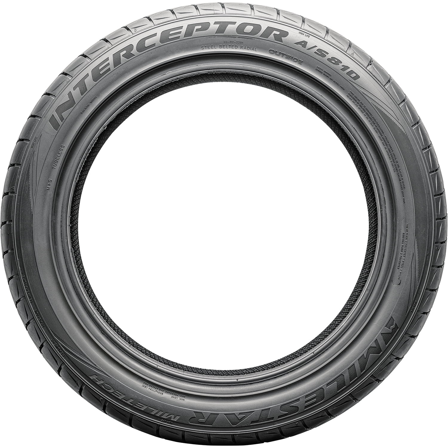Milestar Interceptor A/S 810 OVERVIEW The Milestar Interceptor A/S 810 is a high performance, all season tire made for passenger vehicles and SUVs. Milestar offers a 50,000 mile treadwear warranty with this tire. The ideal tread design also increases the overall controllability. The asymmetric tread design’s optimized surface contact upgrades steering responsiveness and driving stability. The better road contact maintains surface contact during the drive, which increases the steering response time and accuracy to the driver’s commands. On the other hand, it also improves the structural stability throughout the drive. The ideal shoulder block placement provides additional biting edges, which improves cornering and maneuvering. These elements ensure a safe driving experience. High speed performance is also guaranteed. The optimized tread design works with the durable compound, in order to ease pressure off the footprint. This effectively avoids pressure and heat accumulation along the tread area. As a result, the tire can safely perform at its utmost high speed capability, promoting a secure driving experience. Better dry, wet, and winter grip is guaranteed with this model. The dry, wet, and winter grip is boosted due to the detailed tread design and the strong all season compound. The siping and optimal block pattern boosts the grip with the use of additional biting edges. Additionally, the compound maintains the rubber flexibility in versatile temperatures. These factors enhance the tire’s summer and winter-weather performance. The groove placement avoids hydroplaning, by dispersing water and slush from the footprint. The Milestar Interceptor A/S 810 guarantees a quiet drive. The optimal tread design channels airwaves through the footprint, making sure they do not come into contact with the tread elements. As a result, the tire avoids sound wave formations. The tire prevents sound waves from reaching the passengers and ruining their driving enjoyment. Better comfort levels promote a quiet driving experience. Manufacturers recommend changing tires every 10 years. As long as tires are properly stored before they are sold, the year of their manufacture will not shorten their service life.