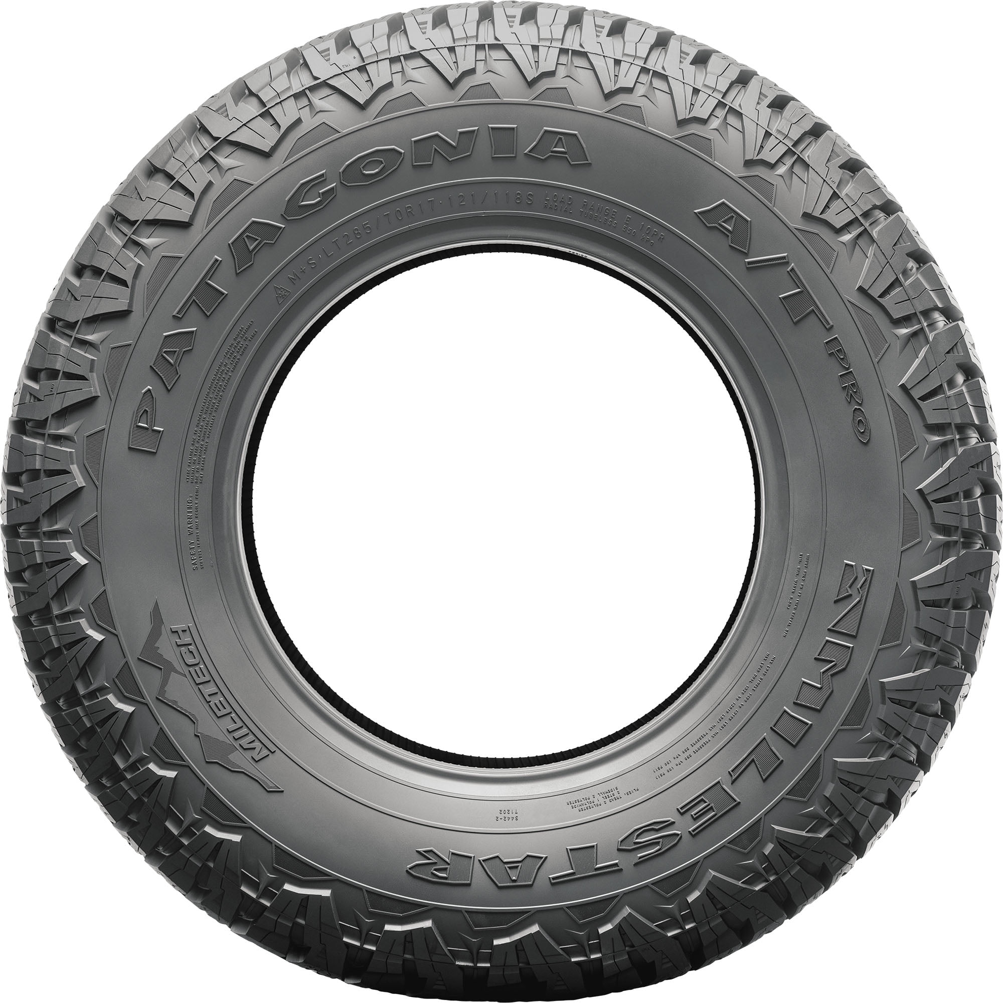 Milestar Patagonia A/T Pro LT285/70R17 121/118S E OVERVIEW The Milestar Patagonia A/T Pro is an all-terrain tire that’s designed for use on light trucks. With an aggressive tread pattern and wide contact patch, the Patagonia A/T Pro provides off-road traction and comfort. In addition, the Patagonia A/T Pro is engineered with Milestar’s MILETECH advanced sidewall compound technology that increases strength and impact protection.