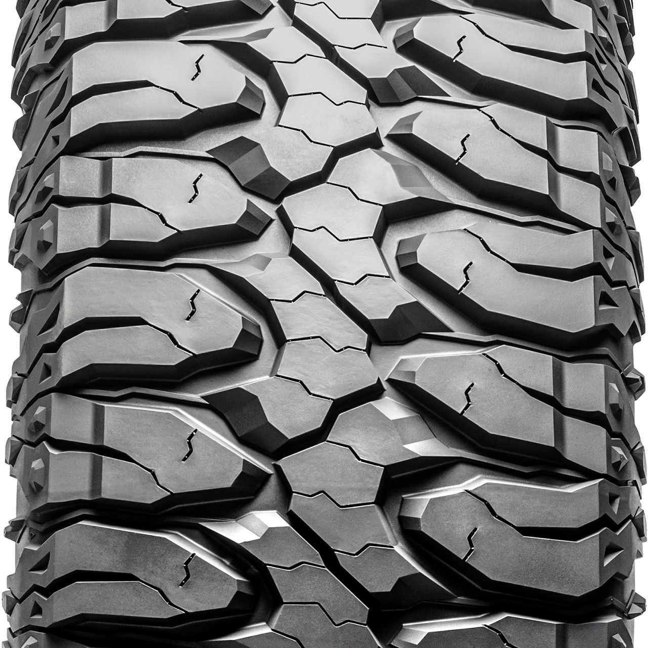 The optimal tread pattern and the strong rubber compound improve mud terrain performance. This tread design can closely follow soft, loose, and uneven terrain surfaces. It can firmly grip the surface with extra biting edges, keeping forward motion at all times. At the same time, this tread eliminates mud, snow, and rocks stuck between the tread elements, upgrading surface contact. This also protects the tire from stone retention and offers a safe mud terrain ride.