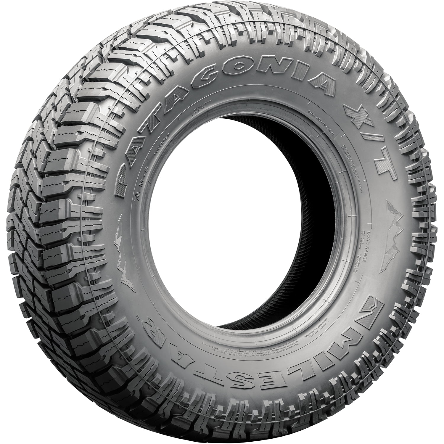 Milestar Patagonia X/T OVERVIEW The Milestar Patagonia X/T is an extreme terrain, all weather tire manufactured for SUVs and light trucks. Milestar offers a 40,000 mile treadwear warranty with this model. The model’s tread design features large, staggered tread elements, which upgrade its extreme terrain traction. This rugged tread design upgrades the soft, loose and uneven terrain grip. The tread blocks and the upper sidewall pattern improve the deep mud and loose dirt performance as well. These tread elements increase the number of biting edges gripping the terrain surface to ensure a secure performing capability. The tread’s wide grooves and staggered blocks keep the footprint clean. They eliminate mud and snow from between the tread elements to prevent them from blocking the tire’s contact with the terrain surface. They also avoid stone retention by ejecting rocks from the footprint. This, combined with the durable compound enhances the tire’s damage resistance and driving safety. The rugged tread design manages to improve the tire’s controllability. These tread elements stabilize the tire’s contact with the terrain surface. This maintained road contact upgrades the steering responsiveness and the driving stability significantly. The steering becomes faster and more precise in its response to the driver’s commands, while the structure is stabilized against the driving pressure affecting the model. The tire’s reinforced sidewall and tread construction keeps the ideal tire shape under the load and driving pressure affecting the model. This enables the tire to upgrade the load carrying capability and power, increasing its load capacity greatly. The Patagonia X/T provides excellent all weather traction. The tread design and all weather tire compound upgrade the dry, wet and winter weather road gripping capability. The tread’s siping detail and staggered blocks heighten the number of biting edges that grip the terrain and road surface, while the compound keeps the rubber flexibility in various weather. The circumferential and lateral grooves disperse water and slush from below the footprint, during the tire’s on-road performance. This further improves the wet and winter weather traction and boost the year round driving security. All weather tires receive the three mountain peak and snowflake (3PMS) symbol for their exceptional winter weather performance. They are all season tires with extra winter weather grip, in order to guarantee safer year-round durability. This ensures their true and secure driving ability throughout the year. Extreme Terrain tire types are not designed for regular highway driving. They are primarily designed for off-road applications. Not all tire sizes are suitable for all vehicle types. Please refer to the item specifications for accurate information about vehicle type fitment for this particular size. Manufacturers recommend changing tires every 10 years. As long as tires are properly stored before they are sold, the year of their manufacture will not shorten their service life.