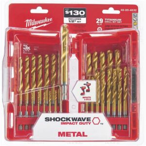Milwaukee 29 Piece SHOCKWAVE RED HELIX Titanium Drill Bit Set 48-89-4632 Description:The MILWAUKEE 29 Piece SHOCKWAVE RED HELIX Titanium Drill Bit Set is engineered for extreme durability and long life. The QUAD EDGE tip delivers a precision start and four cutting edges to create smaller chips for faster removal and less heat leading to longer bit life. Designed with a Variable Helix that includes an aggressive 35° helical angle, which ends at 15°, these tapered drill bits with RED HELIX provide rapid chip removal limiting heat buildup to stay sharper longer.