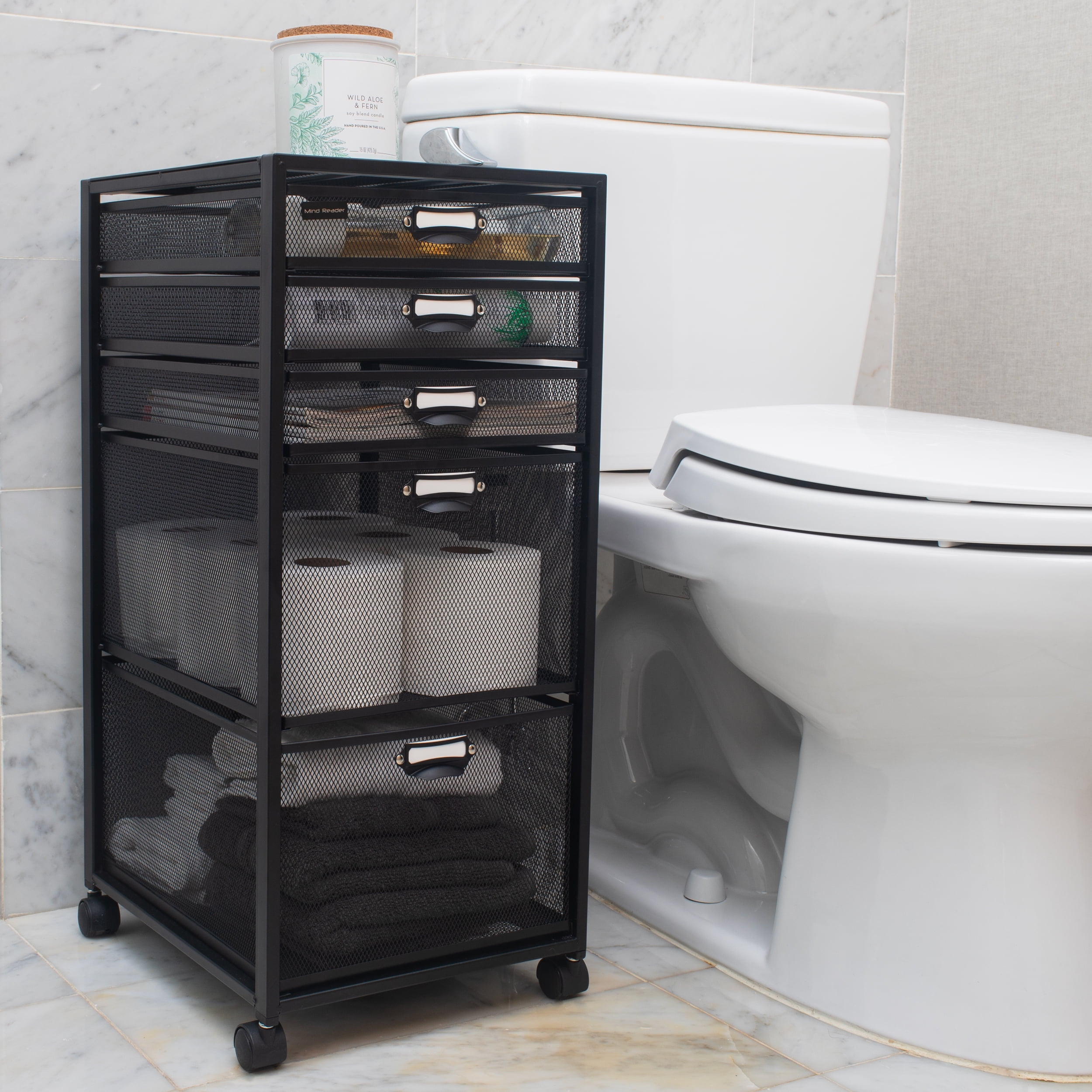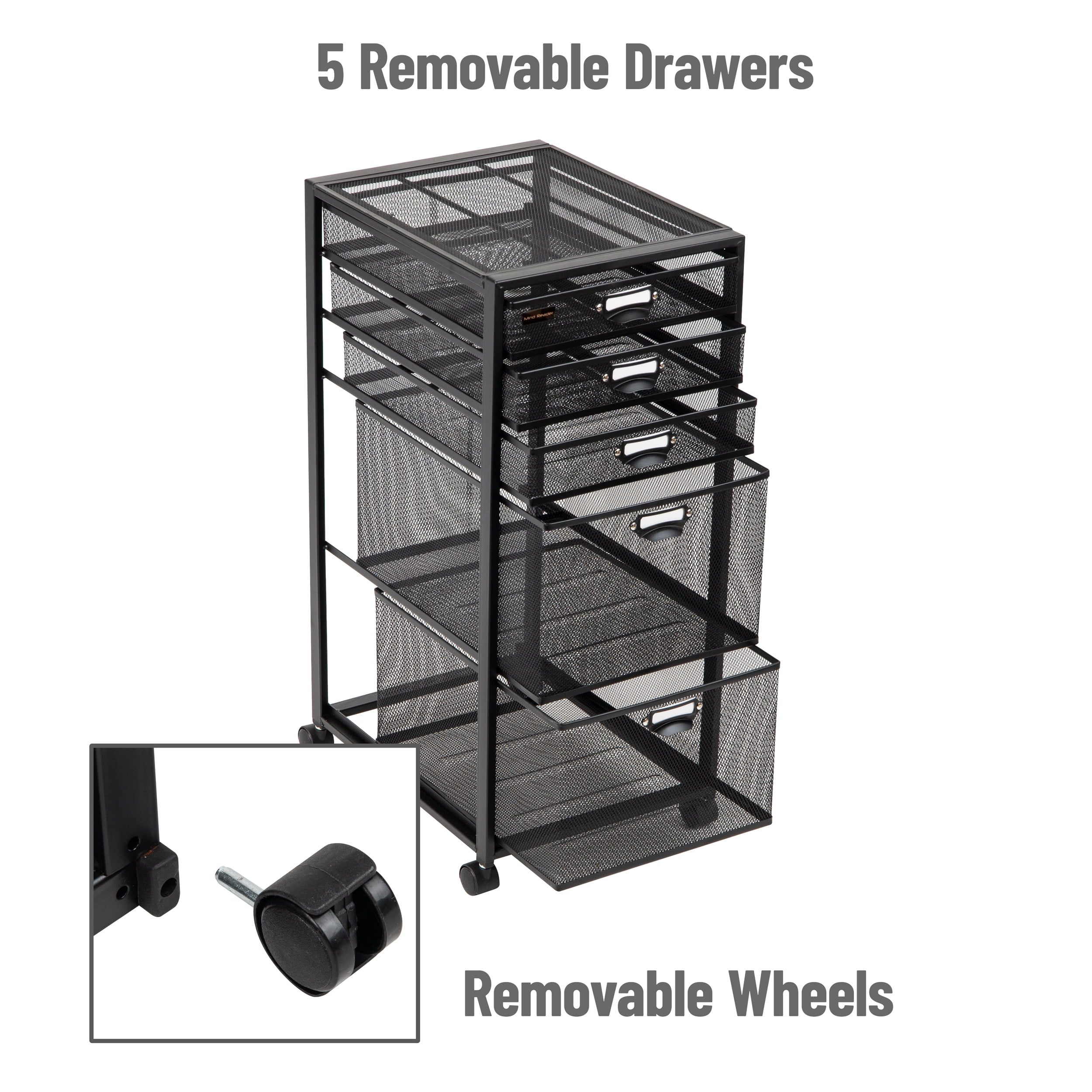 Versatile & Portable Rolling Storage Cart – Convenient Organization for Any Space This lightweight storage solution is perfect for decluttering and organizing a wide range of items, from office supplies and pantry items to clothing and toiletries. Featuring five removable drawers, this cart offers ample storage space to accommodate various-sized items, from small notepads and note cards to crafts and accessories. The completely removable drawers provide easy access to your belongings whenever you need them. Each drawer has a bracket to hold a white card (included) allowing you to label what each drawer is for. The cart arrives assembled except for the four wheels which easily push into place. The omnidirectional wheels allow you to effortlessly move the cart from room to room as your needs change. The wheel locks ensure stability and safety when the cart is stationary, keeping your items securely in place. The see-through mesh design of this vertical storage solution makes it easy to locate and organize multiple items. With its seamless black color, the cart also serves as a stylish home décor element. Ideal for any home or office, our storage cart makes a thoughtful gift for graduations, housewarming parties, holidays, and other special occasions.