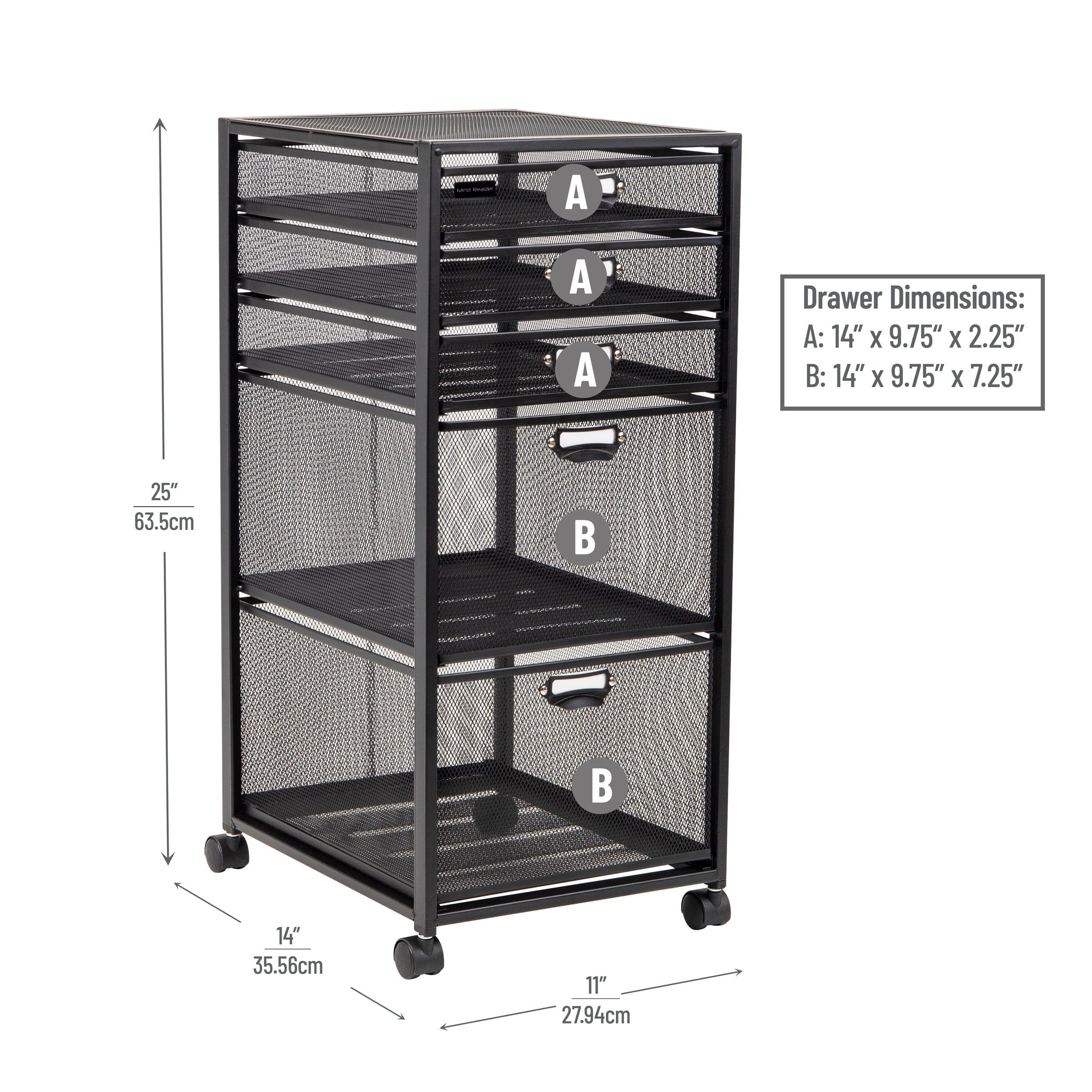 Stylish and Versatile Design: The black mesh design of this rolling storage cart boasts a sleek, minimalistic look that can blend effortlessly with any decor, making it suitable for any room in the home or office Multipurpose Organization: Whether you need it for your home, home office, office, dormitory, or any place that requires an effective storage solution, this cart provides ample organization for any room Transparent and Sturdy Construction: The metal mesh construction ensures easy visibility of the items inside the cart, while the sturdy material is designed for daily use and can hold up well to the rigors of everyday life Easy to Maintain: Made with steel, this rolling cart is both durable and easy to maintain, allowing for hassle-free cleaning with mild soap and water Dimensions: This rolling file cabinet measures 11 long x 14 wide x 25 inches tall (27.94 x 35.56 x 63.5 centimeters) and weighs 9.95 lbs (4.51 kgs), this portable storage cart is the perfect size for maximizing space without sacrificing functionality